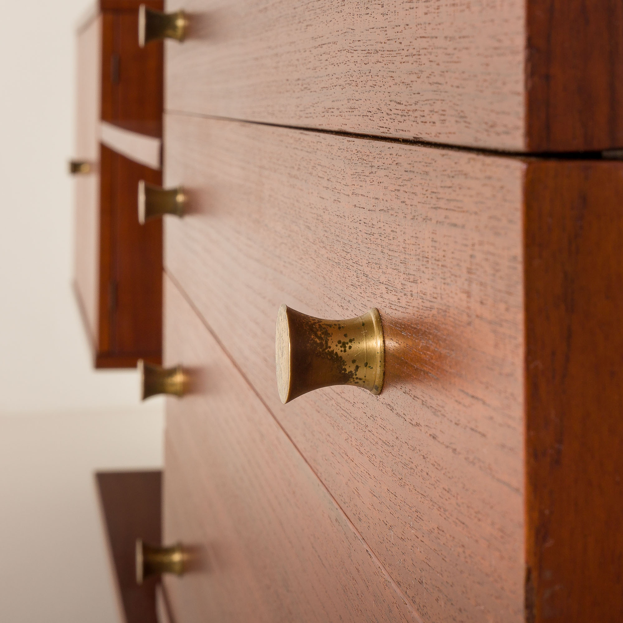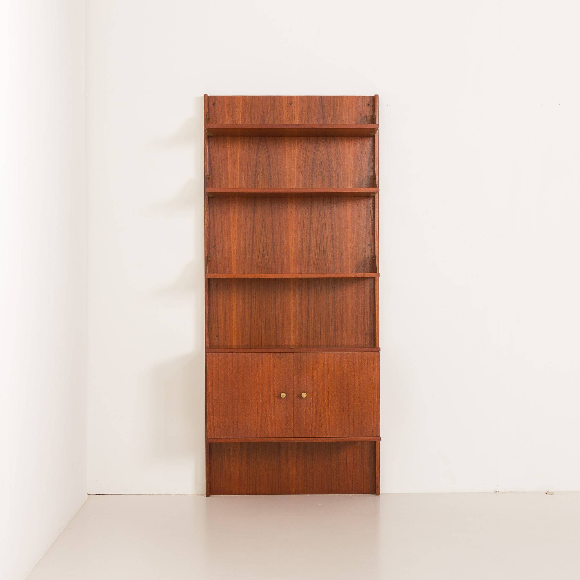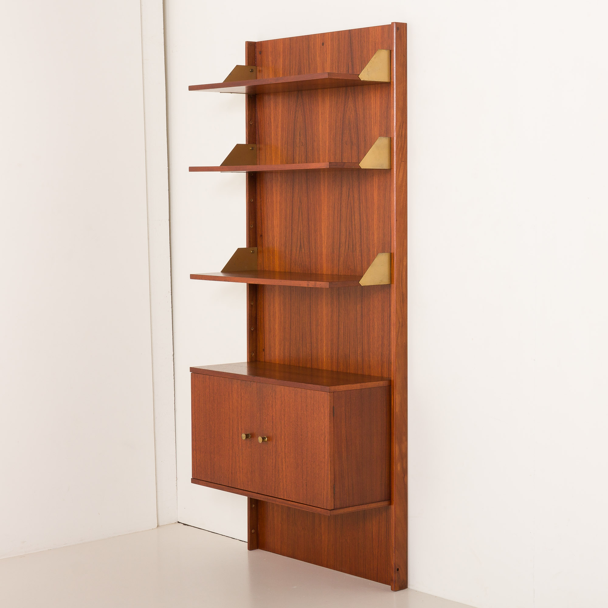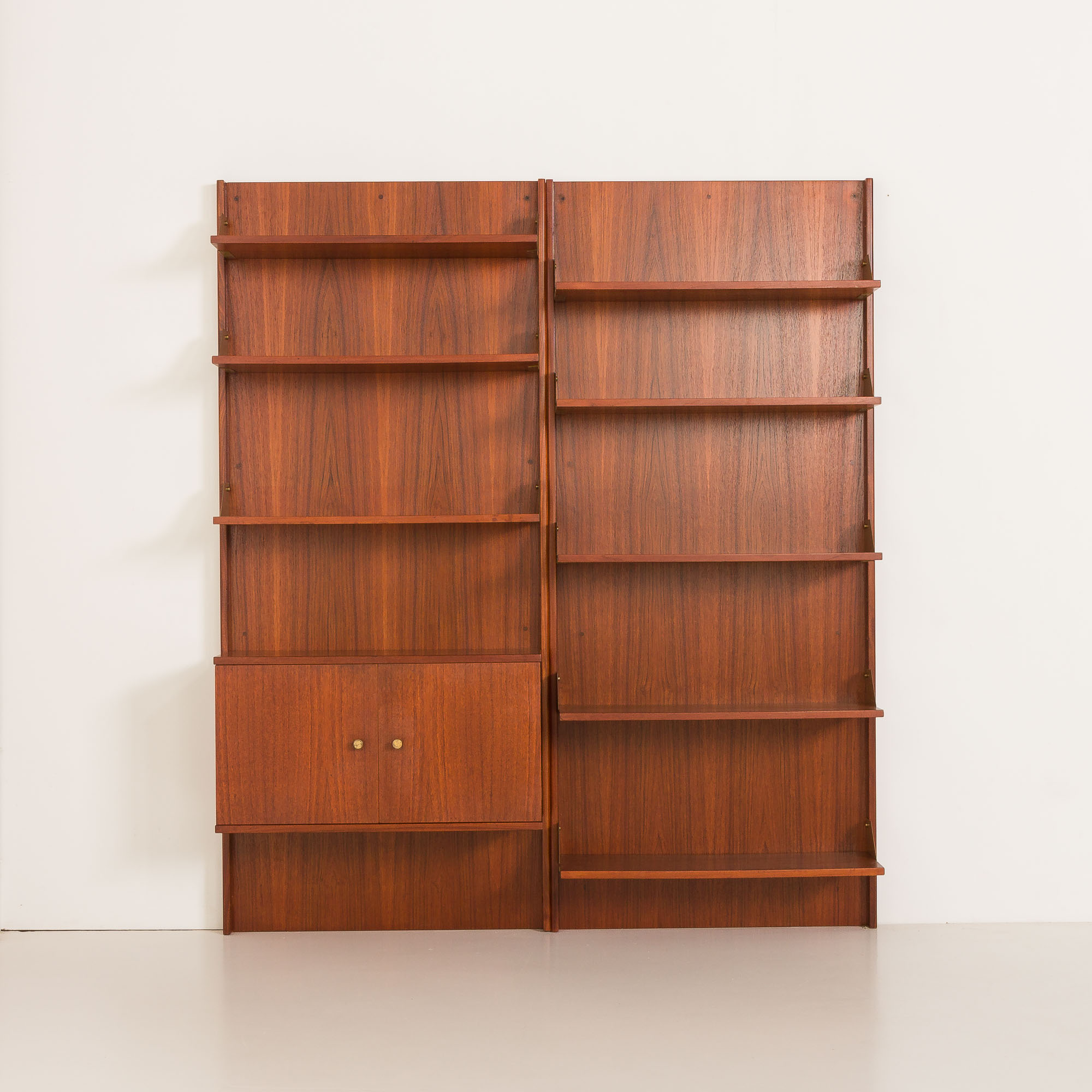 Dwie sekcje posiadają trzy półki z drewna tekowego z mosiężnymi bokami oraz szafkę poniżej – jedna z drzwiczkami na zawiasach i wewnętrzną półką, druga z czterema szufladami. Obie szafki wyposażone są w okrągłe mosiężne uchwyty, które dodają subtelnego akcentu dekoracyjnego. Trzecia sekcja składa się z pięciu otwartych półek, również wykończonych mosiężnymi bokami. Każda półka ma 31 cm głębokości, oferując dużą przestrzeń ekspozycyjną lub do przechowywania.