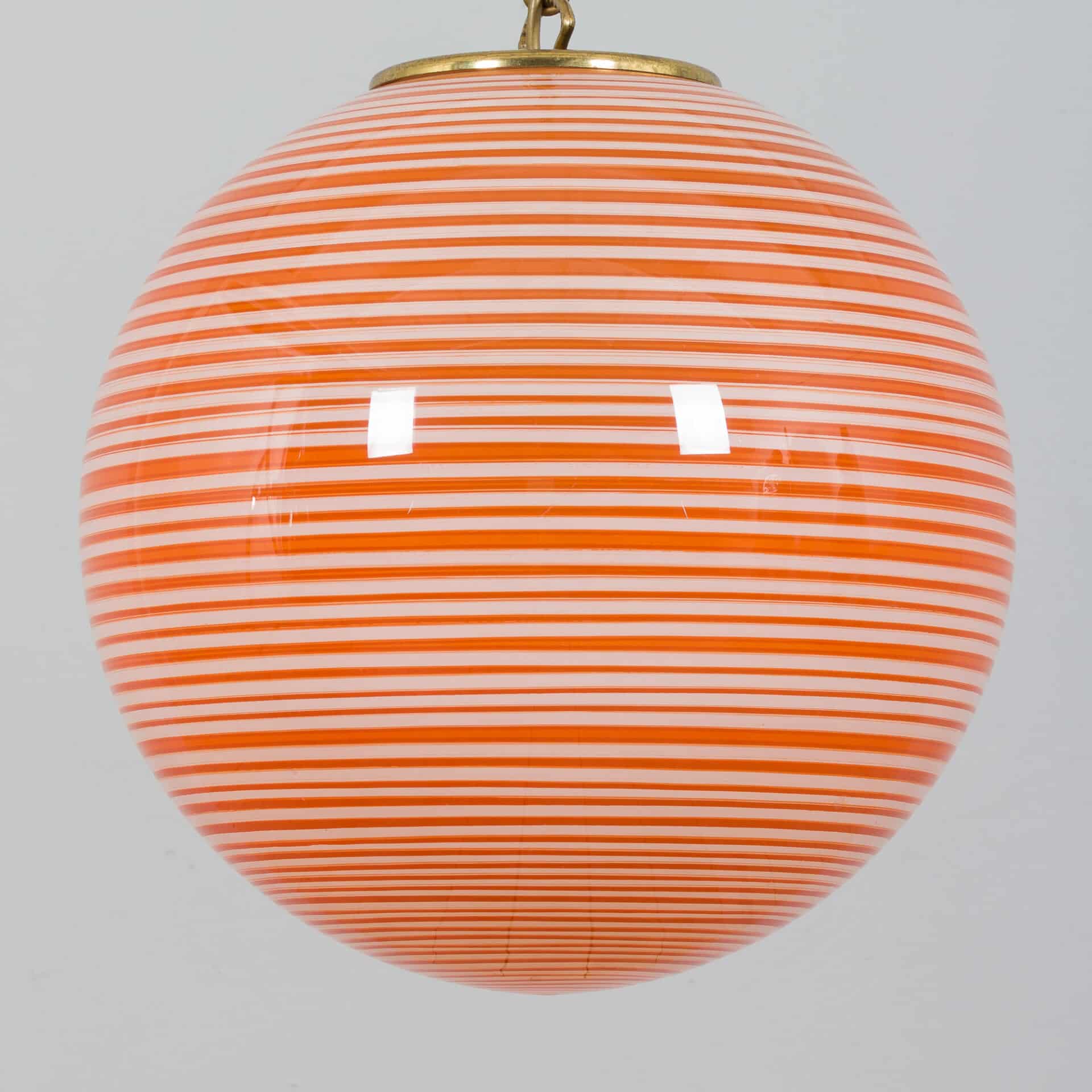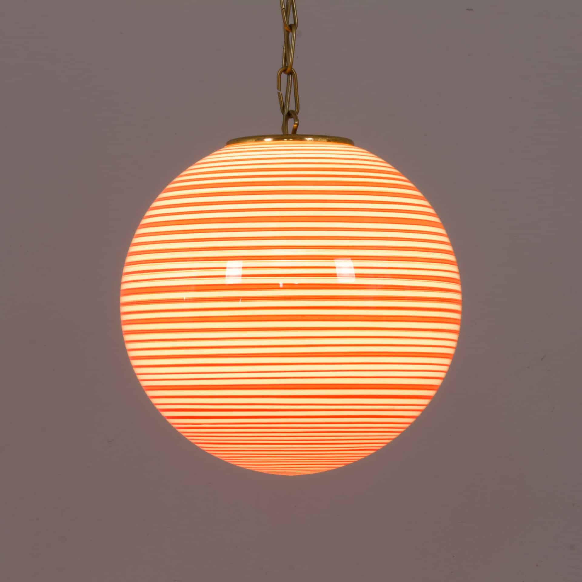 Zachwycająca duża lampa wisząca z pomarańczowo-białego szkła, datowana na lata 70-te, bardzo przypomina projekty Veniniego z tego samego okresu. Kulę wykonano z ręcznie dmuchanego szkła murano w dwóch kolorach i zawieszono na mosiężnym łańcuchu. Ciekawy wzór, wirujące wstęgi i intensywny kolor zapewniają niepowtarzalny charakter i ocieplą każde wnętrze. To eleganckie oświetlenie będzie idealnie pasować do każdego salonu lub przedpokoju.