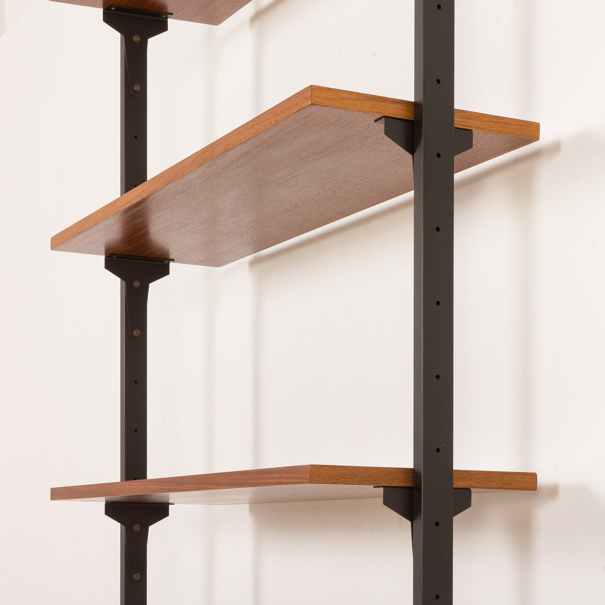 Zestaw składa się z 4 półek i zamykanej szafki z opuszczanym frontem, która może pełnić funkcję miejsca do pracy lub barku. Wisi na 2 metalowych szynach z regulowanymi mosiężnymi nóżkami u góry i u dołu. Prosta, kanciasta sylwetka, praktycznie pozbawiona ozdób, sprawia, że idealnie wpasuje się do każdego wnętrza. Wszystkie elementy są regulowane i wymienne. Można je ustawić niżej lub wyżej. Wszystko zależy od Ciebie. Konfiguracja na zdjęciu jest przykładowa.
