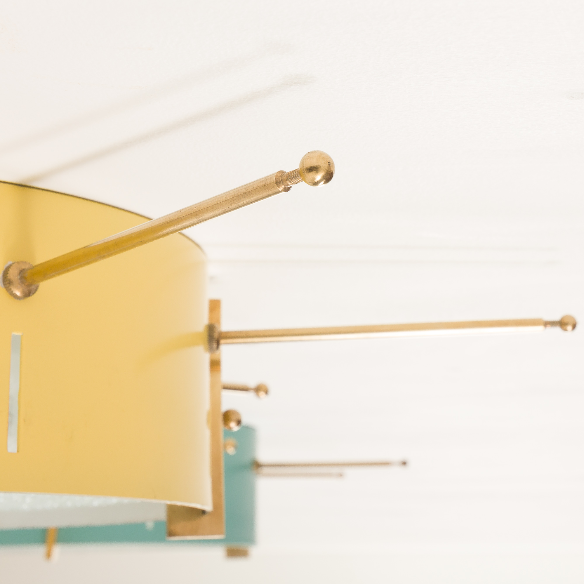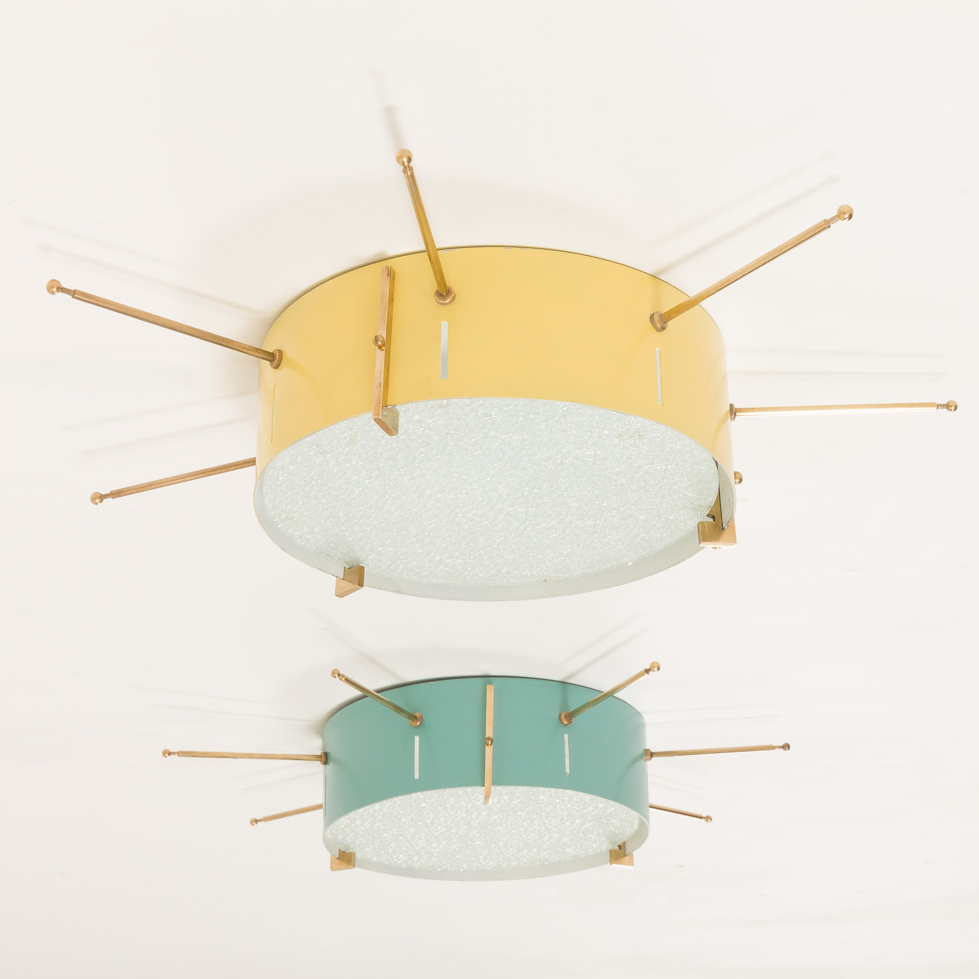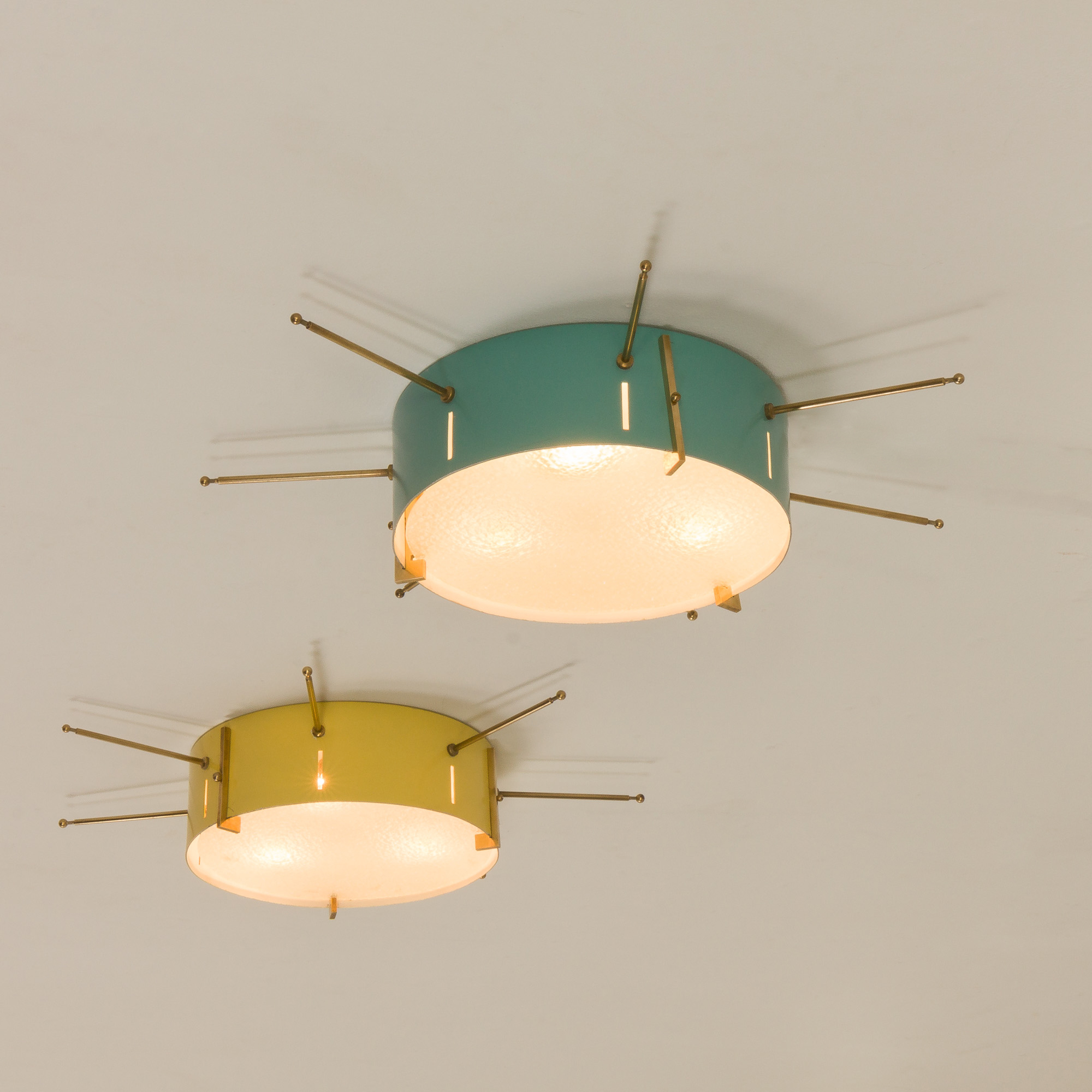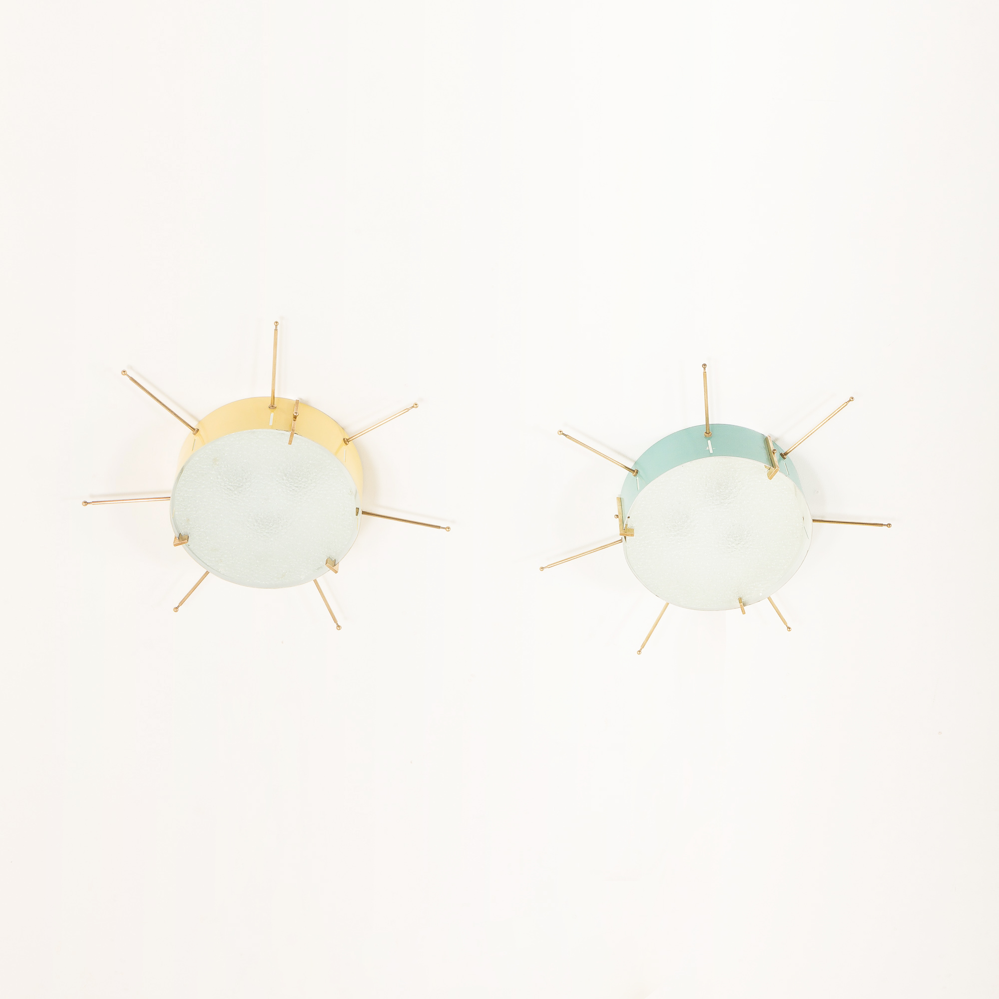 Wyjątkowa para włoskich opraw sufitowo-ściennych z lat 50., utrzymana w duchu projektów Gio Pontiego. To unikatowe połączenie odważnej geometrii i lekkiej konstrukcji. Dwa lakierowane, rzeźbiarskie korpusy — jeden w matowym turkusie, drugi w ciepłej ochrowej barwie — oplecione promienistymi mosiężnymi prętami, tworzą efektowny, niemal słoneczny układ.