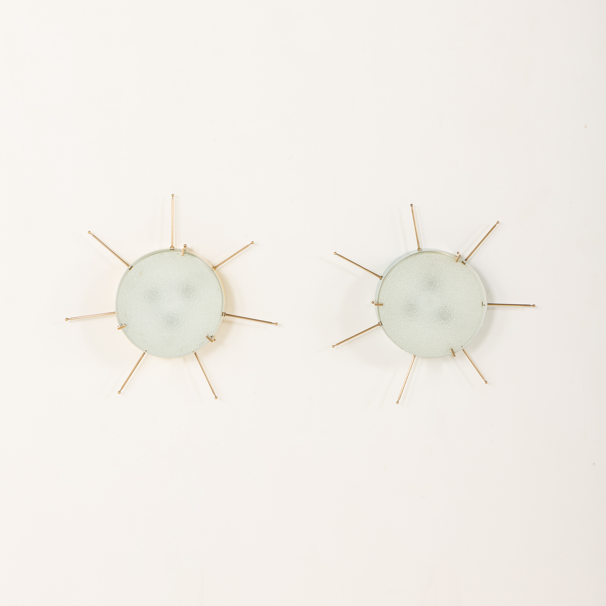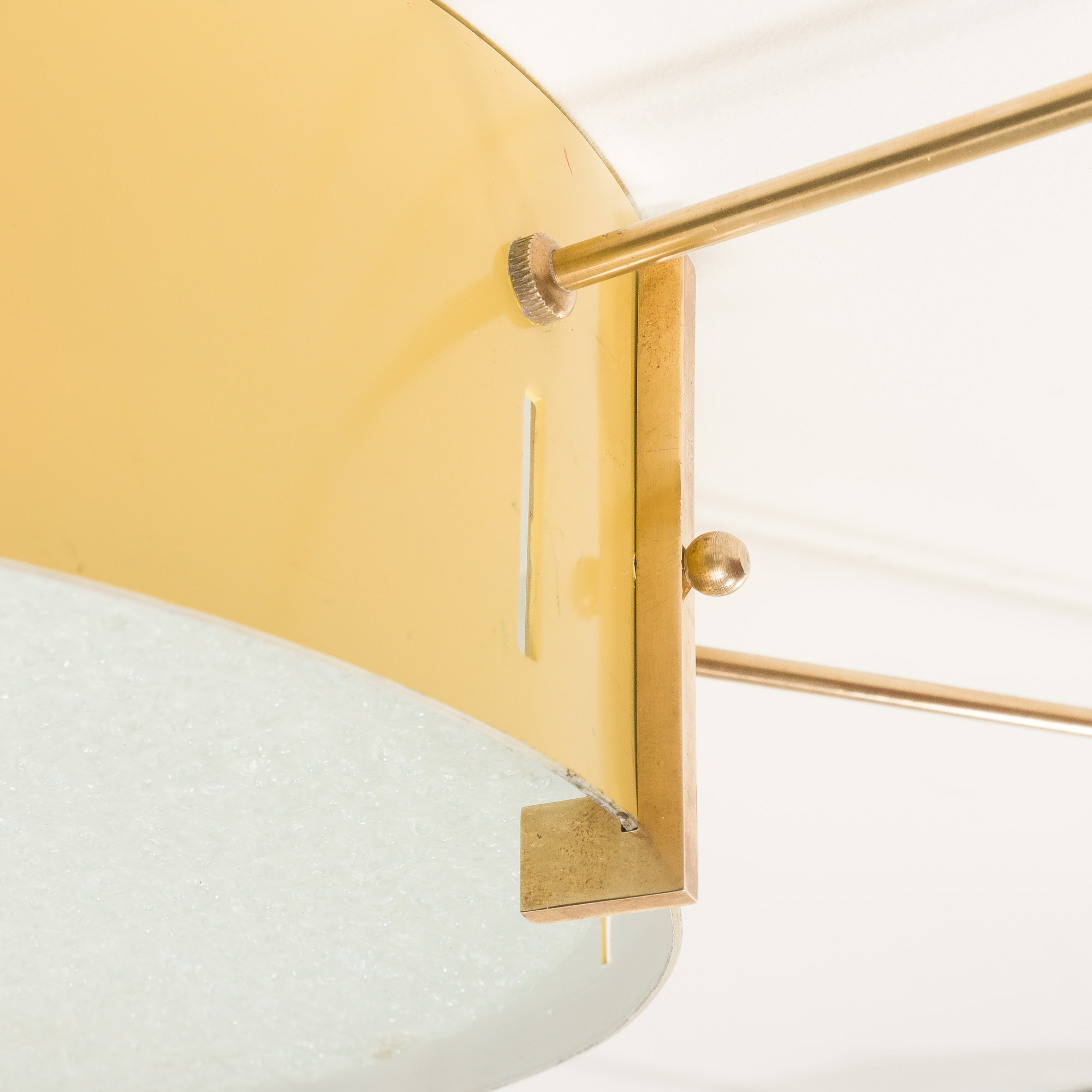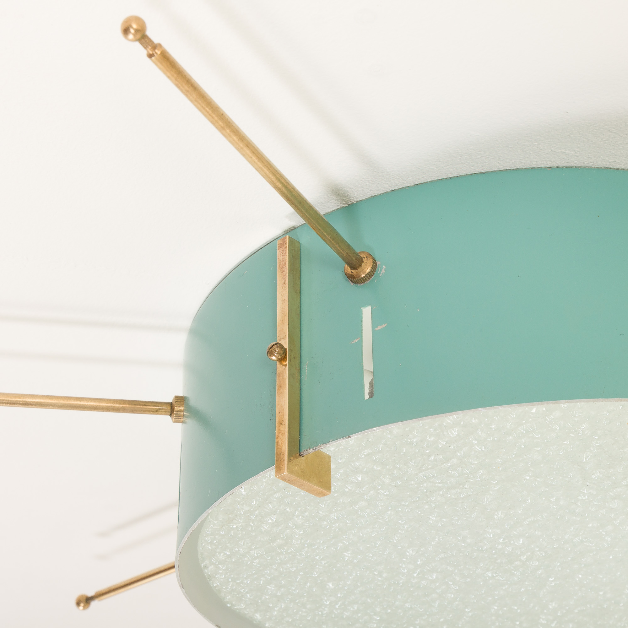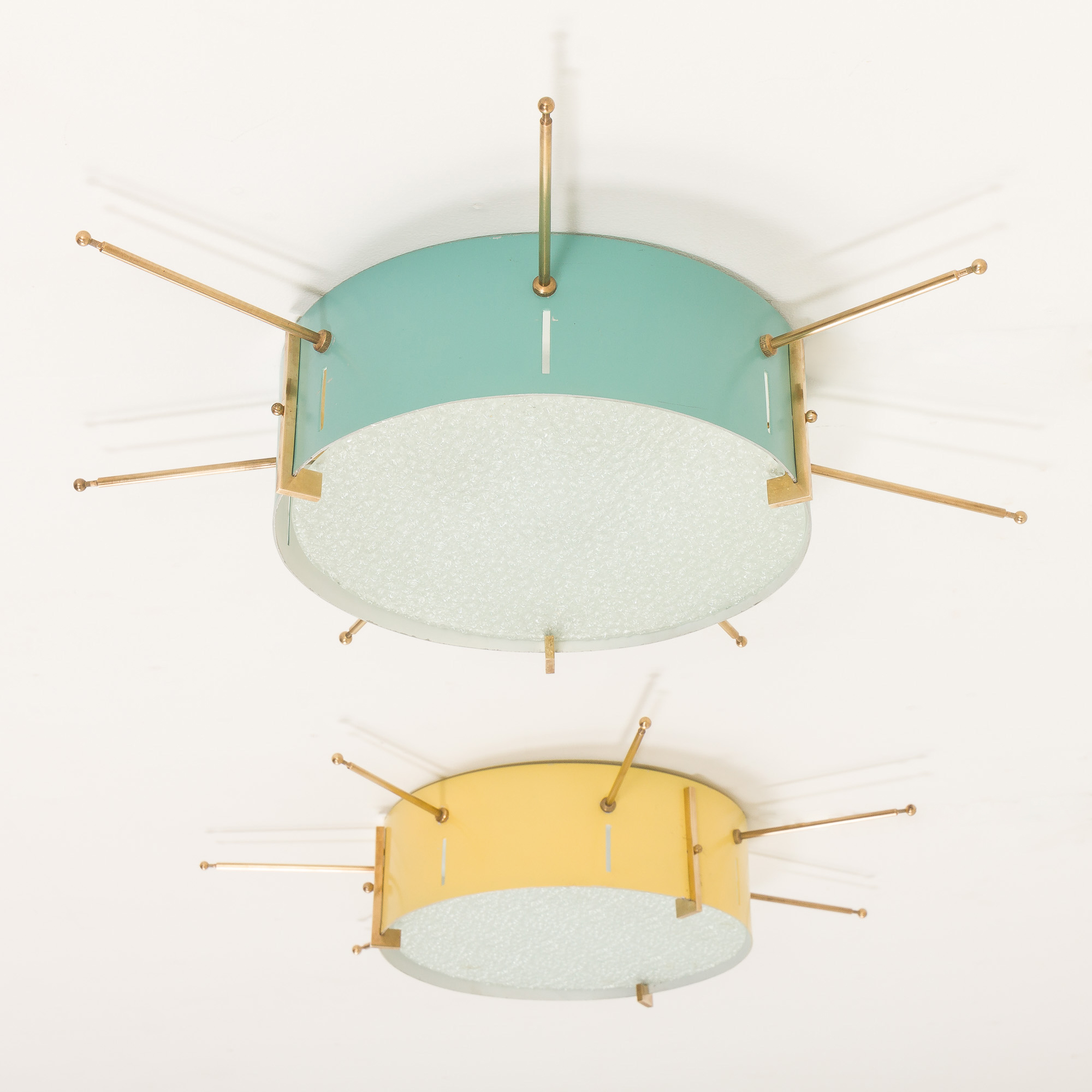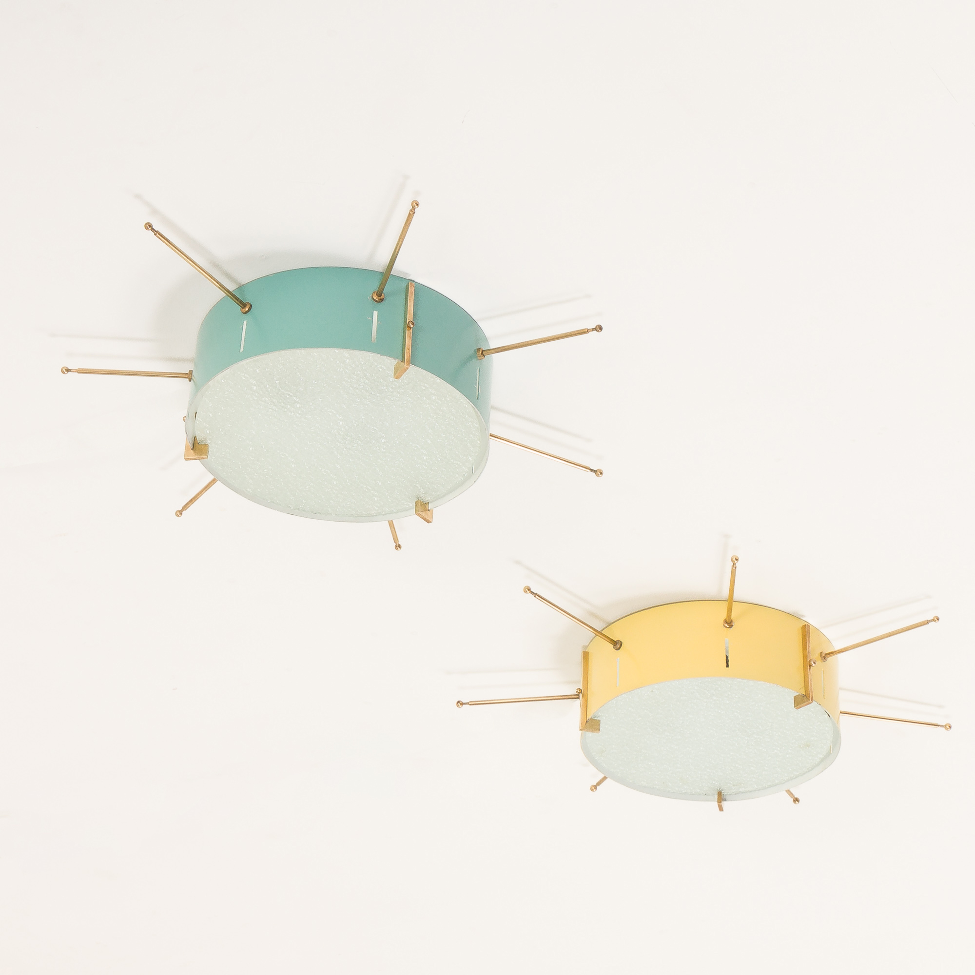 Wyjątkowa para włoskich opraw sufitowo-ściennych z lat 50., utrzymana w duchu projektów Gio Pontiego. To unikatowe połączenie odważnej geometrii i lekkiej konstrukcji. Dwa lakierowane, rzeźbiarskie korpusy — jeden w matowym turkusie, drugi w ciepłej ochrowej barwie — oplecione promienistymi mosiężnymi prętami, tworzą efektowny, niemal słoneczny układ.