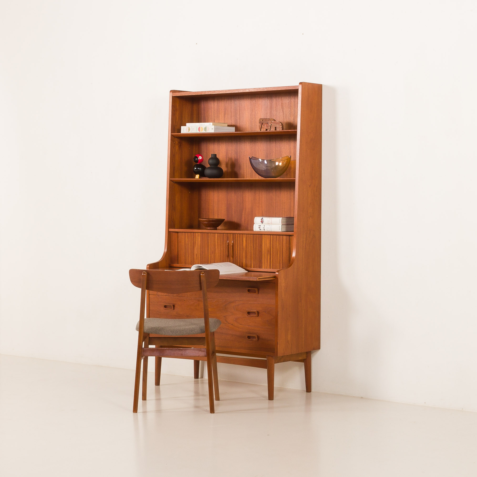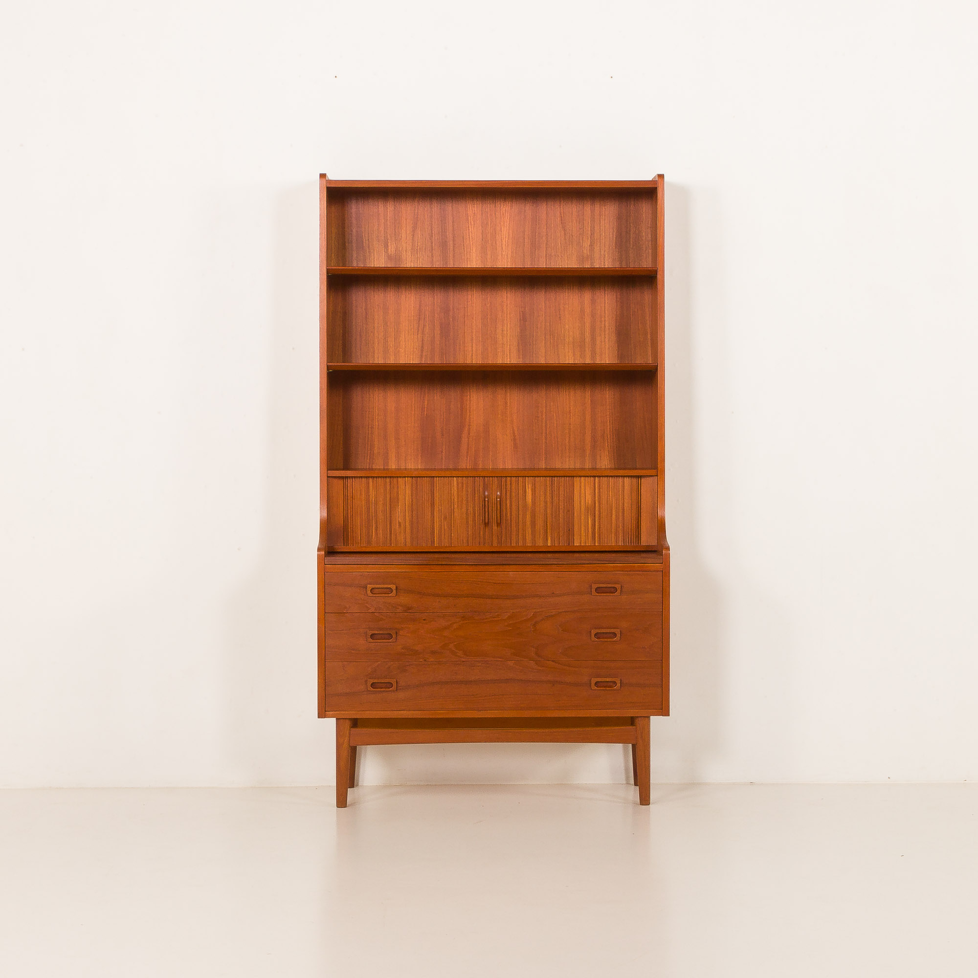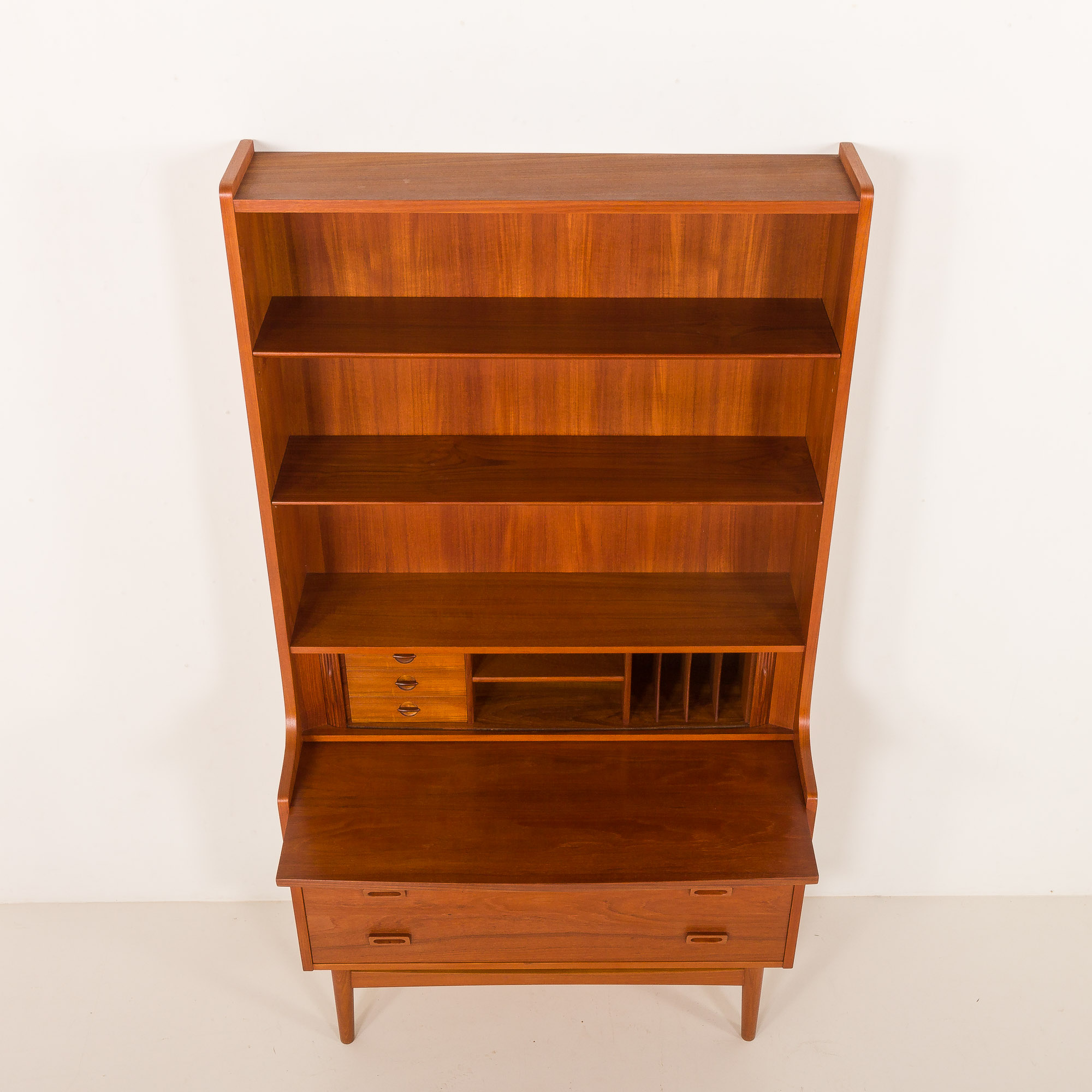 Duński regał z sekretarzykiem zaprojektowany przez Johannesa Sortha i wyprodukowany przez Nexo Møbelfabrik na Bornholmie w latach 60. Jest to wspaniały przykład wysokiej jakości duńskiego stolarstwa modernistycznego z połowy XX wieku, połączonego z elegancją i funkcjonalnością.