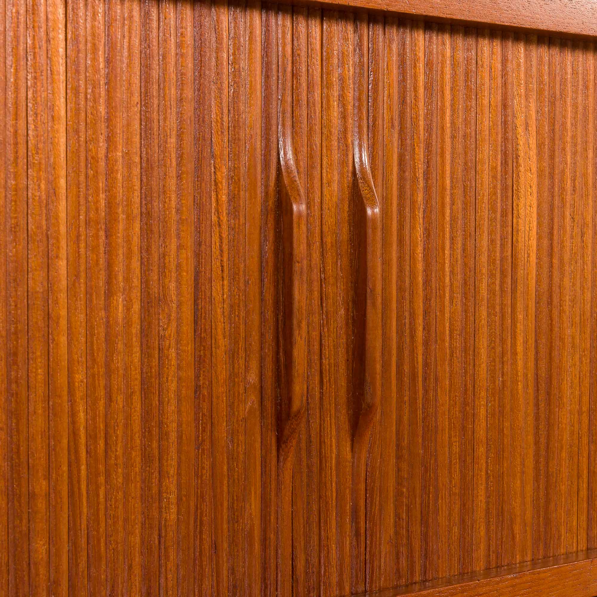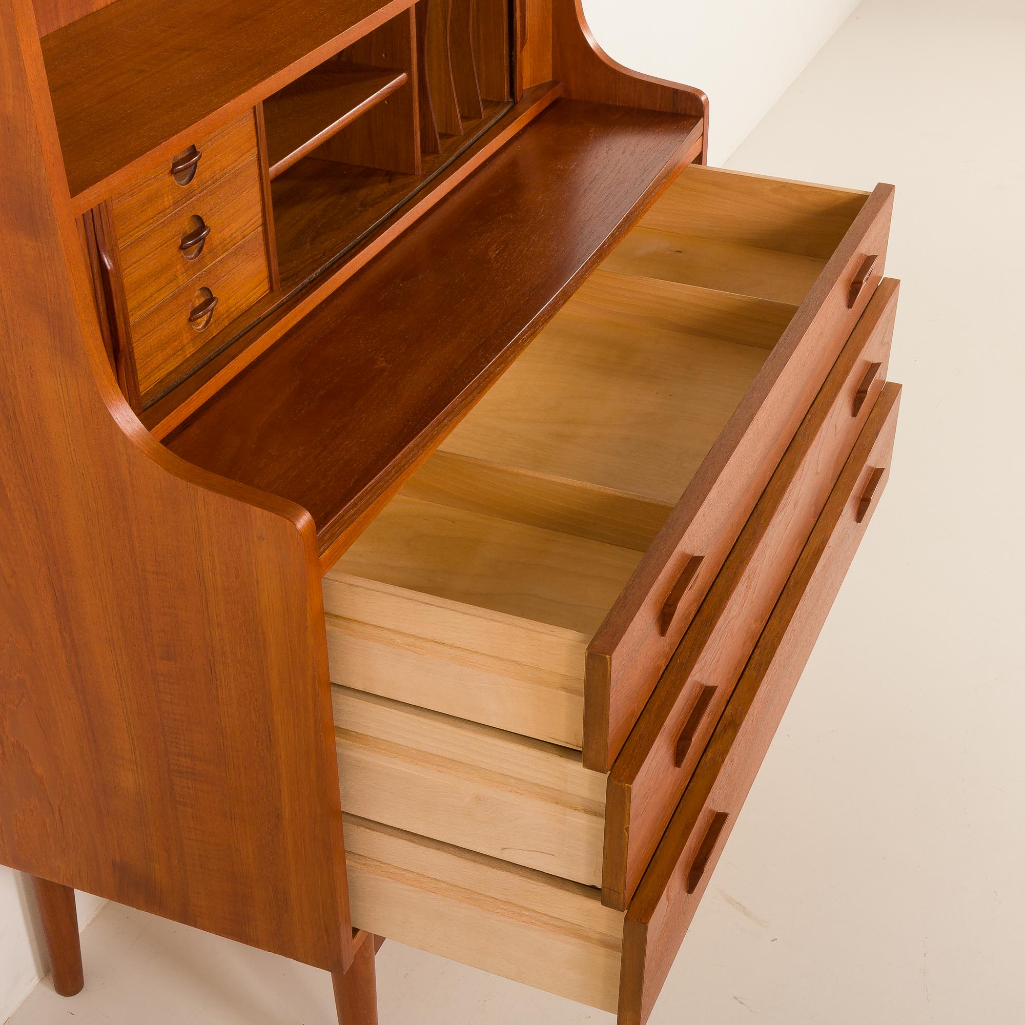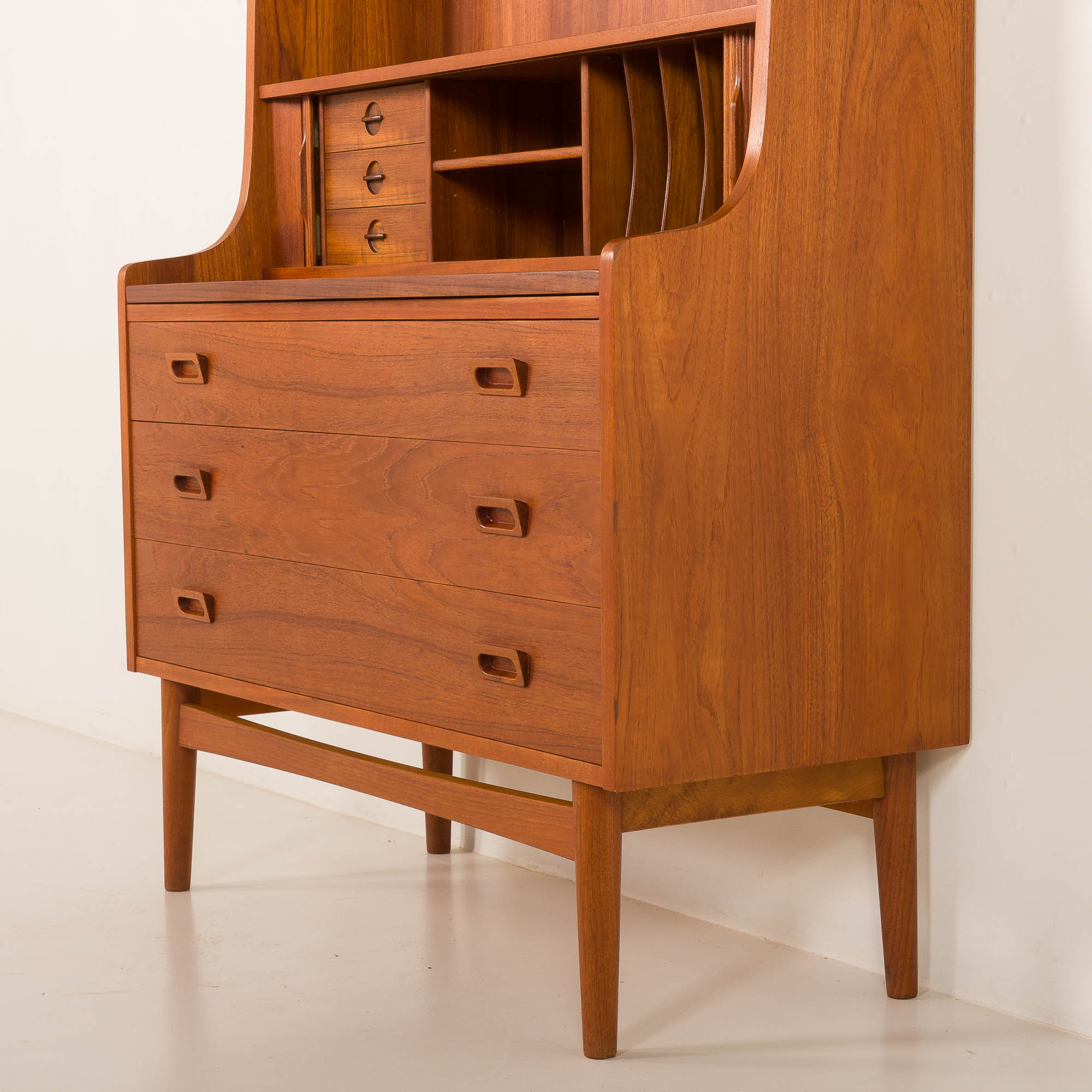 Duński regał z sekretarzykiem zaprojektowany przez Johannesa Sortha i wyprodukowany przez Nexo Møbelfabrik na Bornholmie w latach 60. Jest to wspaniały przykład wysokiej jakości duńskiego stolarstwa modernistycznego z połowy XX wieku, połączonego z elegancją i funkcjonalnością.