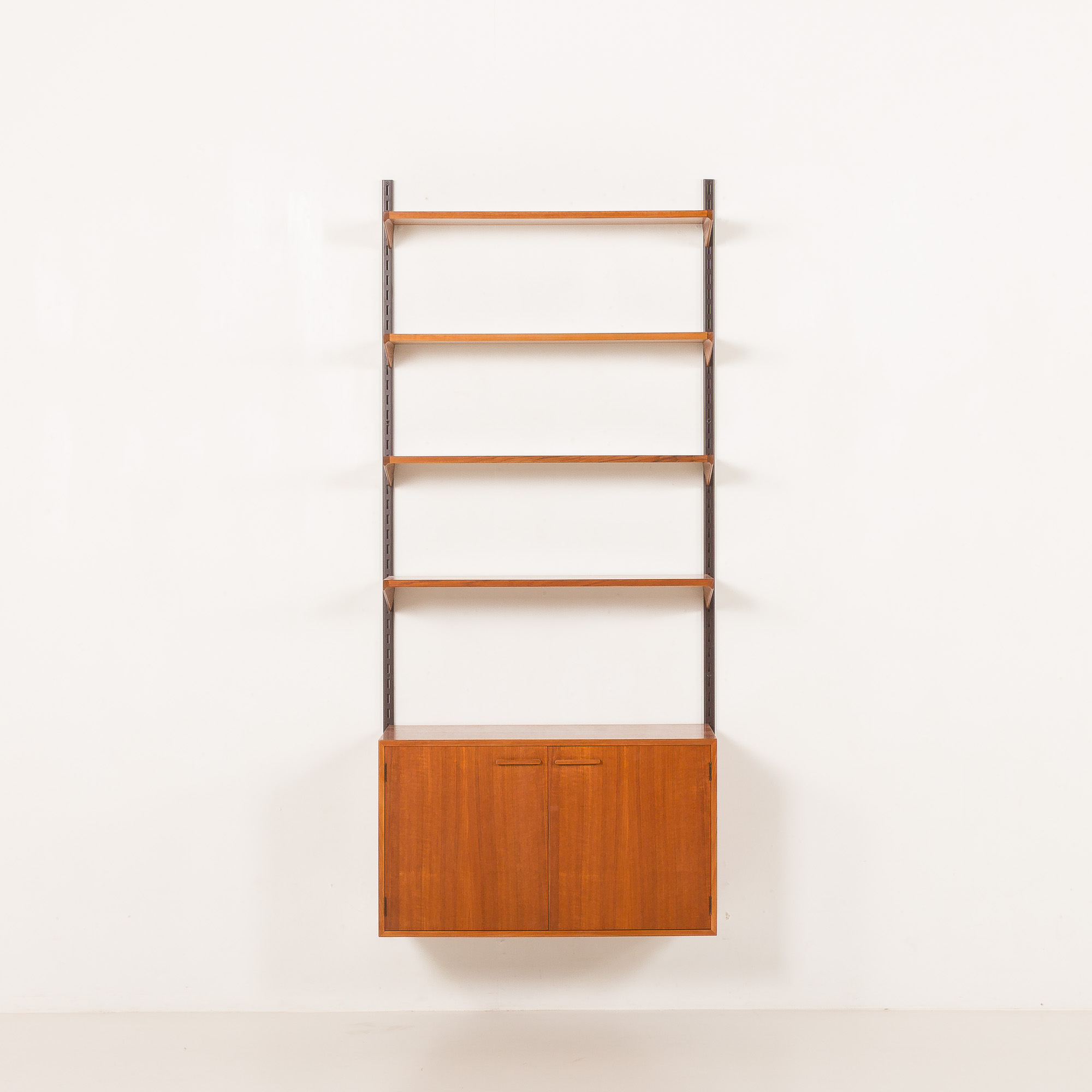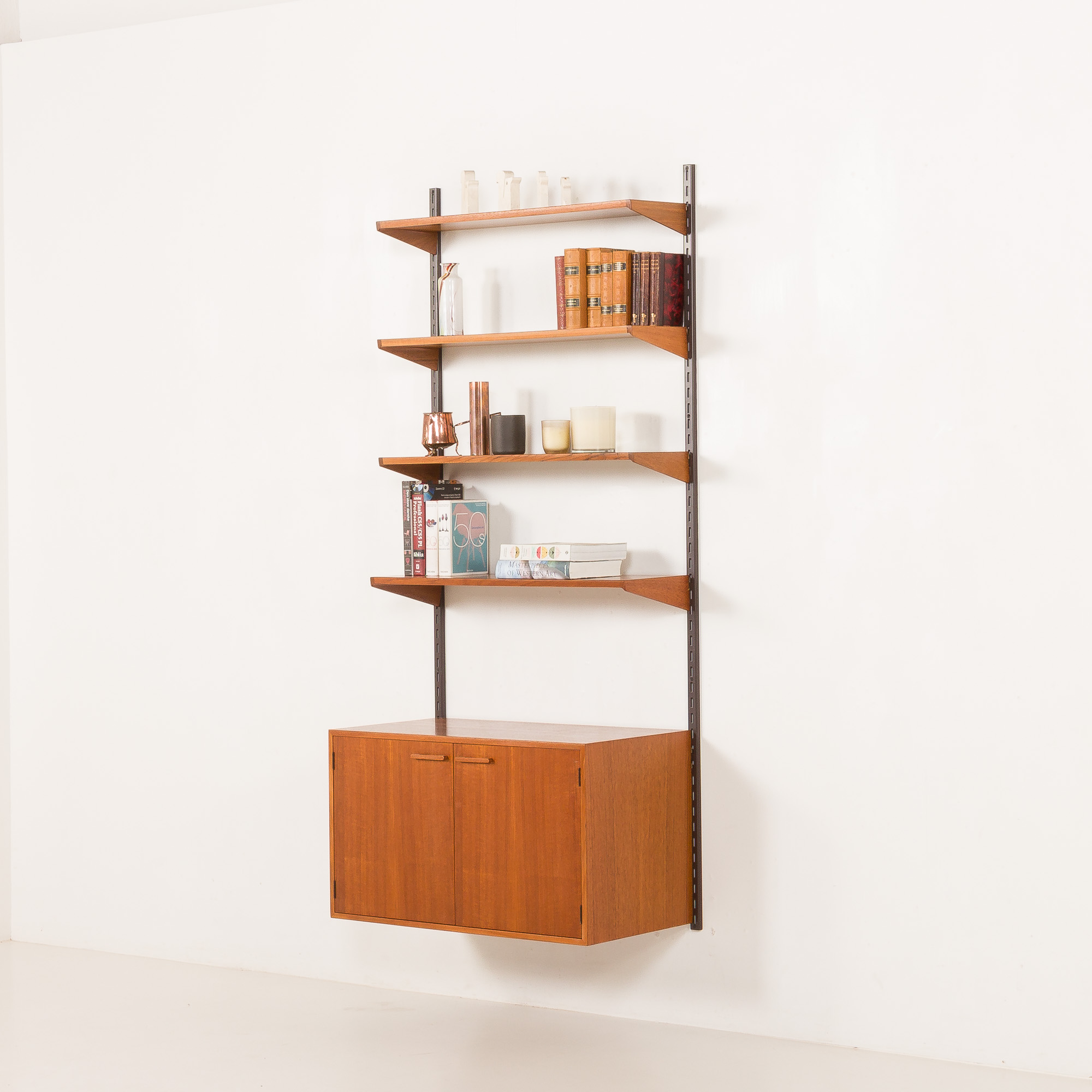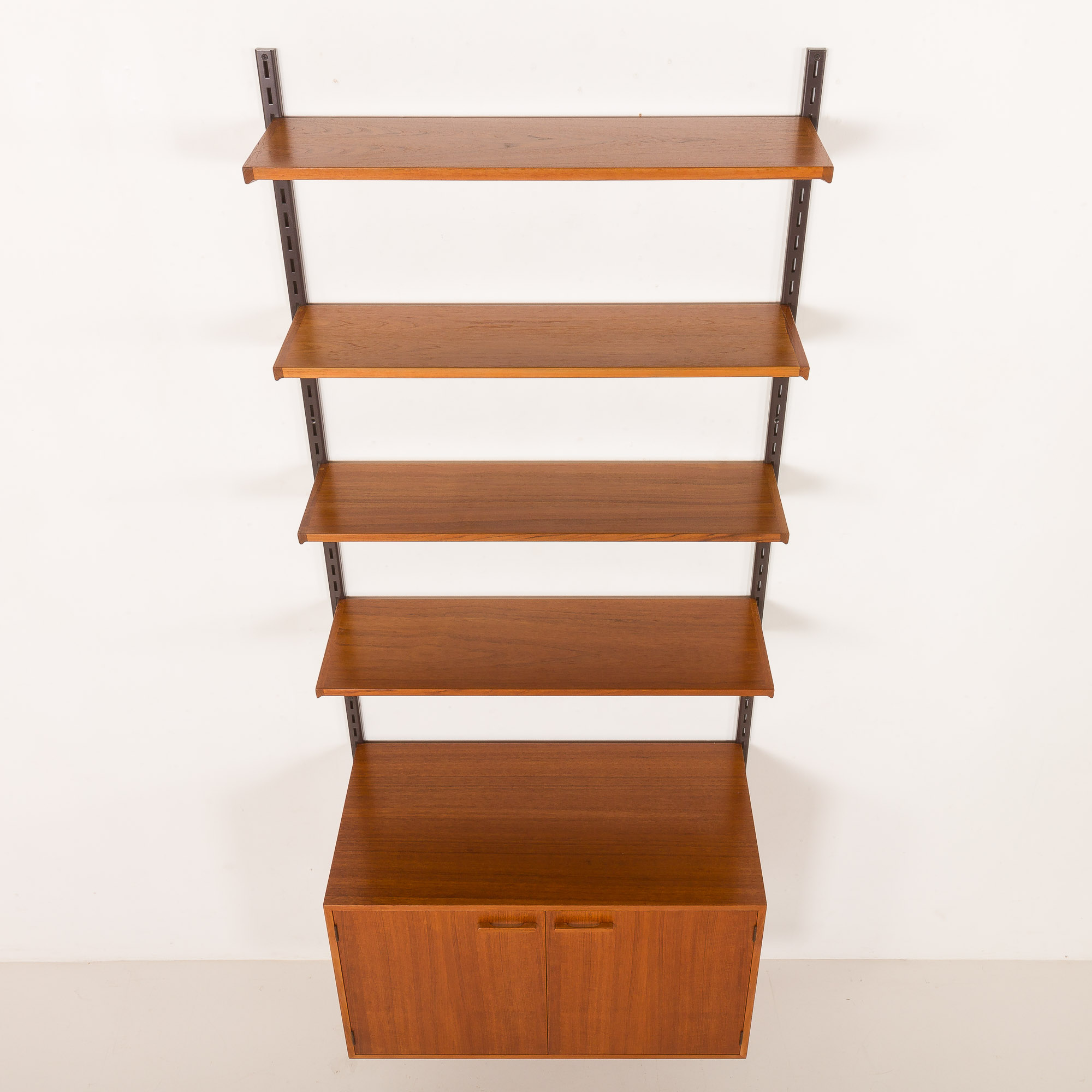 Duński tekowy zestaw ścienny, zaprojektowany przez Kaia Kristiansena dla FM Mobler w latach 60., odzwierciedla kunszt duńskiego rzemiosła mid-century. Posiada cztery półki i szafkę z wewnętrzną, regulowaną półką. Zapewnia elegancką i funkcjonalną przestrzeń do przechowywania, eksponowania książek i dekoracji. Jak wszystkie meble Kaia Kristiansena, ma wyrafinowaną formę z wyrzeźbionymi akcentami. Jest to w pełni modułowy system. Wszystkie elementy mają 85,5 cm szerokości i można je dowolnie konfigurować dzięki metalowym haczykom mocowanych do szyn, które pozwalają na regulacje wysokości i zamienianie elementów miejscami.