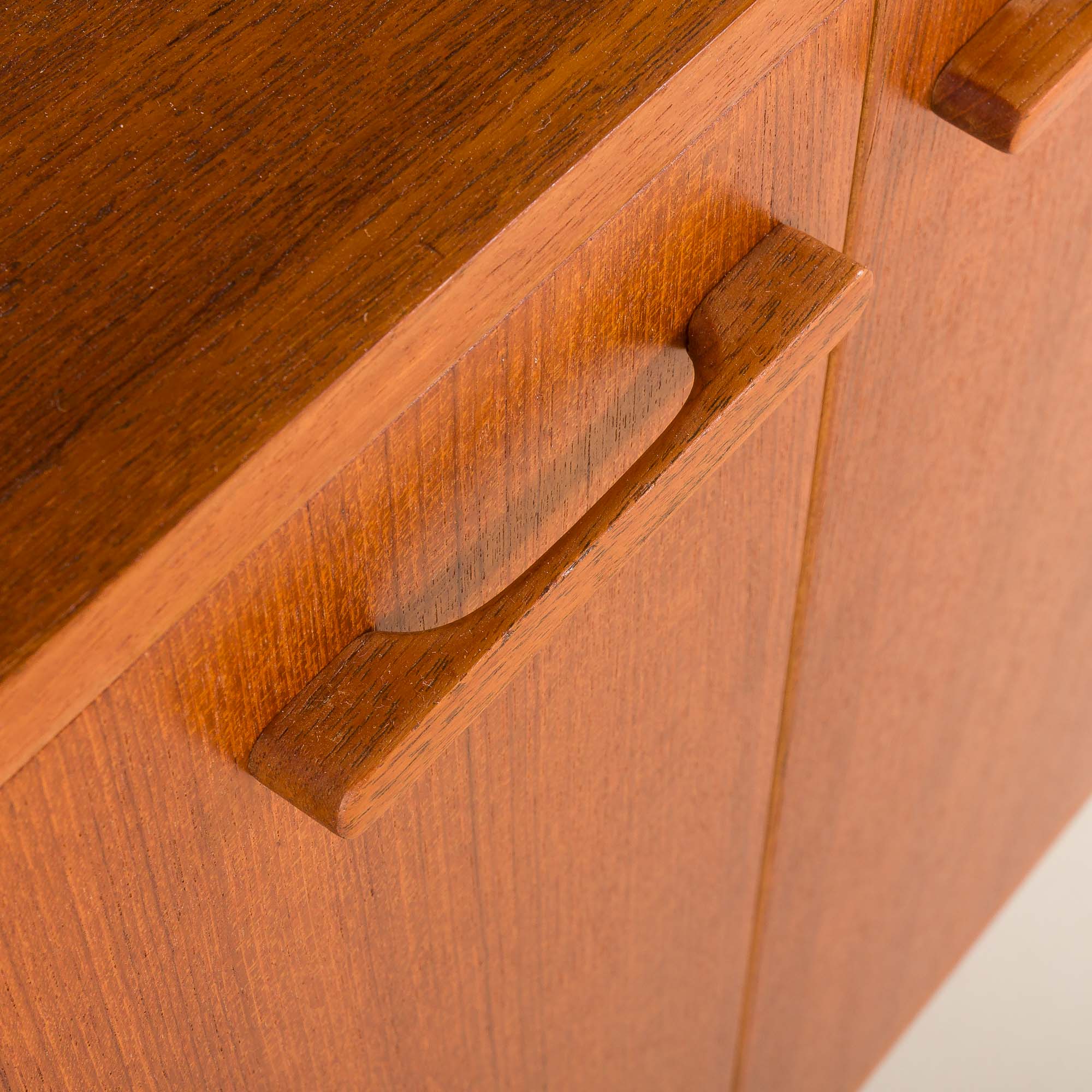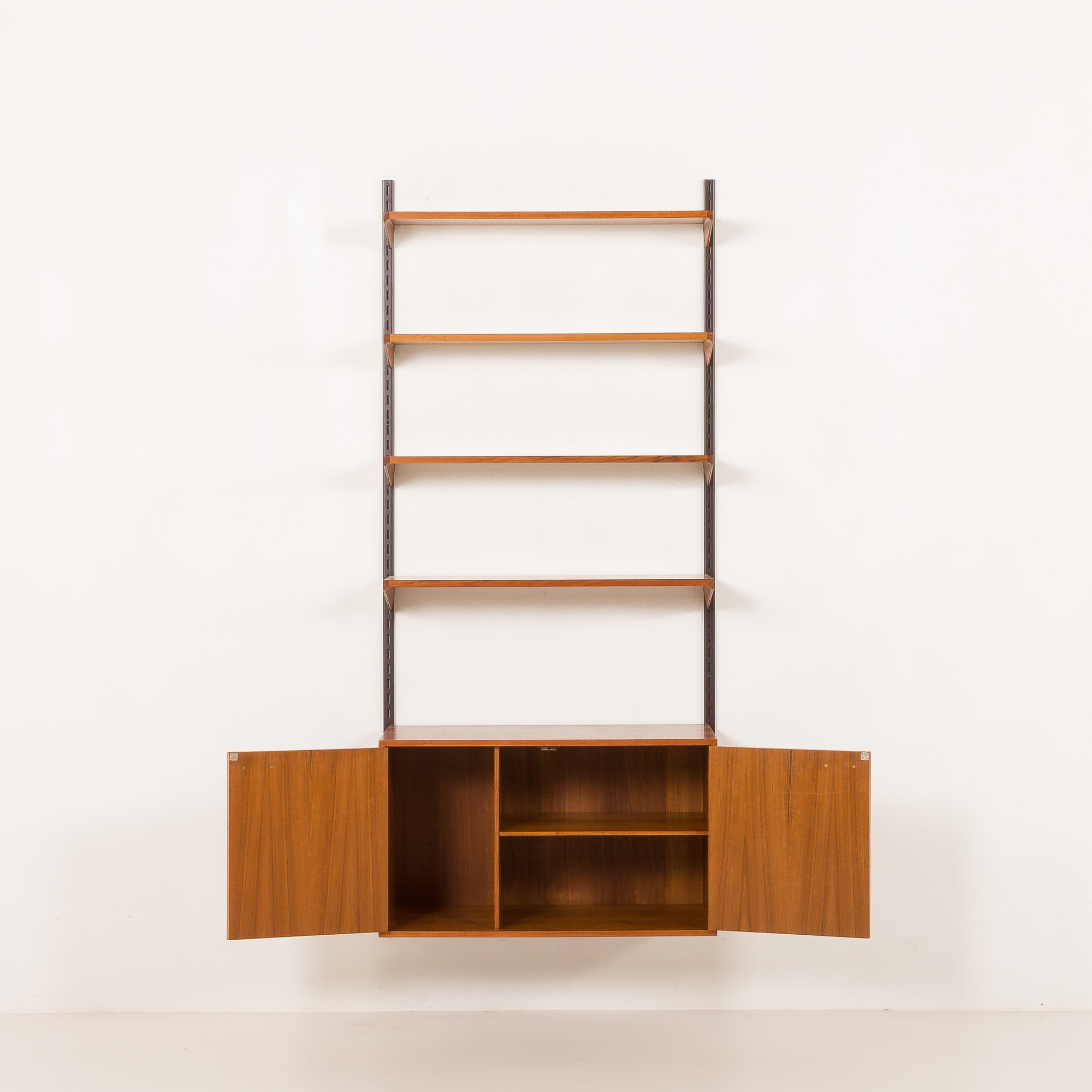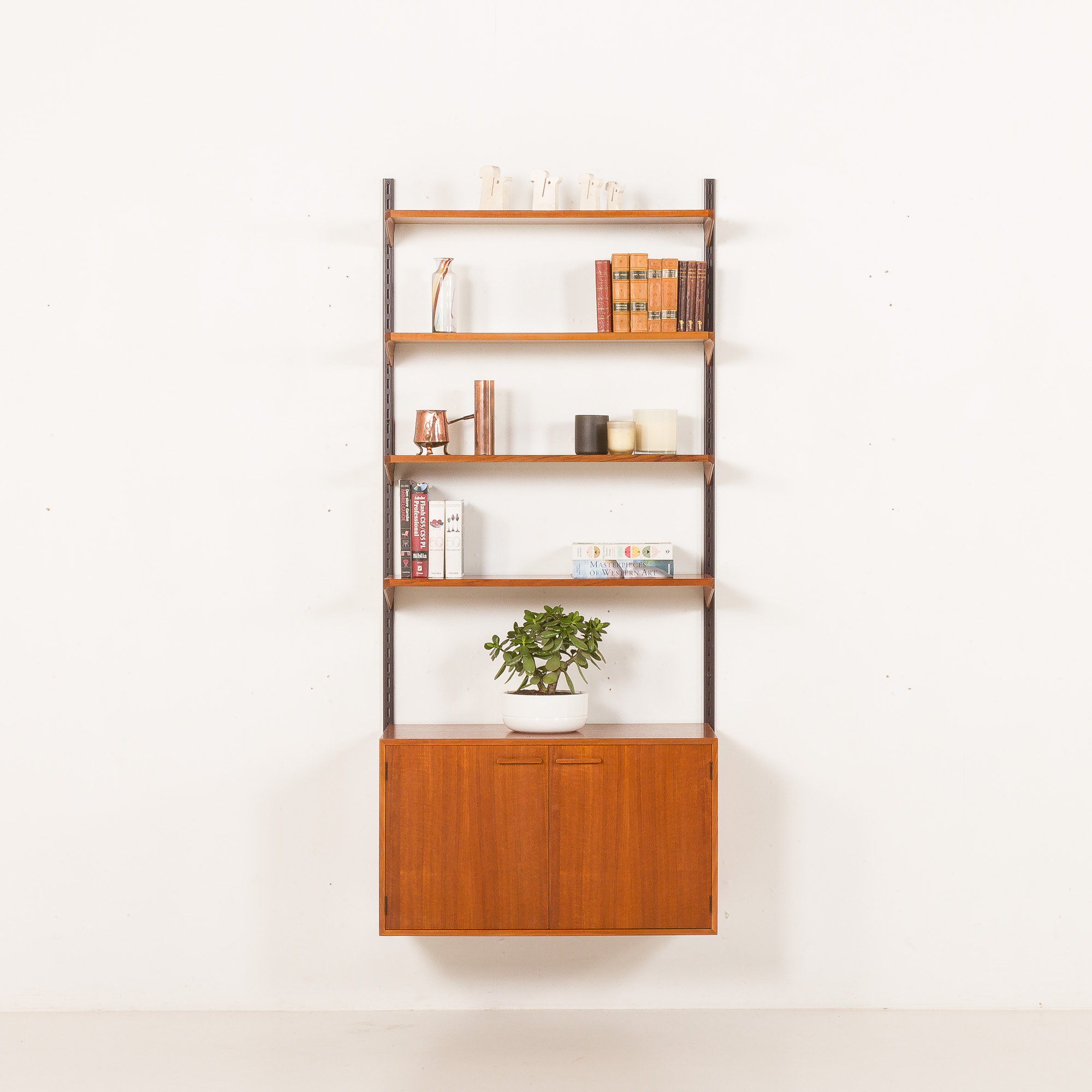 Duński tekowy zestaw ścienny, zaprojektowany przez Kaia Kristiansena dla FM Mobler w latach 60., odzwierciedla kunszt duńskiego rzemiosła mid-century. Posiada cztery półki i szafkę z wewnętrzną, regulowaną półką. Zapewnia elegancką i funkcjonalną przestrzeń do przechowywania, eksponowania książek i dekoracji. Jak wszystkie meble Kaia Kristiansena, ma wyrafinowaną formę z wyrzeźbionymi akcentami. Jest to w pełni modułowy system. Wszystkie elementy mają 85,5 cm szerokości i można je dowolnie konfigurować dzięki metalowym haczykom mocowanych do szyn, które pozwalają na regulacje wysokości i zamienianie elementów miejscami.
