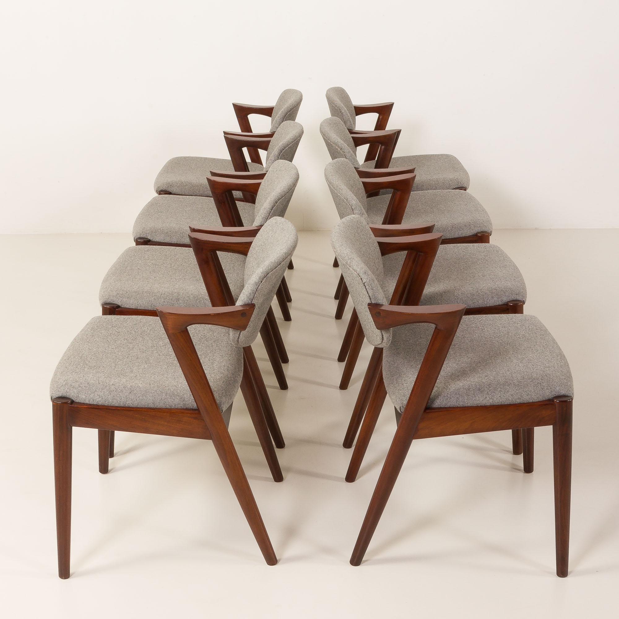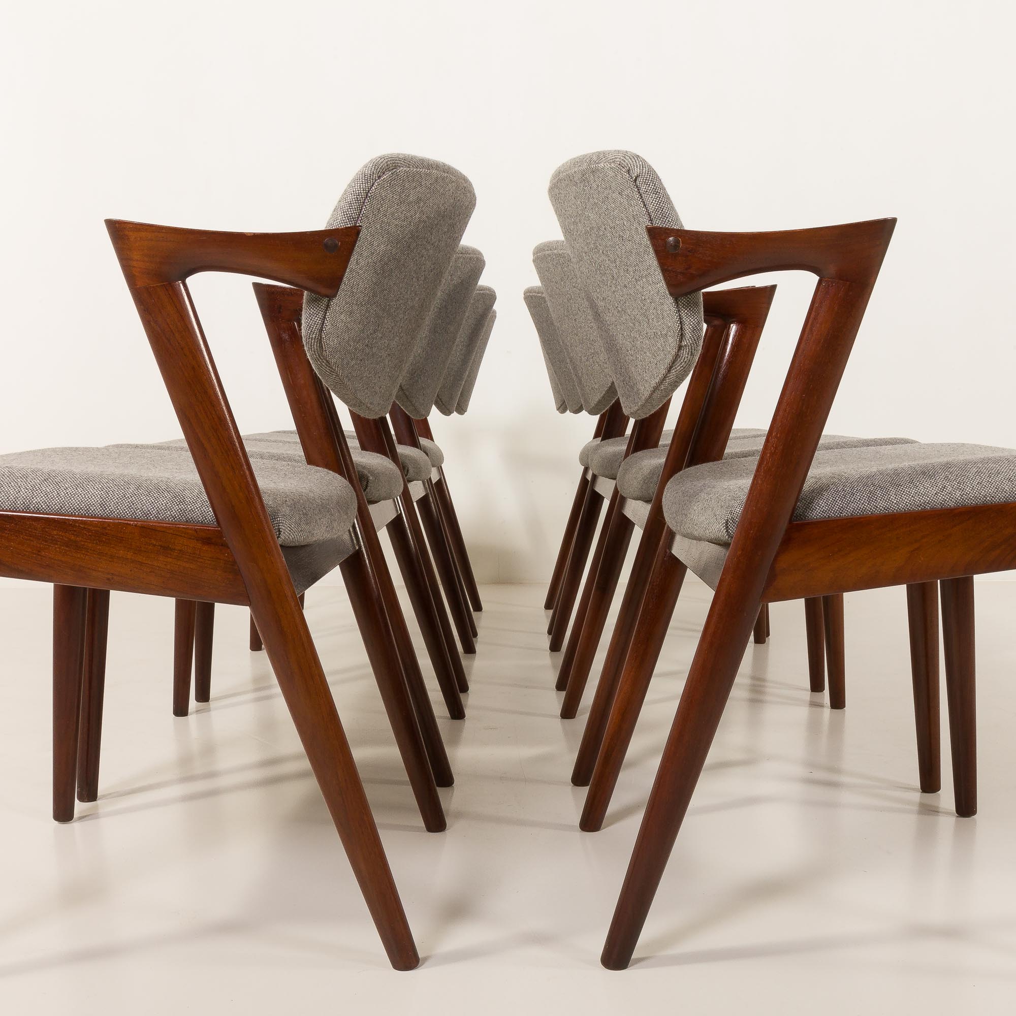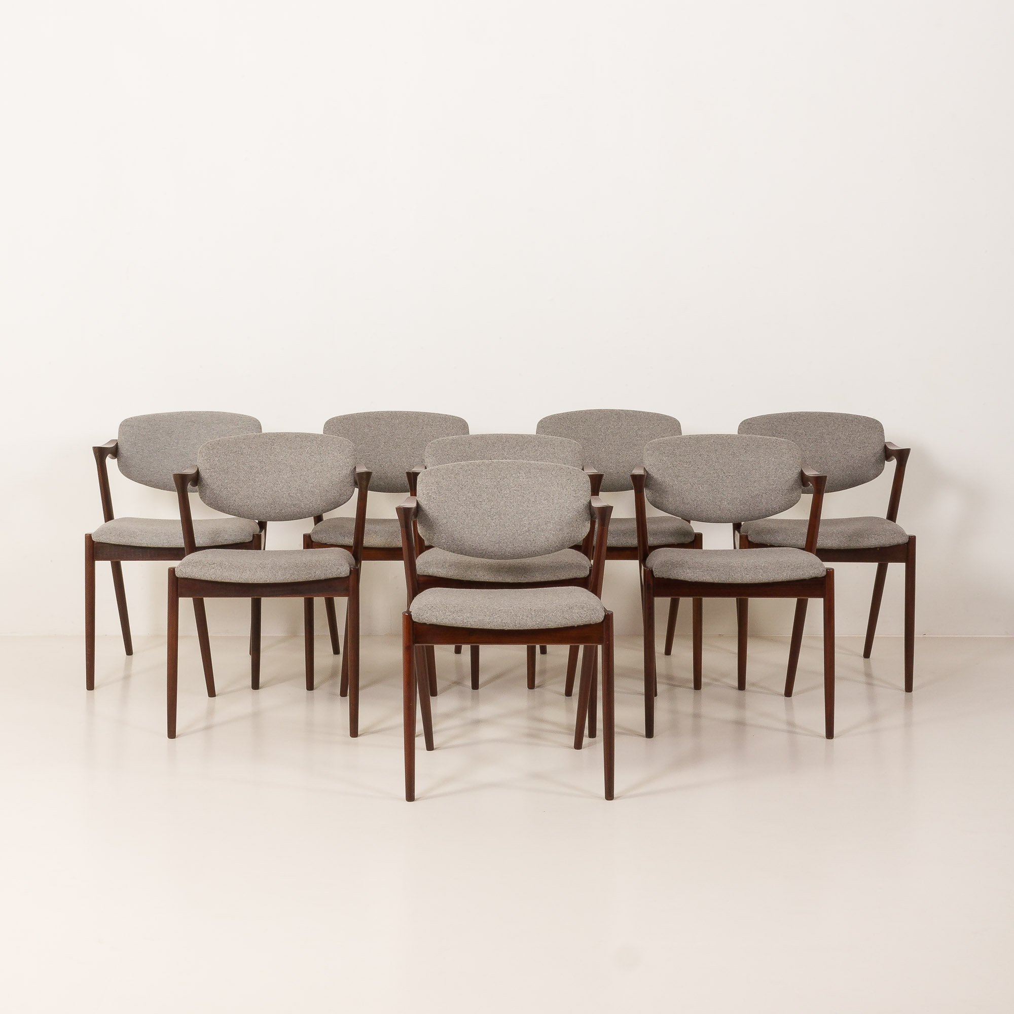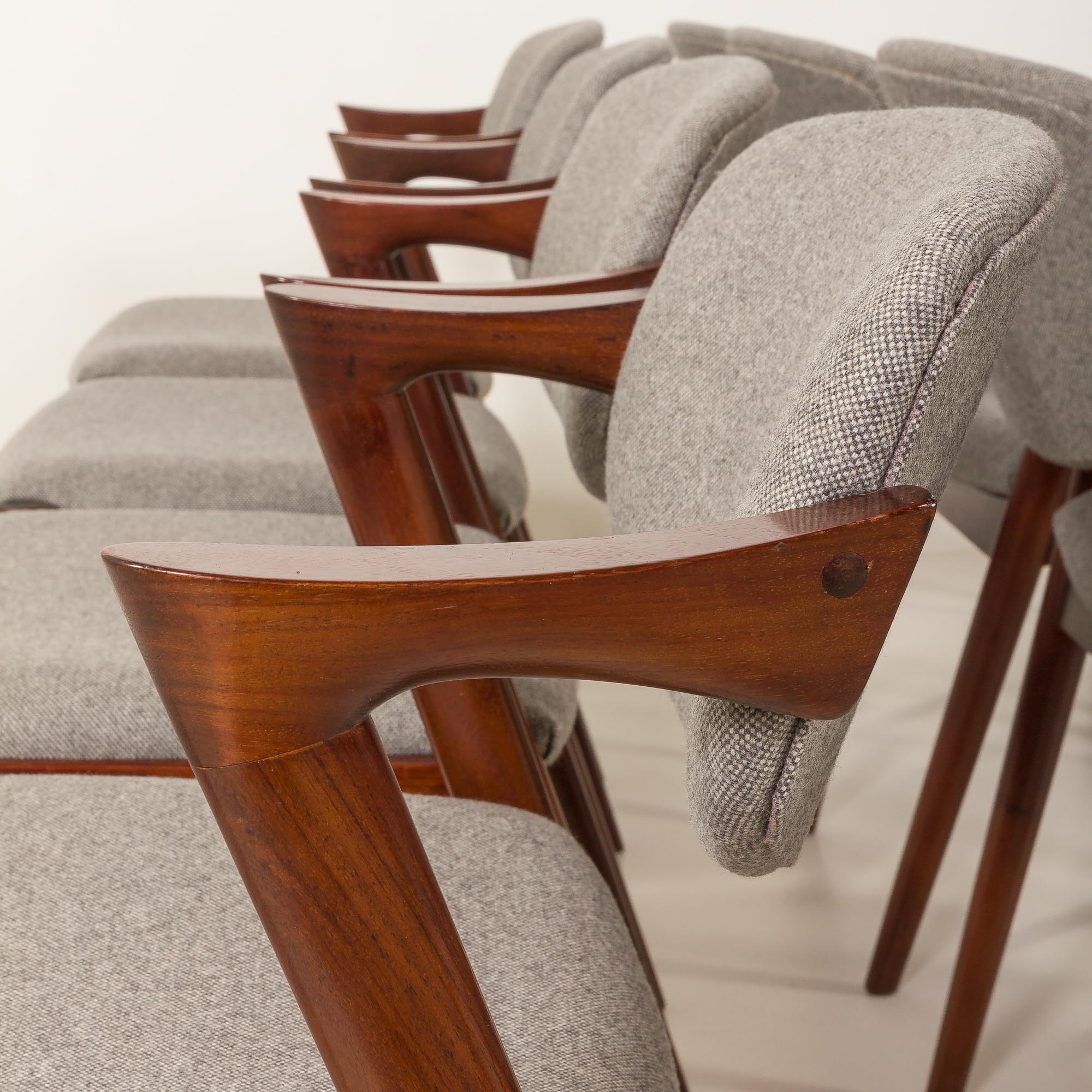 Zestaw 8 słynnych i niezwykle eleganckich krzeseł vintage z palisandru, model 42, zaprojektowanych przez Kaia Kristiansena i wyprodukowanych przez Schou Andersen w latach 60. Stanowią doskonały dodatek do każdej jadalni lub salonu. Rama z litego palisandru i nowa, naturalna tapicerka z recyklingowanej wełny w jasnoszarym kolorze to idealne połączenie skandynawskiego rzemiosła vintage z nowoczesną, ekologiczną koncepcją, nadając krzesłom stylowy i wyjątkowy charakter. Model 42 posiada wygodne, odchylane oparcie i stabilną, solidną konstrukcję z litego drewna. Krzesła nr 42 doskonale odzwierciedlają połączenie formy, przestrzeni i funkcjonalności duńskiego, modernistycznego designu