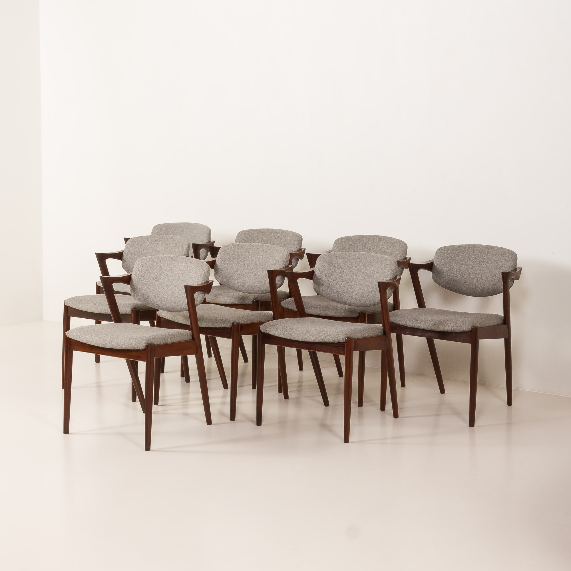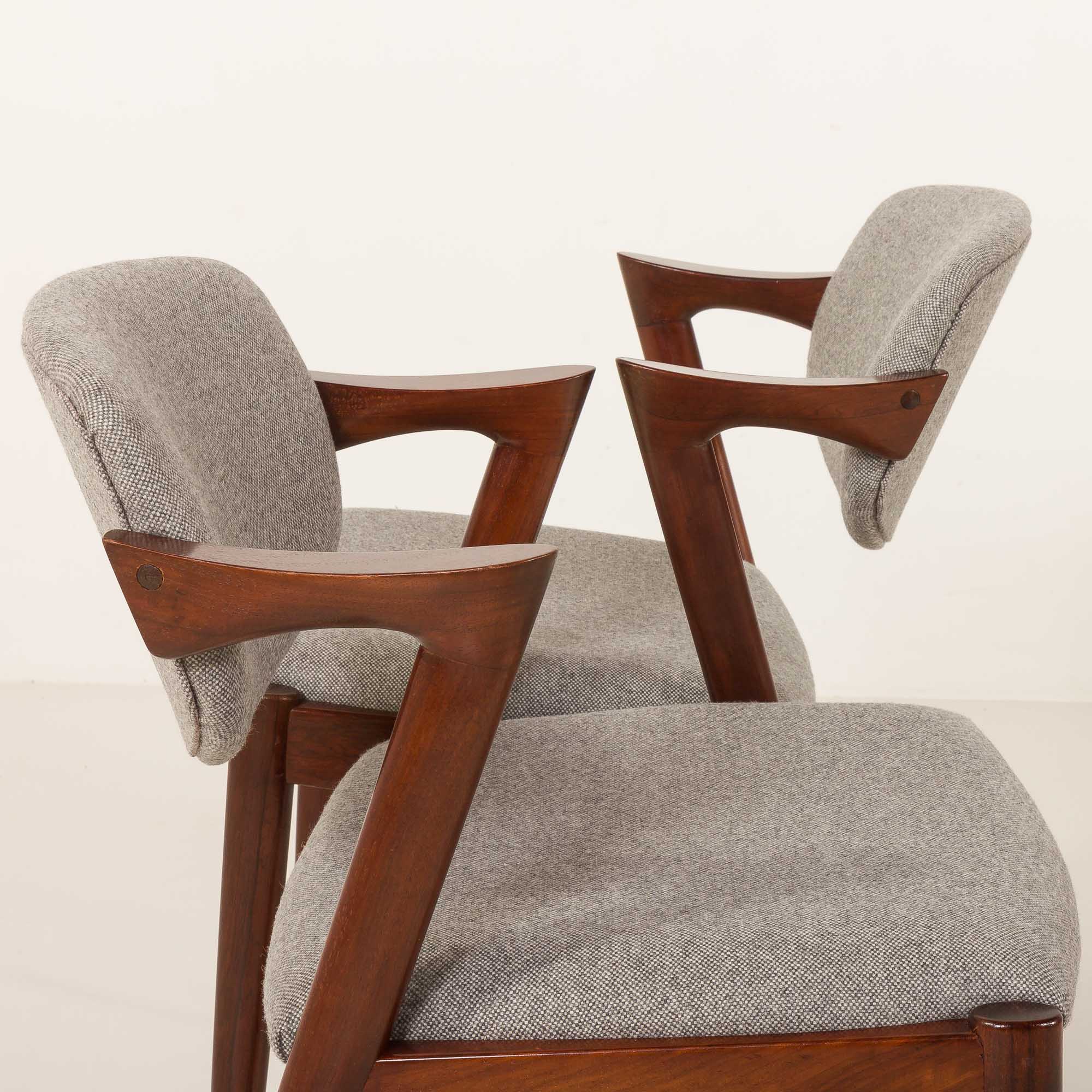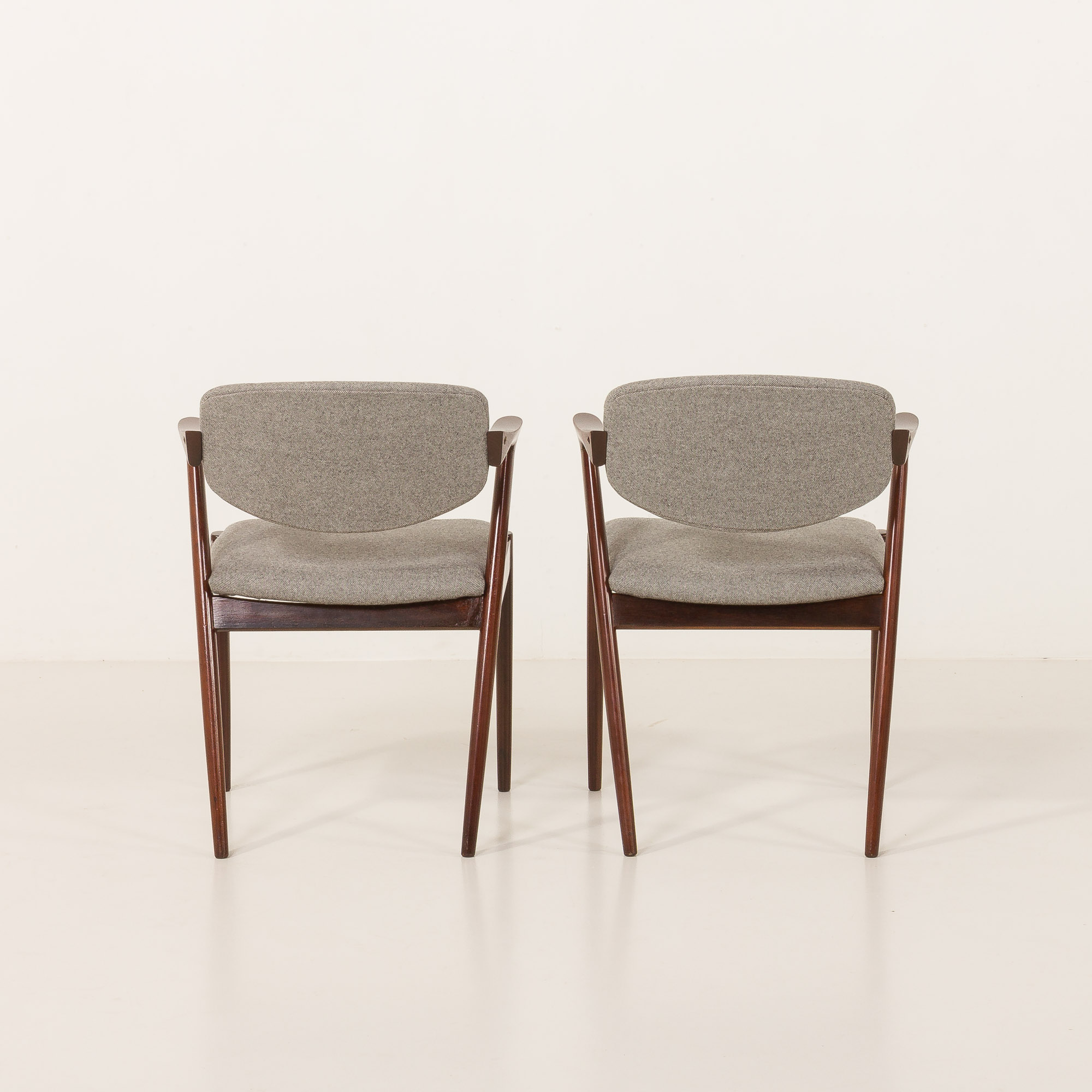 Zestaw 8 słynnych i niezwykle eleganckich krzeseł vintage z palisandru, model 42, zaprojektowanych przez Kaia Kristiansena i wyprodukowanych przez Schou Andersen w latach 60. Stanowią doskonały dodatek do każdej jadalni lub salonu. Rama z litego palisandru i nowa, naturalna tapicerka z recyklingowanej wełny w jasnoszarym kolorze to idealne połączenie skandynawskiego rzemiosła vintage z nowoczesną, ekologiczną koncepcją, nadając krzesłom stylowy i wyjątkowy charakter. Model 42 posiada wygodne, odchylane oparcie i stabilną, solidną konstrukcję z litego drewna. Krzesła nr 42 doskonale odzwierciedlają połączenie formy, przestrzeni i funkcjonalności duńskiego, modernistycznego designu