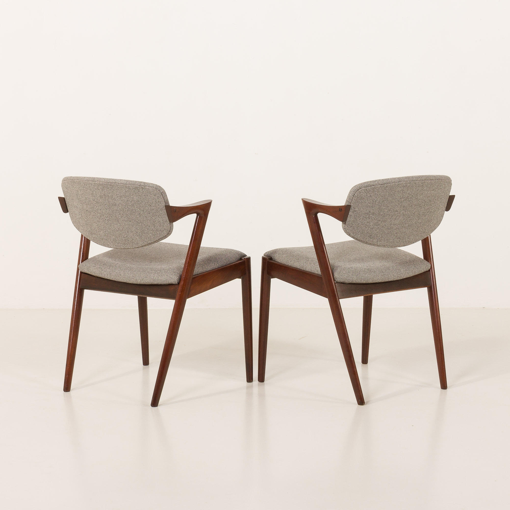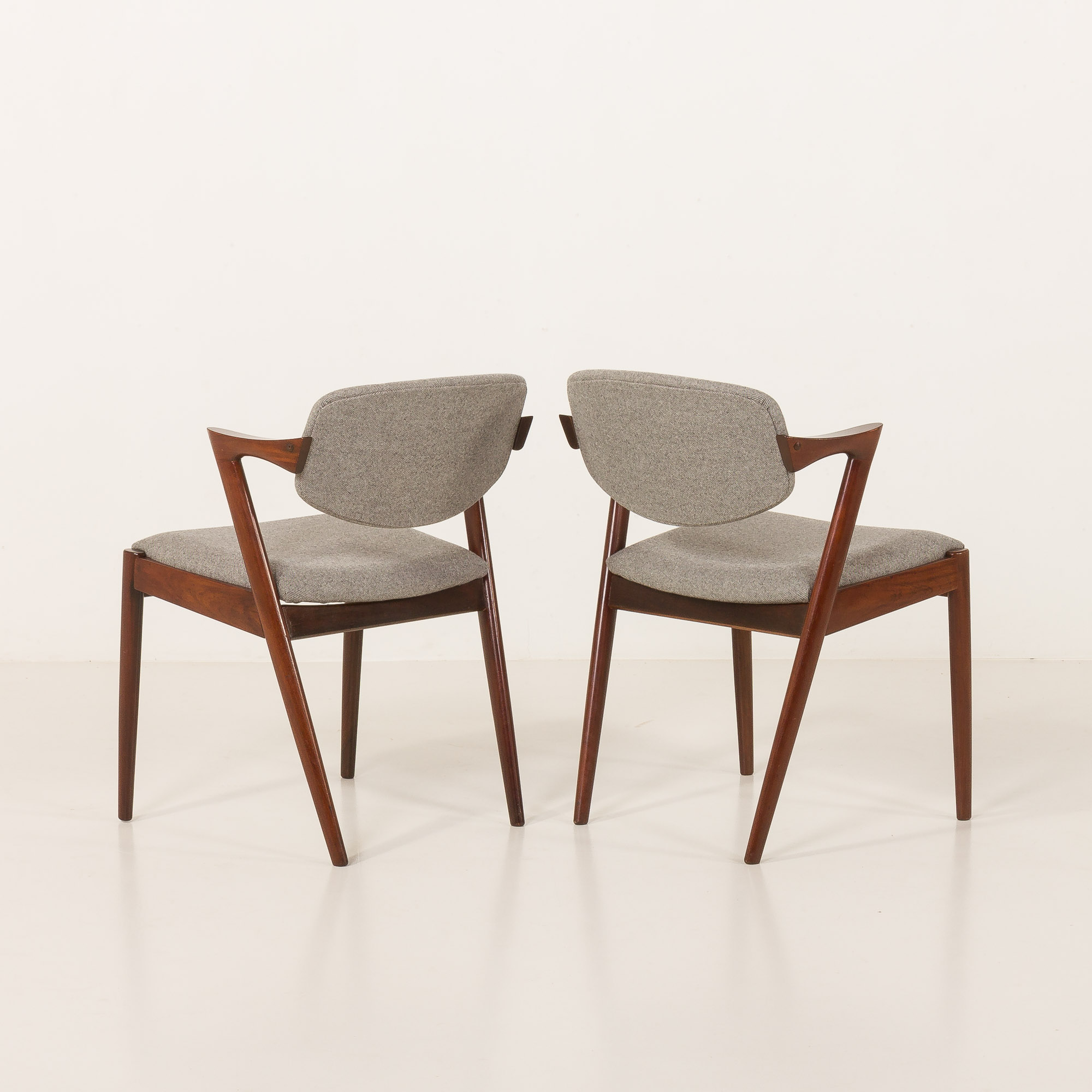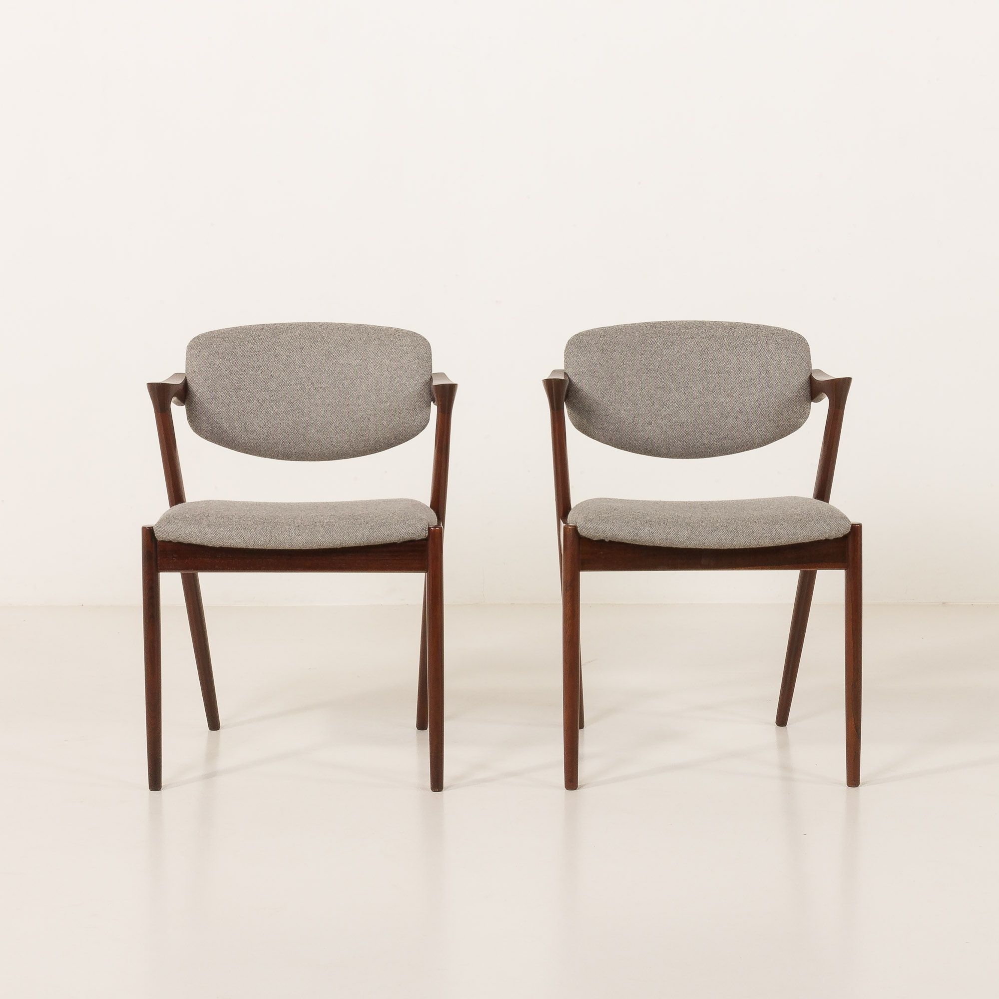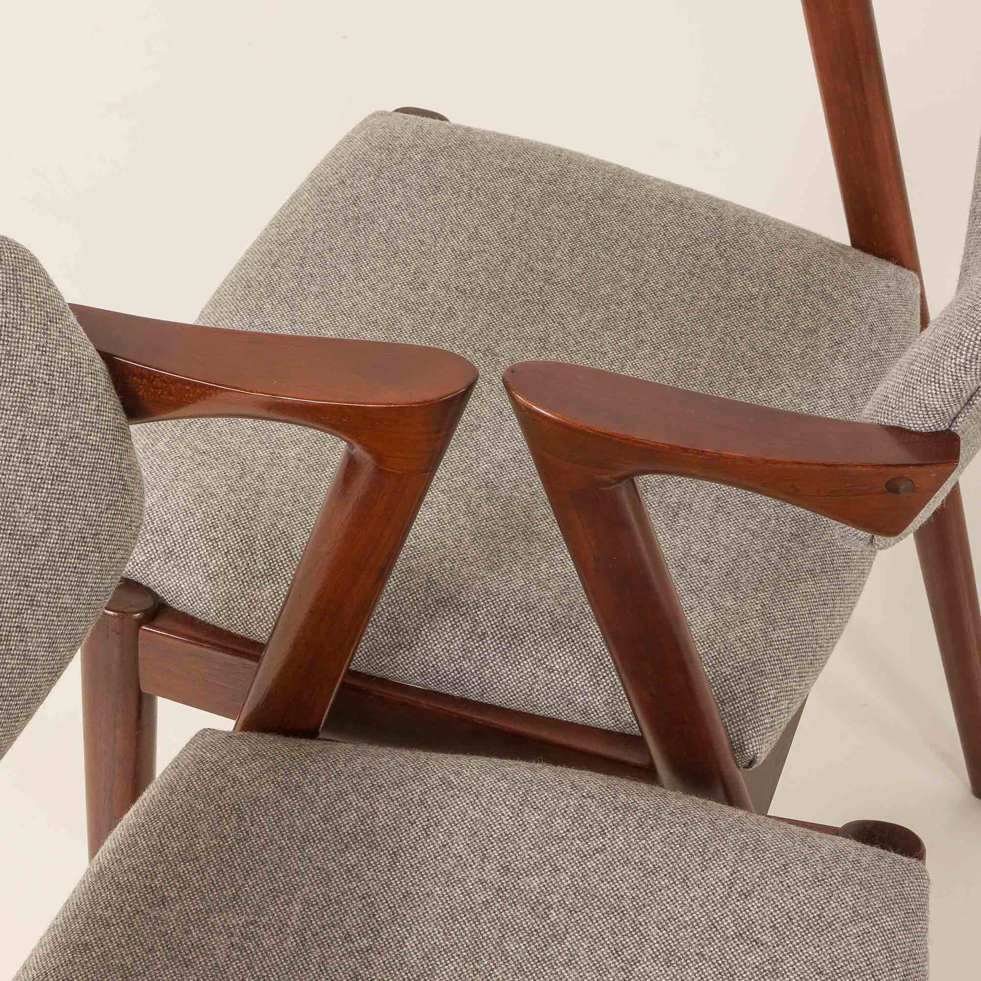 Zestaw 8 słynnych i niezwykle eleganckich krzeseł vintage z palisandru, model 42, zaprojektowanych przez Kaia Kristiansena i wyprodukowanych przez Schou Andersen w latach 60. Stanowią doskonały dodatek do każdej jadalni lub salonu. Rama z litego palisandru i nowa, naturalna tapicerka z recyklingowanej wełny w jasnoszarym kolorze to idealne połączenie skandynawskiego rzemiosła vintage z nowoczesną, ekologiczną koncepcją, nadając krzesłom stylowy i wyjątkowy charakter. Model 42 posiada wygodne, odchylane oparcie i stabilną, solidną konstrukcję z litego drewna. Krzesła nr 42 doskonale odzwierciedlają połączenie formy, przestrzeni i funkcjonalności duńskiego, modernistycznego designu