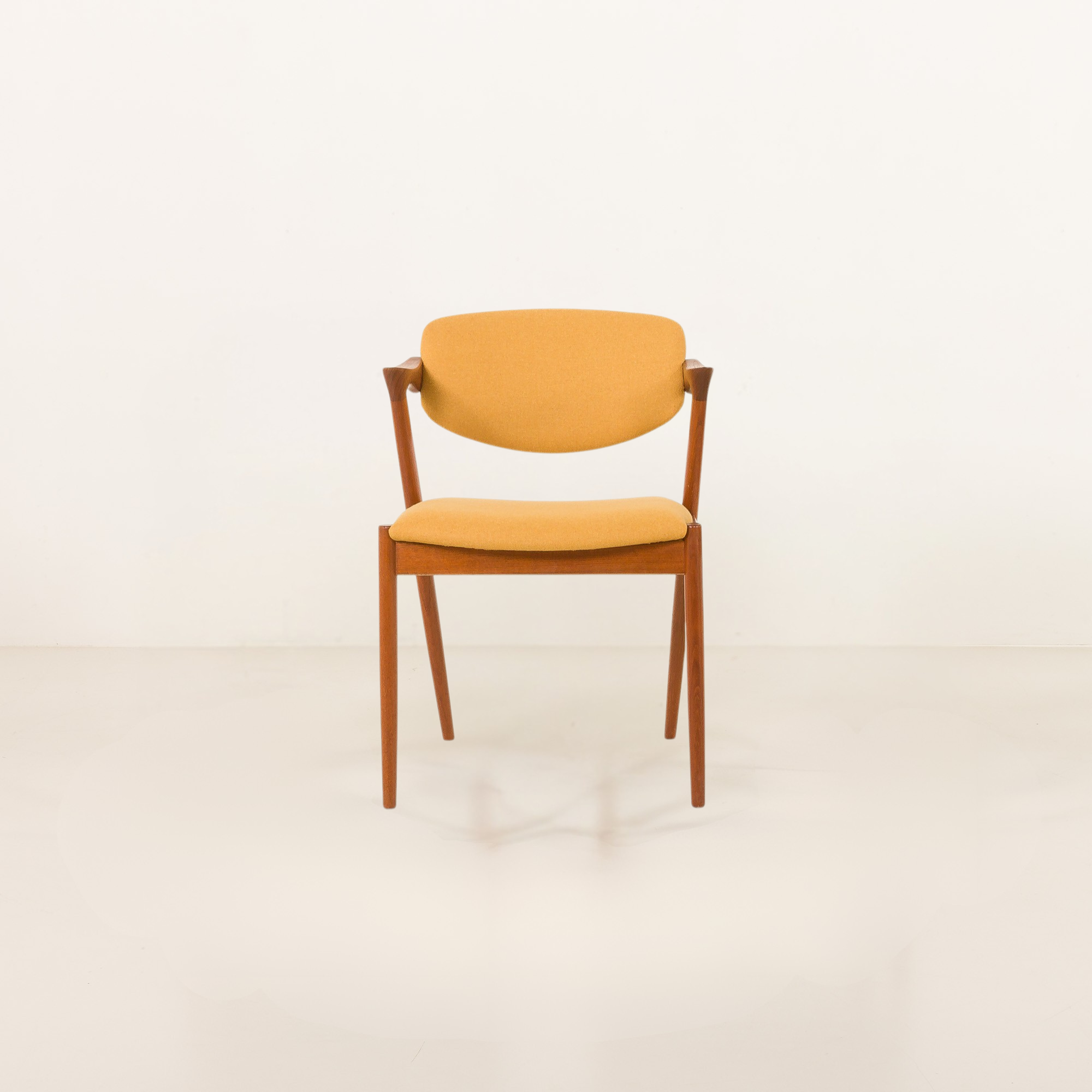 Słynne krzesło vintage z drewna tekowego, model 42, zostało zaprojektowane przez Kai Kristiansena i wyprodukowane przez firmę Schou Andersen w latach 60. To ponadczasowy klasyk, który doskonale uzupełni każde biurko, salon czy sypialnię. Solidna rama z drewna tekowego oraz nowa tapicerka z naturalnej wełny w kolorze musztardowym sprawiają, że krzesło prezentuje się wyjątkowo stylowo i elegancko. Model 42 wyróżnia się komfortowym, oparciem oraz stabilną, trwałą konstrukcją z litego drewna. To idealny przykład harmonijnego połączenia formy, przestrzeni i funkcjonalności charakterystycznego dla duńskiego modernizmu.