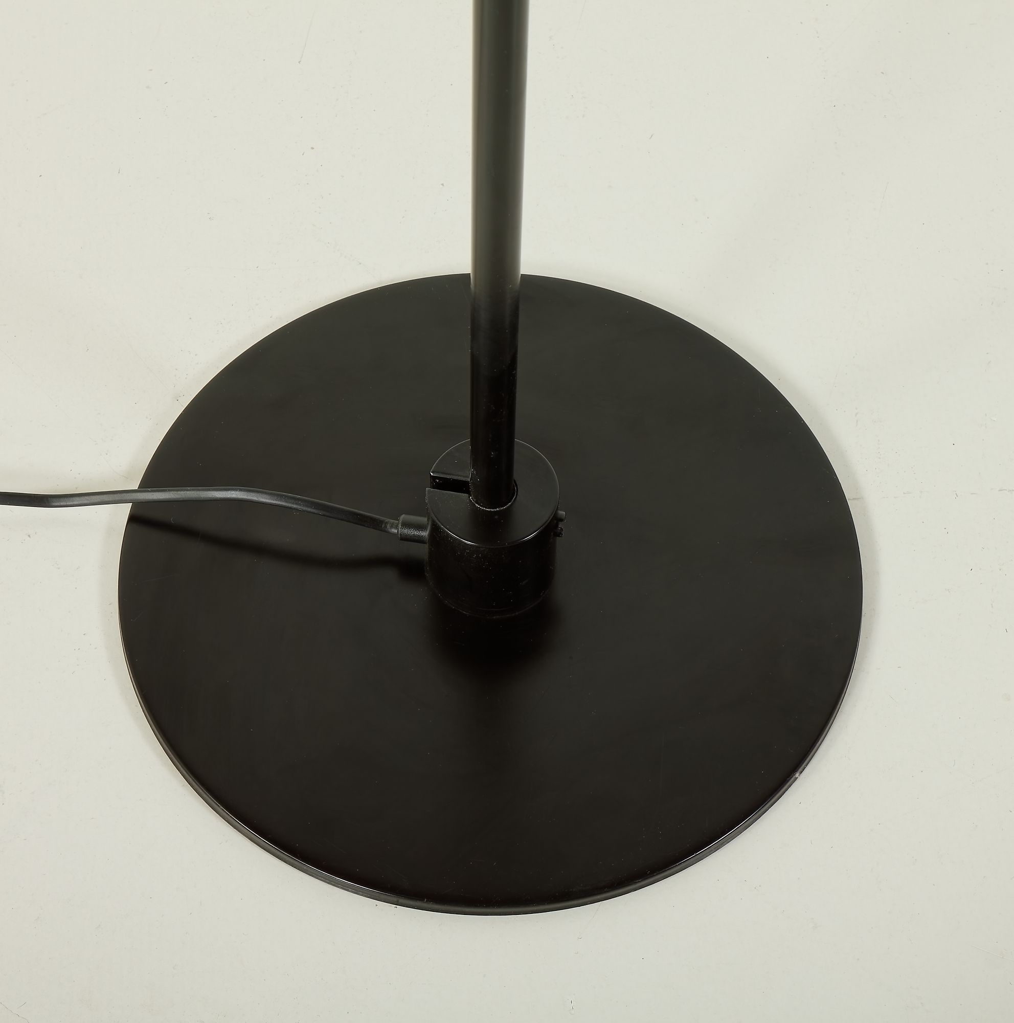 Lampa wykonana jest z metalu wykończonego błyszczącym, czarnym lakierem, który tworzy elegancki kontrast z białym, akrylowym kloszem. Posiada dwa oddzielne włączniki: jeden umieszczony na kablu 40 cm od podstawy, a drugi tuż nad kloszem, dla wygodnego dostępu. Oprawka żarówki zachowała oryginalną etykietę producenta, potwierdzającą autentyczność.