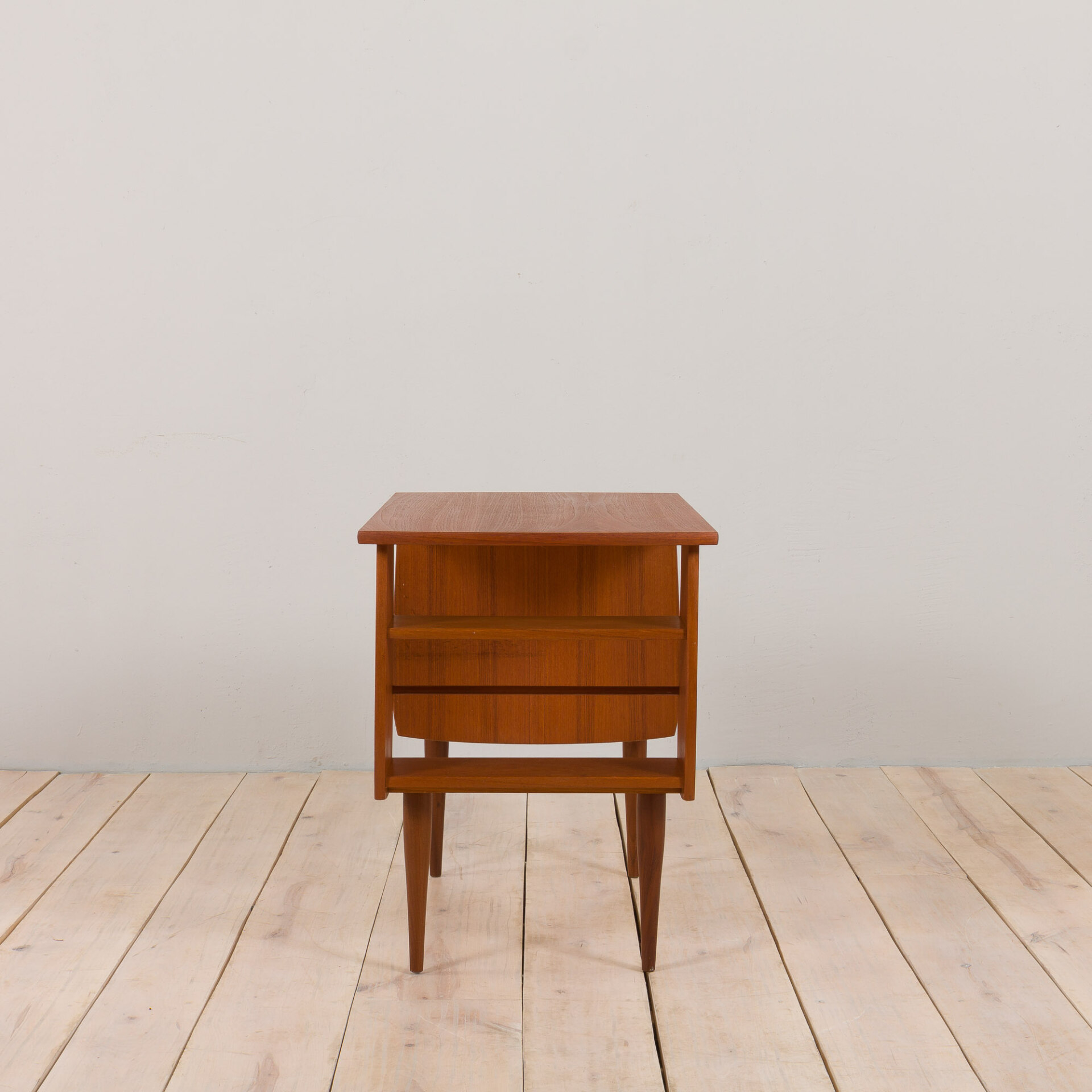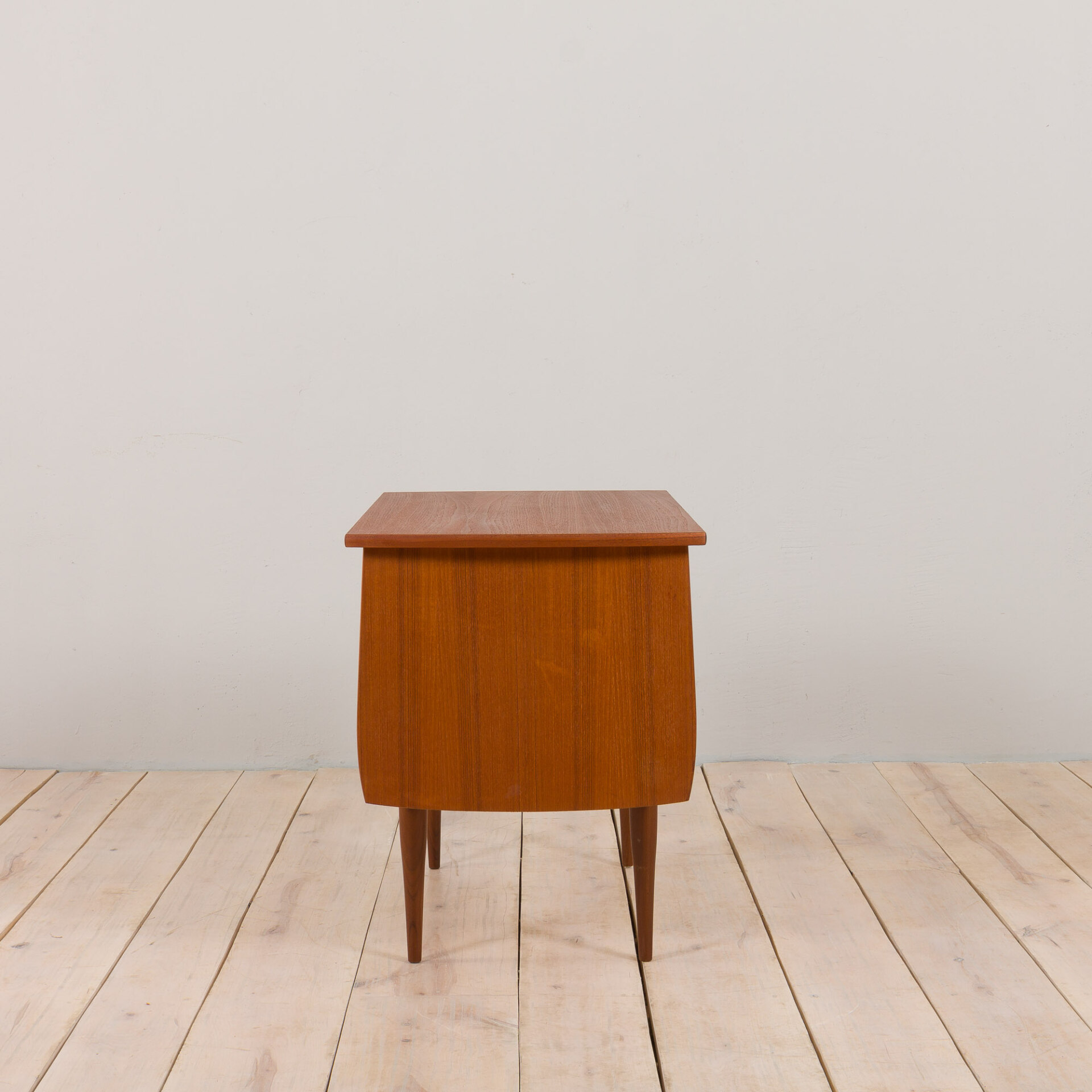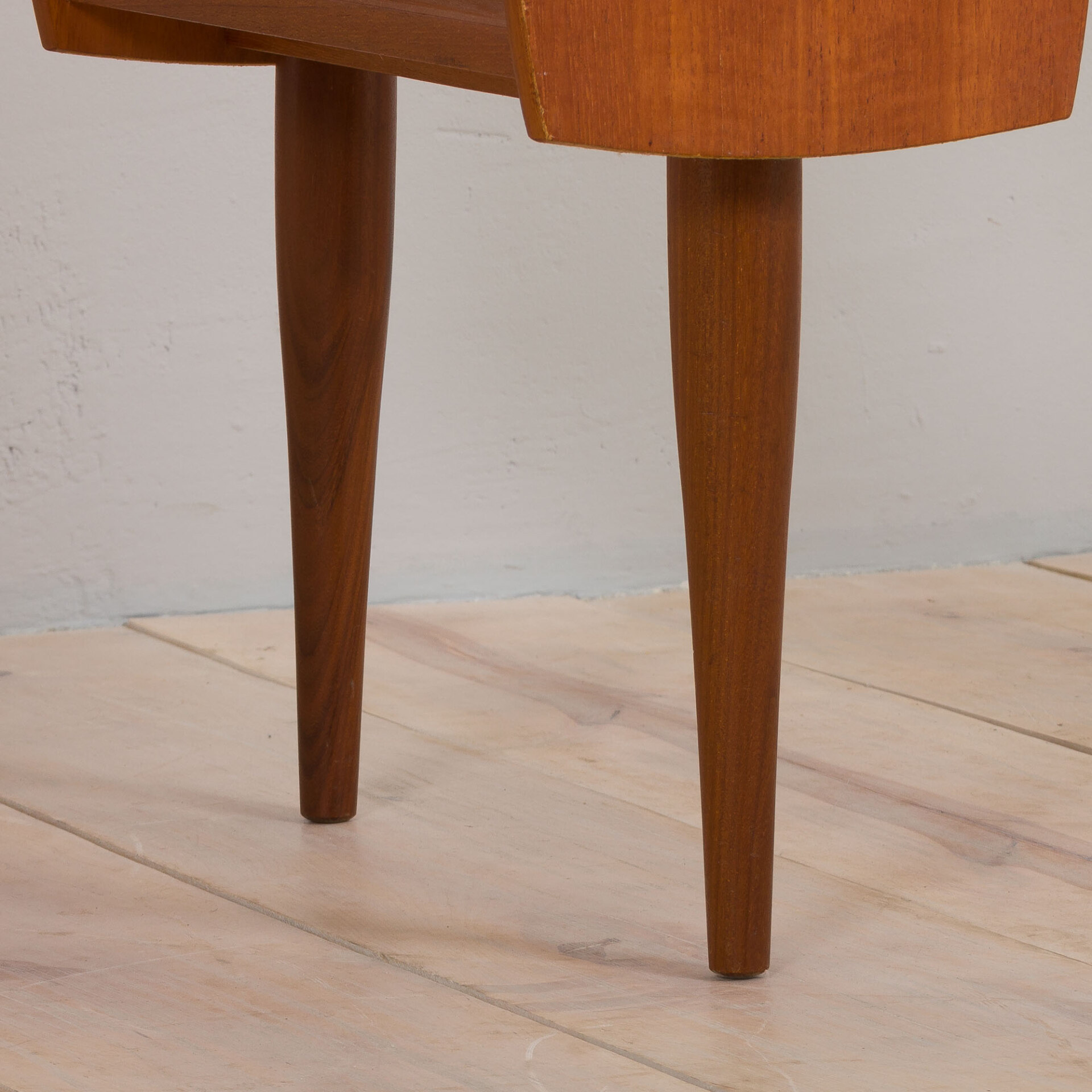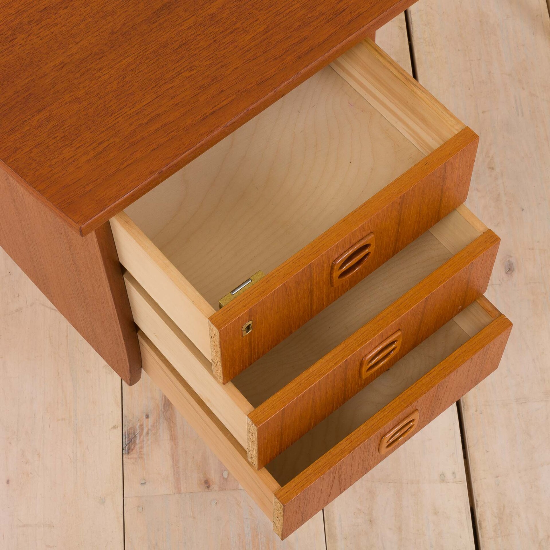 Skandynawskie biurko z ładnie wyprofilowanym, lekko zagiętym blatem i krawędziami pochodzi z Norwegii z lat 60-tych. Z boku posiada przestrzeń do przechowywania w postaci otwartych półek, a z przodu trzy szuflady. Wpuszczane uchwyty z litego drewna tekowego i subtelne zakrzywione linie podkreślają wyjątkowość designu mid-century. Zwężane nogi z litego drewna tekowego podkreślają skandynawskie pochodzenie i są wykręcane dla wygodnego transportu. Idealny mebel do mniejszych pomieszczeń.