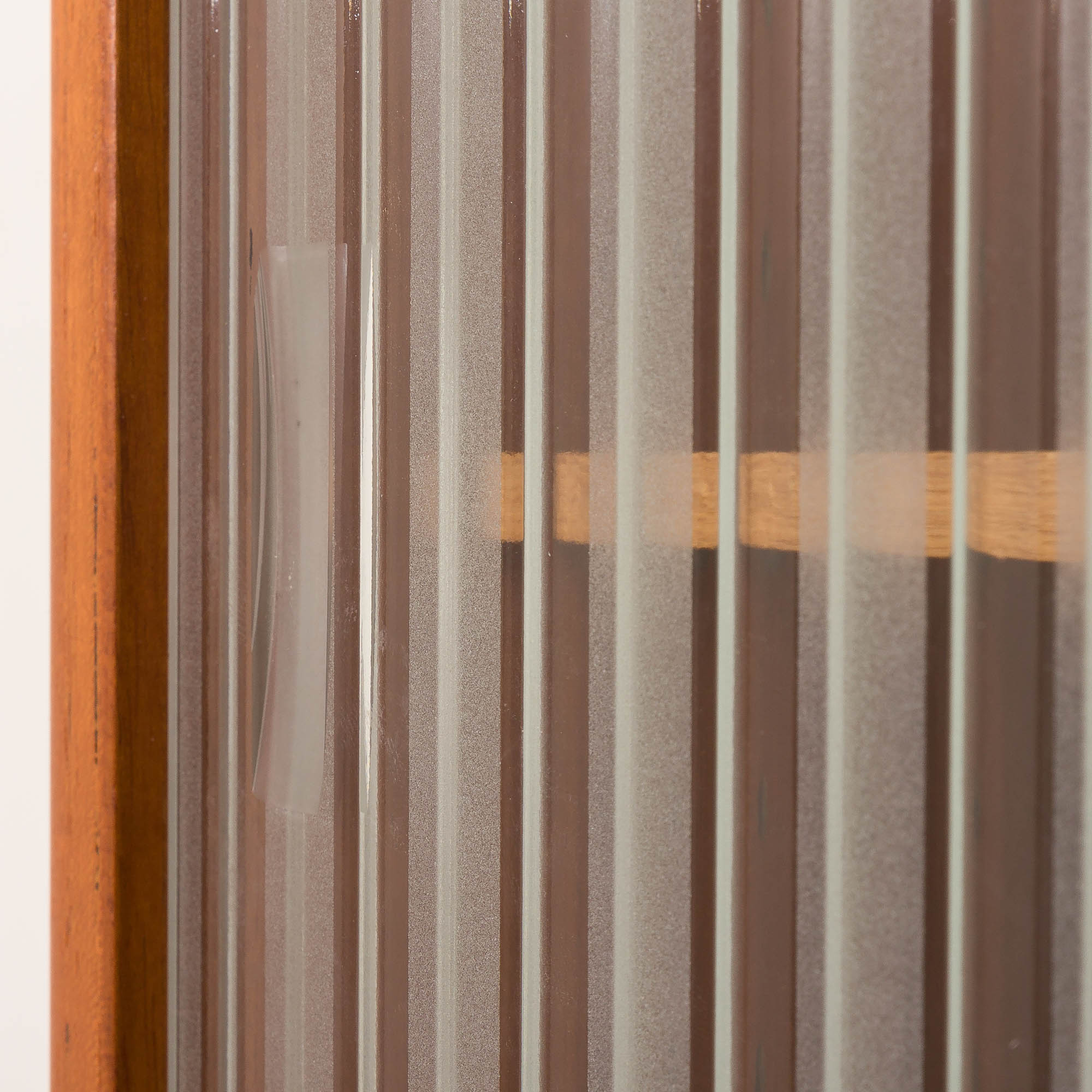 It features six shelves, a display cabinet, and a sliding-door cabinet. The unique part of the set is the teak-veneered decorative montage walls in great condition. This set can easily serve both in an office space and in a living or dining room, introducing warm wood tones to the interior.
