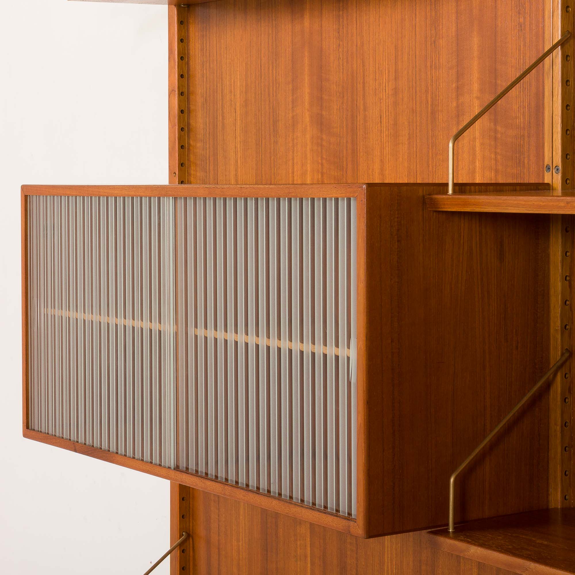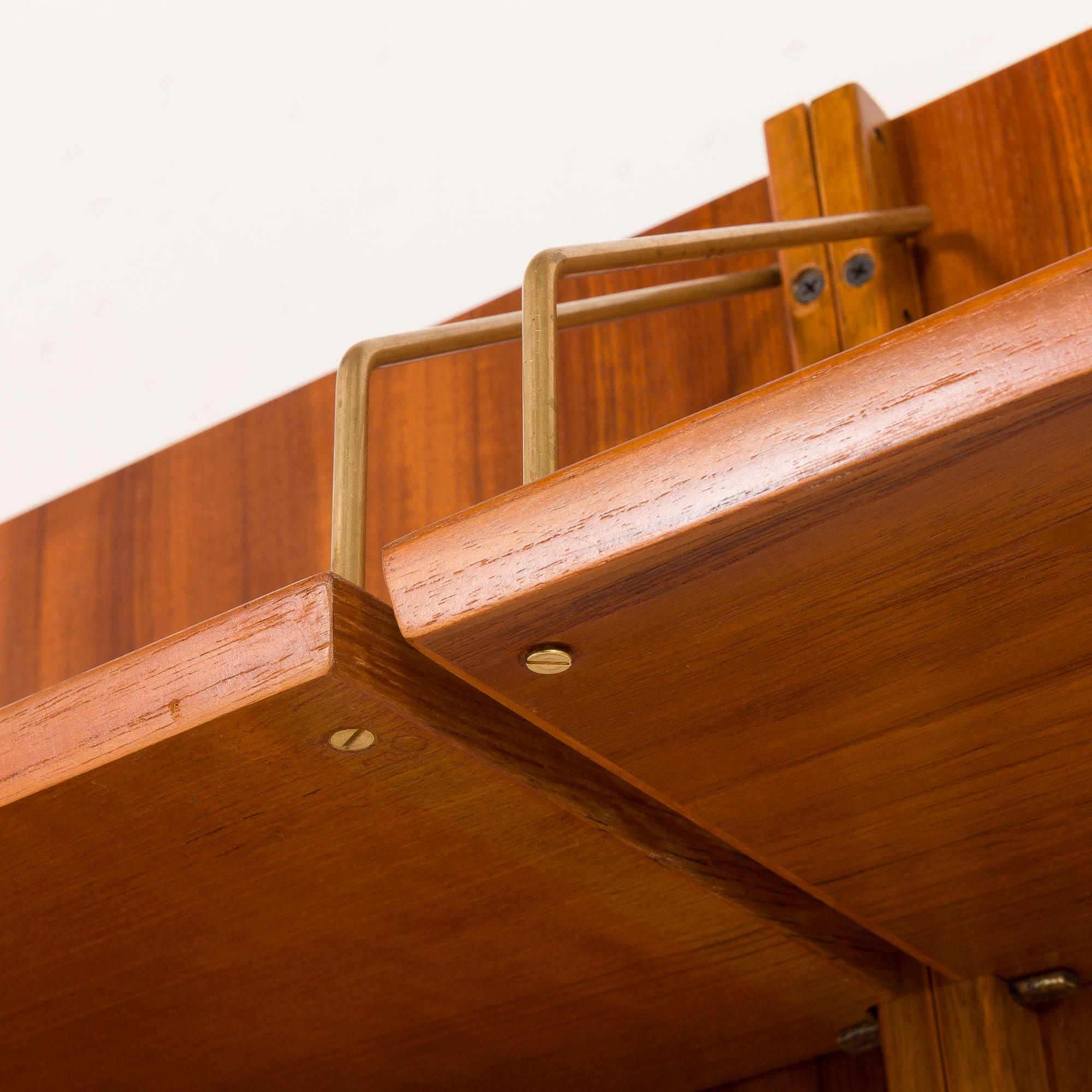 Rare and absolutely spectacular wall unit made by Hansen and Guldborg and designed by designed by Thygesen & Sørensen comes from the 1960s. Constructed from rich teak wood and teak veneer, it showcases the warm tone and grain that define Scandinavian furniture of the era. Out of 100 H&G wall units only a few are on panels. Further more they usually are being destroyed during dissasmbly.