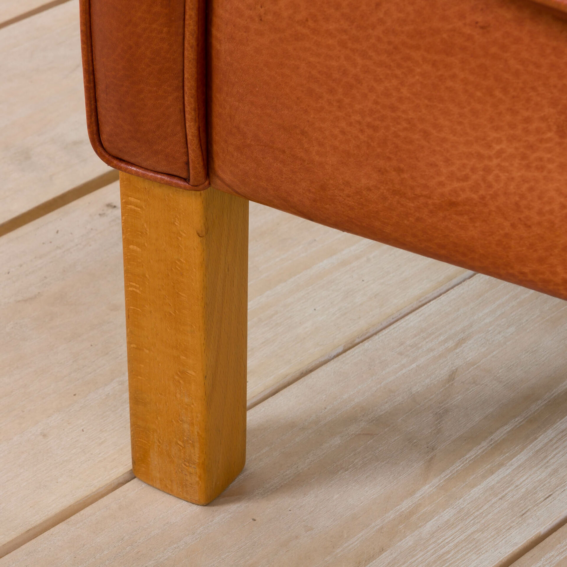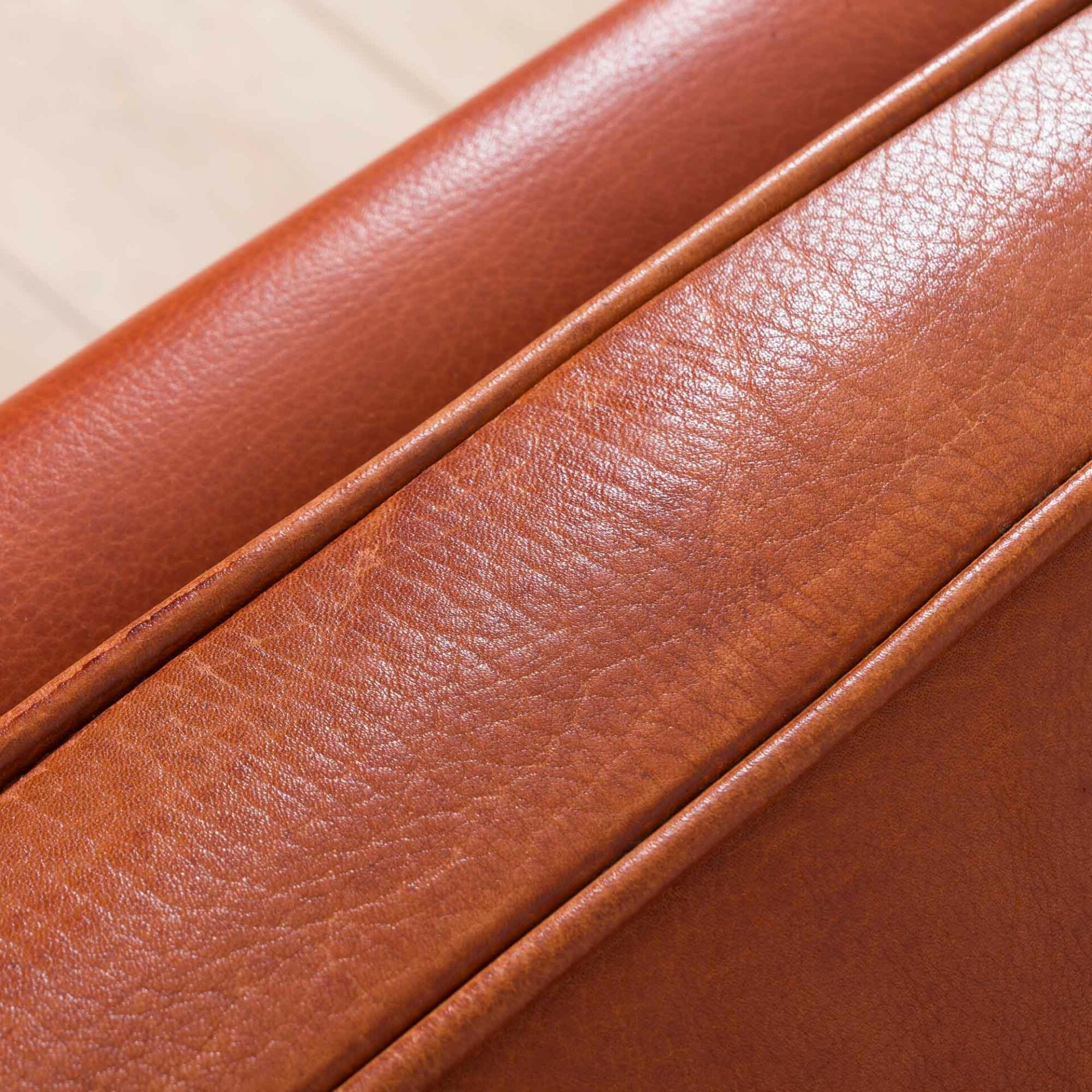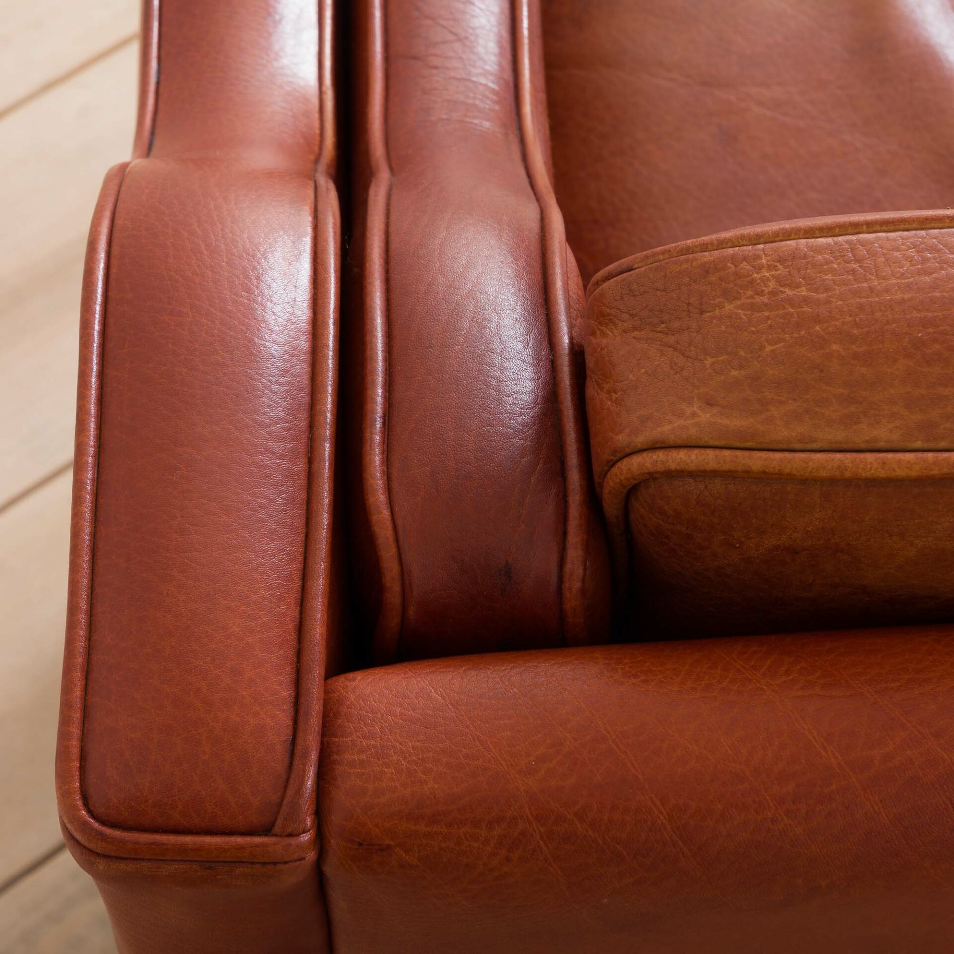Ta sofa Mogens Hansen to uosobienie najwyższej jakości duńskiego klasycznego designu z połowy XX wieku. Sofa wykonana jest z grubej, brązowej skóry anilinowej o czerwonawym odcieniu ze wspaniałą patyna, ma 8 poduszek zapinanych na zamek z tyłu. Nogi wykonane są z buku, natomiast materiał pod skórą to dobrze znana satynowa podszewka Morgens Hansen. Na skórze jest kilka drobnych plam, niemniej wpisują się one w całościowy wygląd vintage i psują do jej estetyki. Na podszewce również jest niewielka plama, ale ogólny stan jest bardzo dobry, bez przetarć i dziur. Gotowa do dlugiego używania.