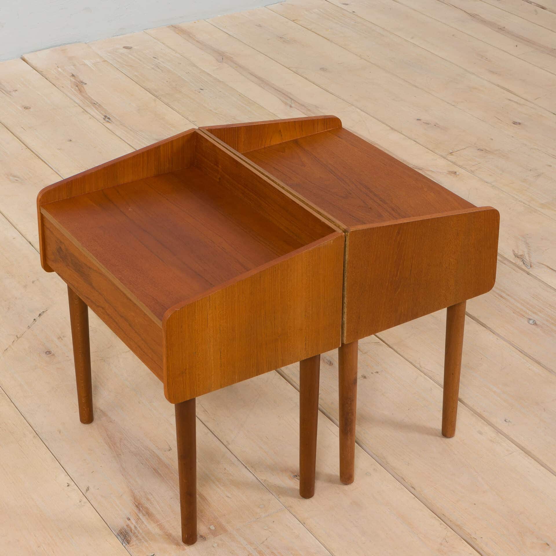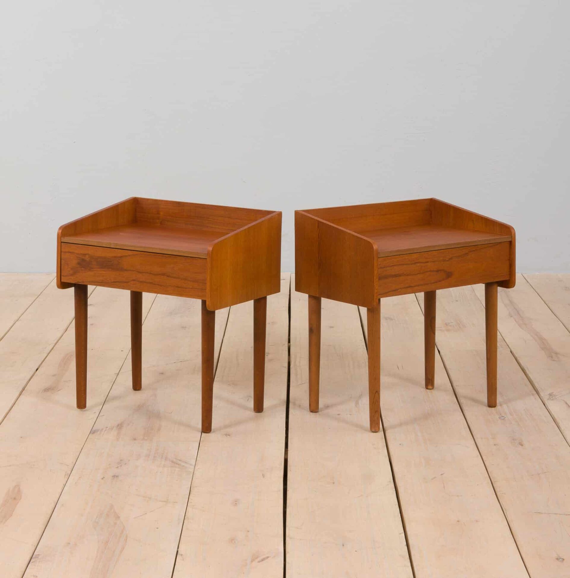 Minimalistyczny a zarazem elegancki zestaw dwóch Duńskich stolików nocnych pochodzi z lat 70. Mocno przypomina styl projektów Børge Mogensena z tego samego okresu. Stoliki wykonane są z forniru tekowego z detalami z litego drewna tekowego, każdy posiada małą, czystą szufladę (6 cm wysokości). Stolarka jest dopracowane do najmniejszego szczegółu i wraz ze zwęzanymi nogami z litego drewna tekowego, eksponują lekkość duńskiego wzornictwa stylu mid-century. Nogi są wykręcane dla wygodniejszego transportu. Doskonały oryginalny stan vintage z absolutnie niewielkimi śladami użytkowania, drewno odświeżone Duńskim olejem.