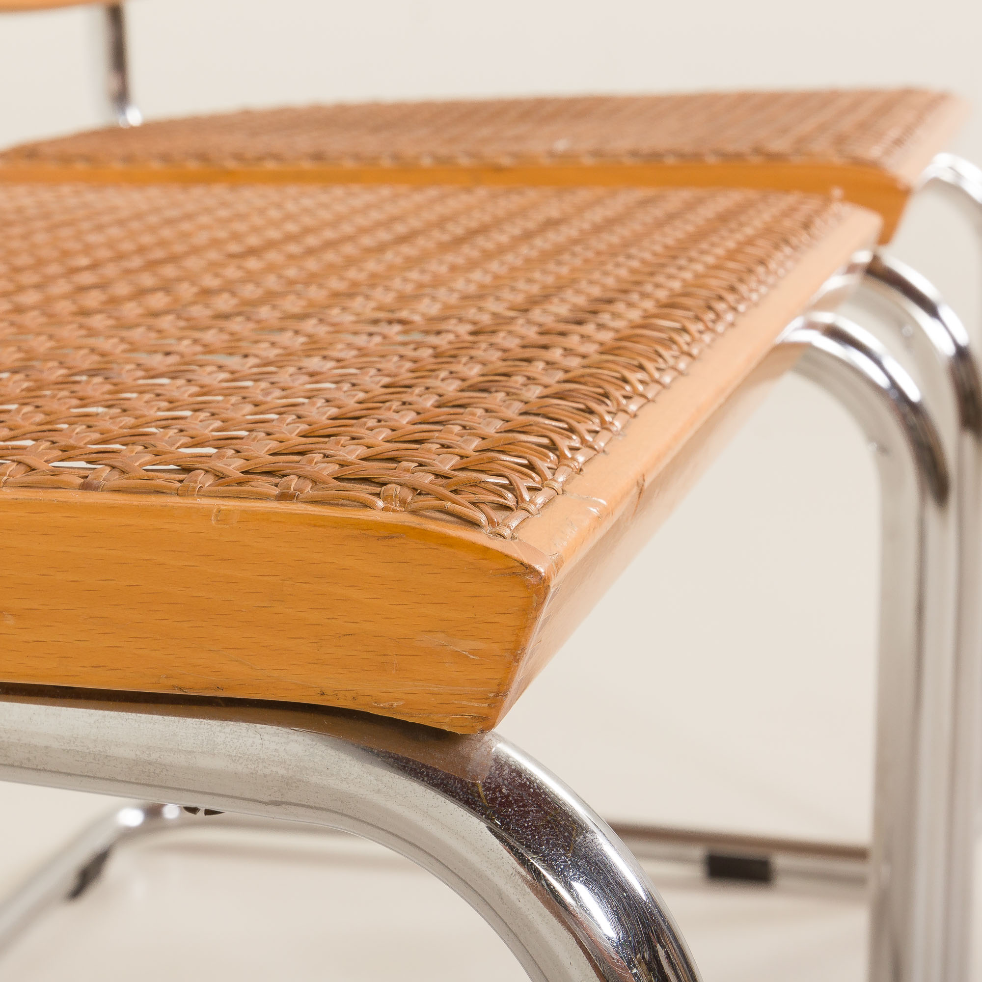Oryginalne siedziska i oparcia Gavina były ręcznie plecione. W tym krześle włókna trzciny rattanowej przechodzą przez drewno od spodu w kilku miejscach, potwierdzając jego oryginalne i wczesne pochodzenie. Słoma wiedeńska ma bursztynowy odcień, który pogłębia się w urocze pomarańczowo-brązowo-czerwone odcienie. Starannie połączona rama z naturalnego drewna bukowego uzupełnia ciepły wygląd i zapewnia integralność strukturalną krzesła. Połączenie stali, buku i trzciny podkreśla równowagę między elementami industrialnymi i organicznymi, którą Breuer opanował do perfekcji.