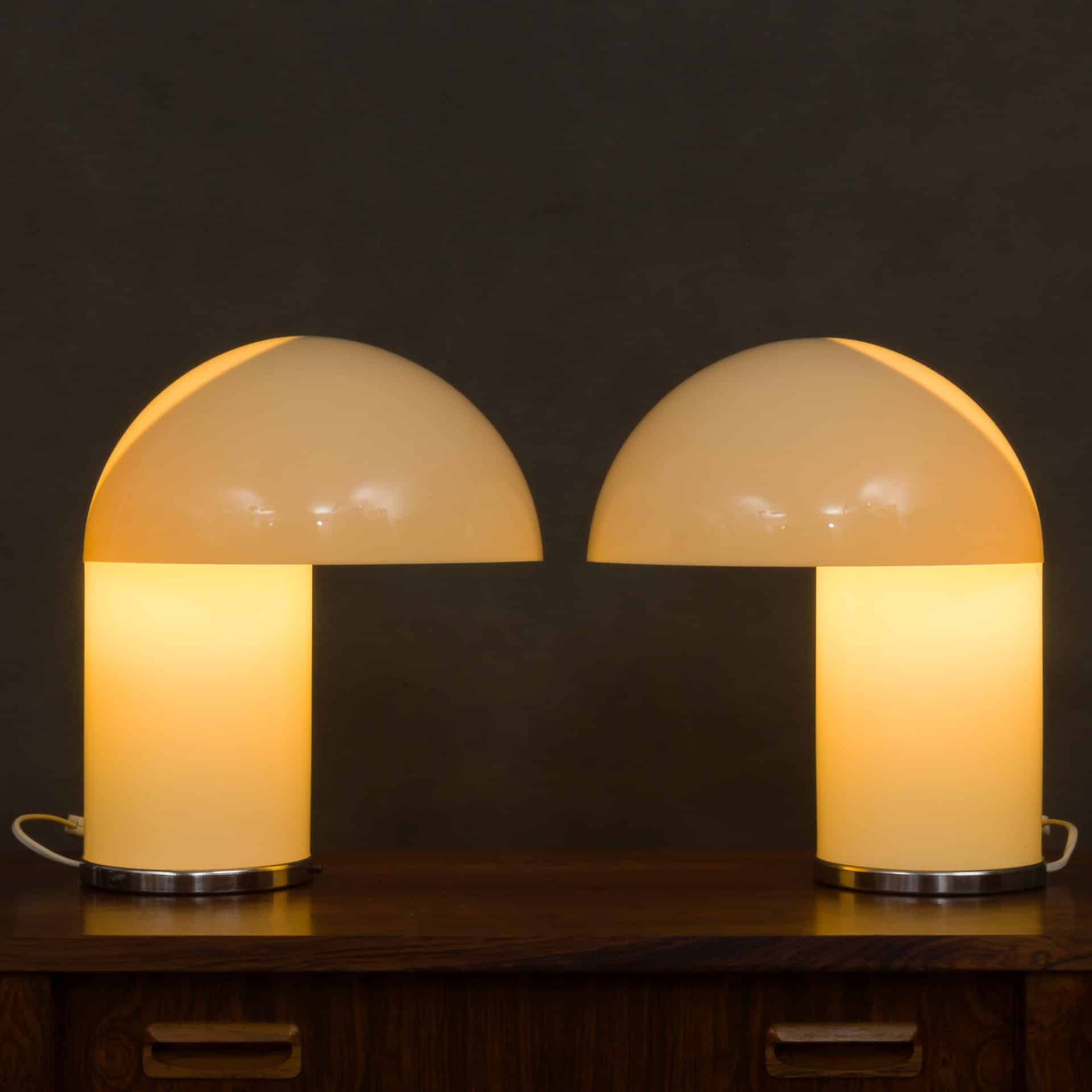 Para lamp stołowych w stylu vintage zaprojektowanych przez Vernera Pantona i Marcello Siarda i wyprodukowanych w Padwie przez Collezioni Longato w latach 60-tych. Wykonane są z akrylu z chromowaną podstawą. Świetny oryginalny stan.