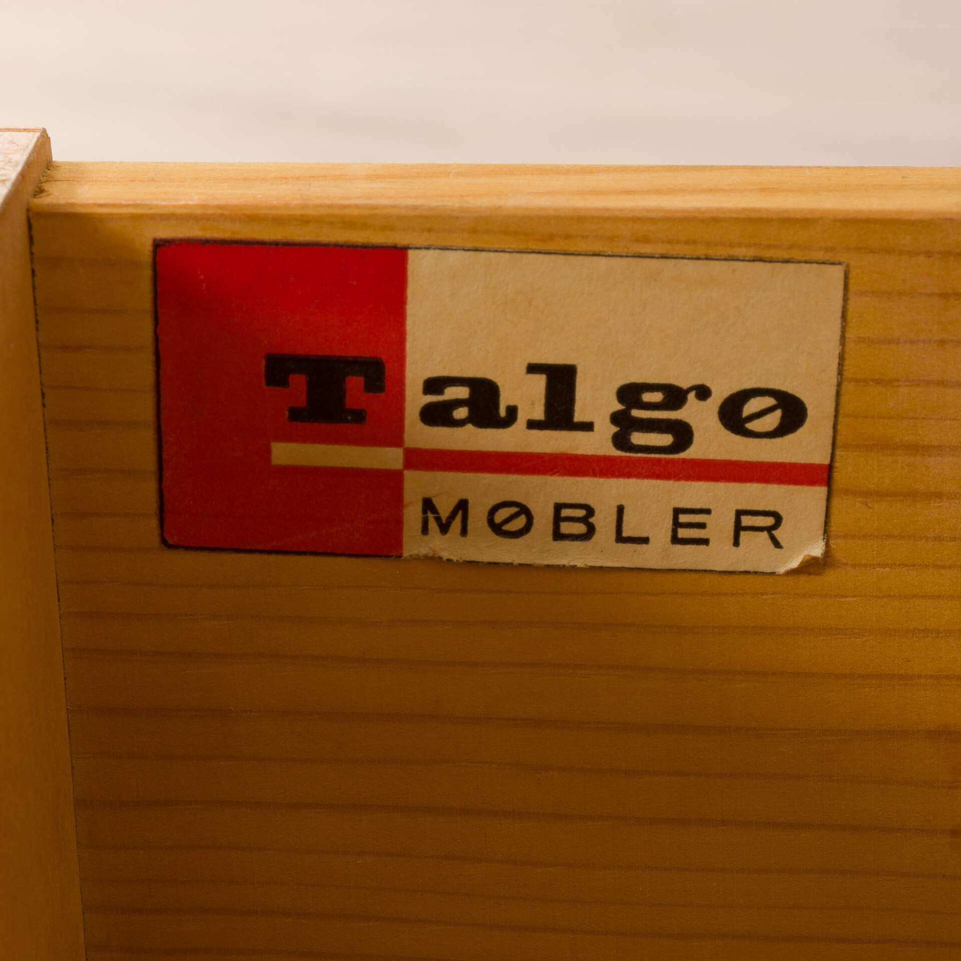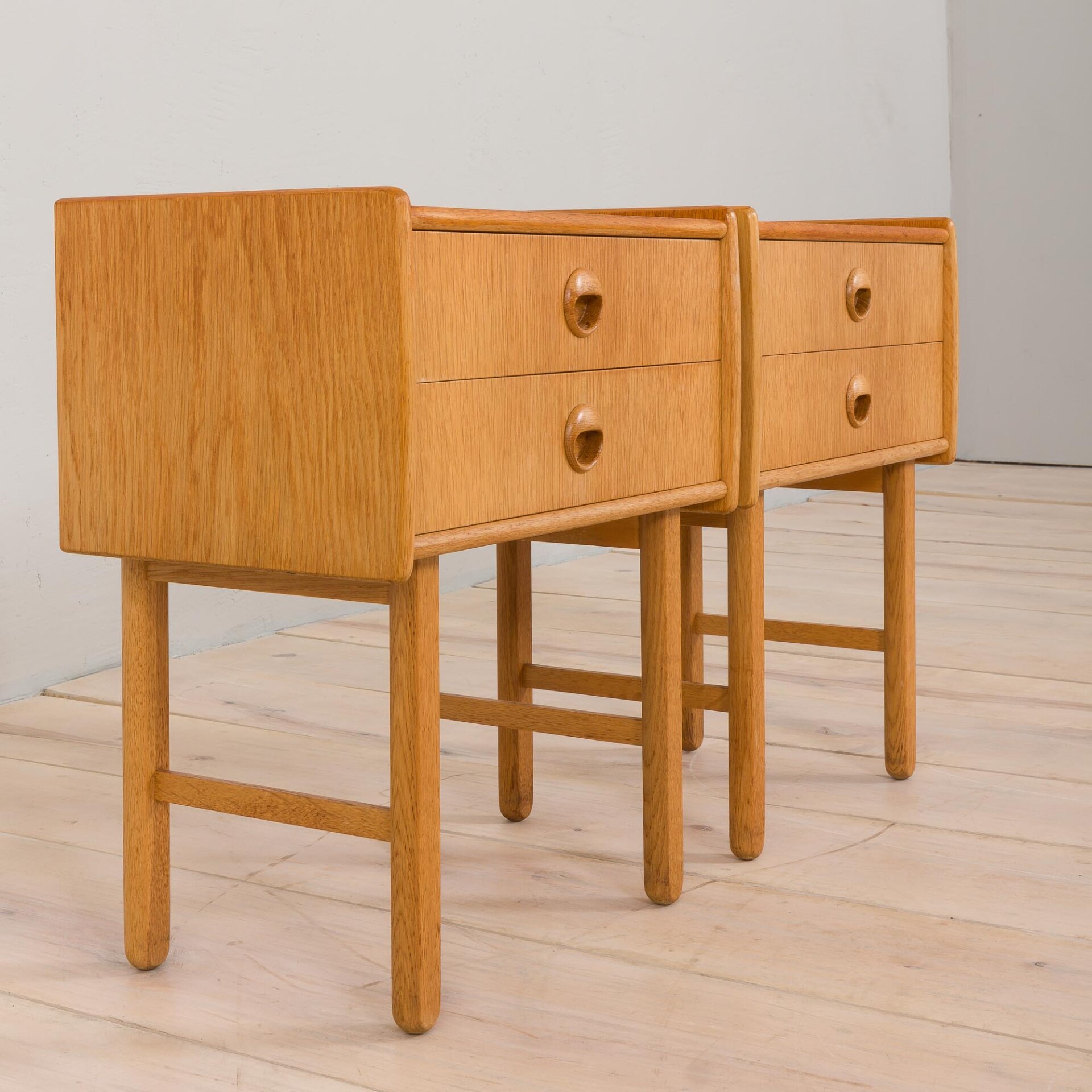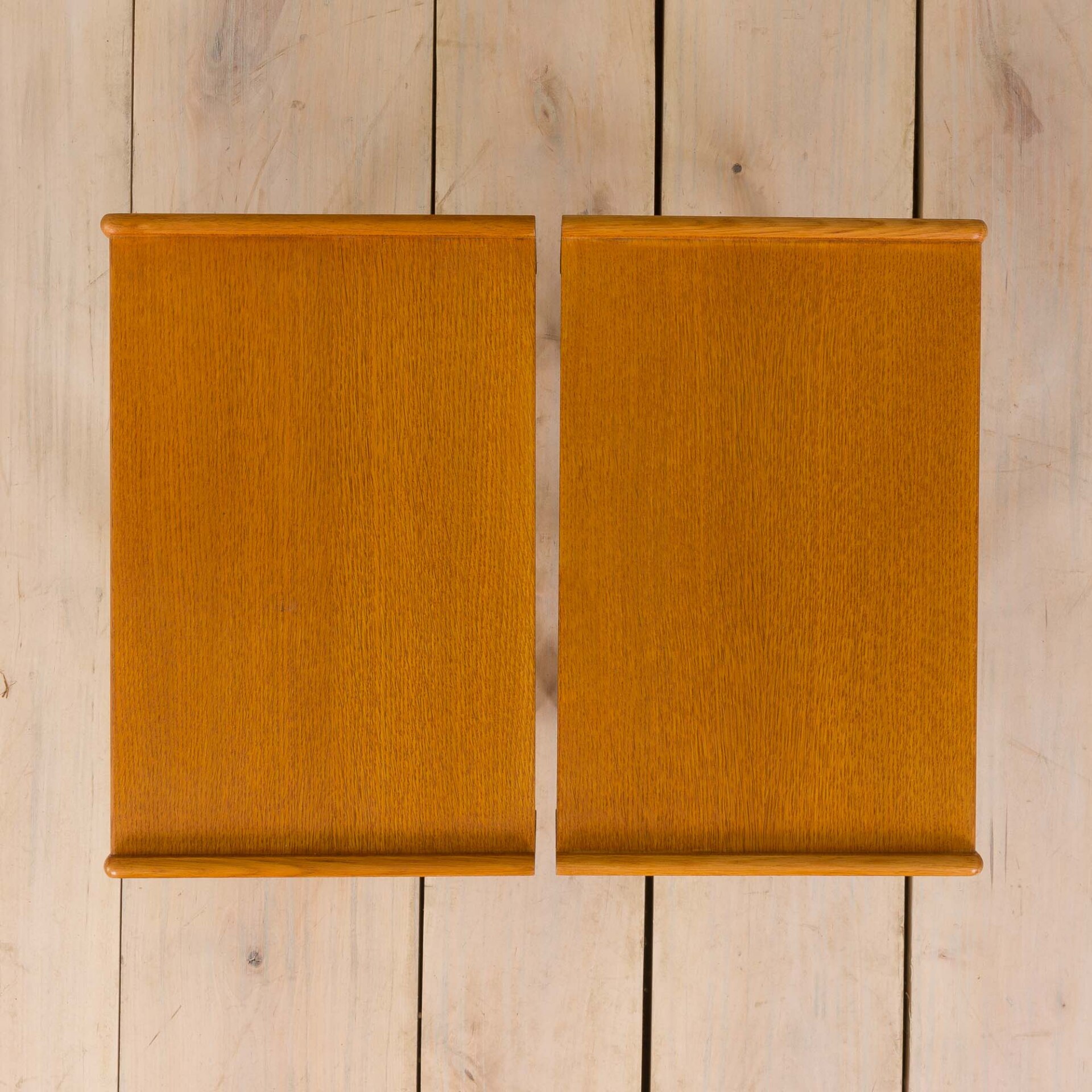Zestaw 2 szafek nocnych vintage został wyprodukowany przez norweskiego producenta Talgo Mobler w latach 60-tych. Zachowana oryginalna etykieta. Każdy ze dębowych stolików nocnych posiada dwie czyste szuflady z rzeźbionymi uchwytami z litego drewna. Prosta forma i jakość stolarki pokazują mistrzostwo skandynawskiego designu z okresu mid-century i wzbogacą każdą sypialnię. Fantastyczny stan vintage po lekkim odświeżeniu.