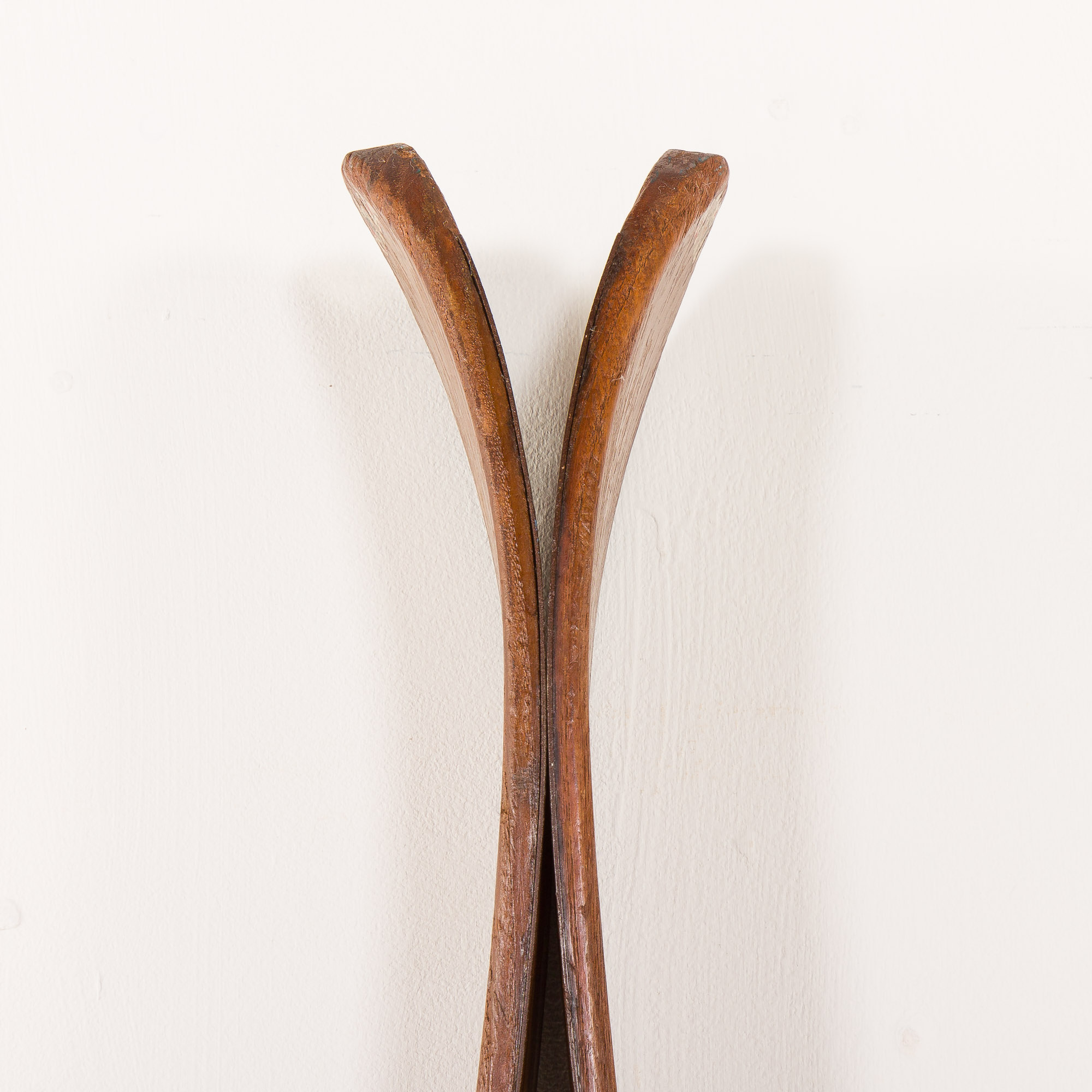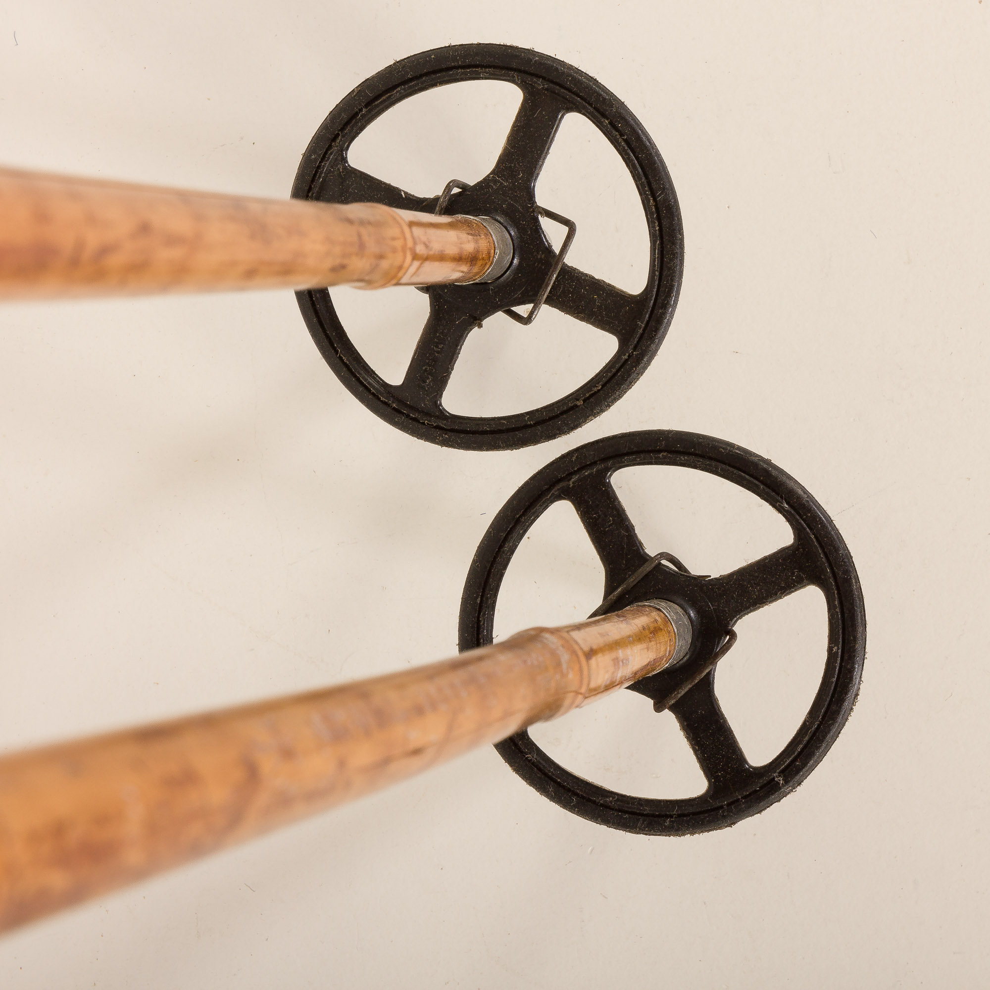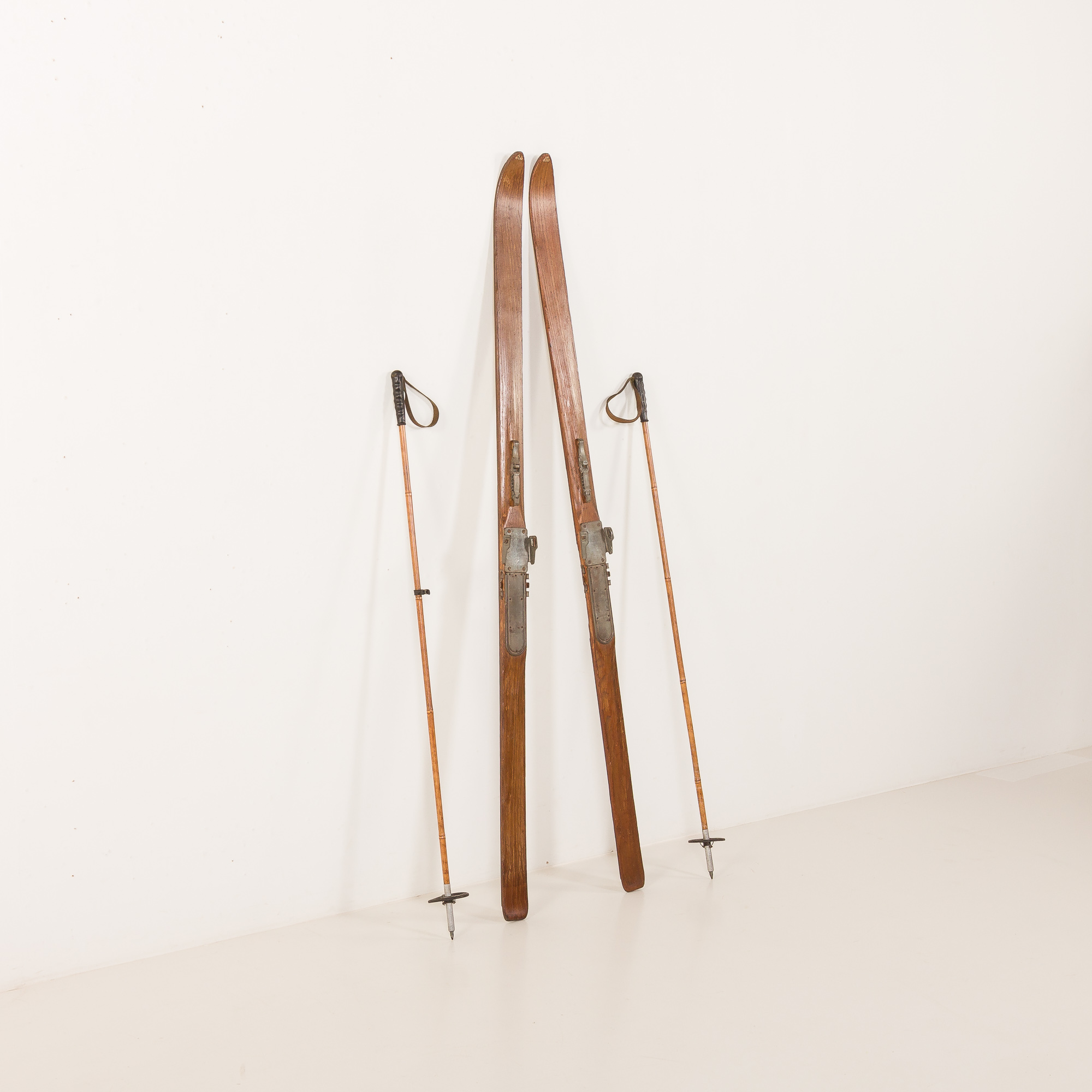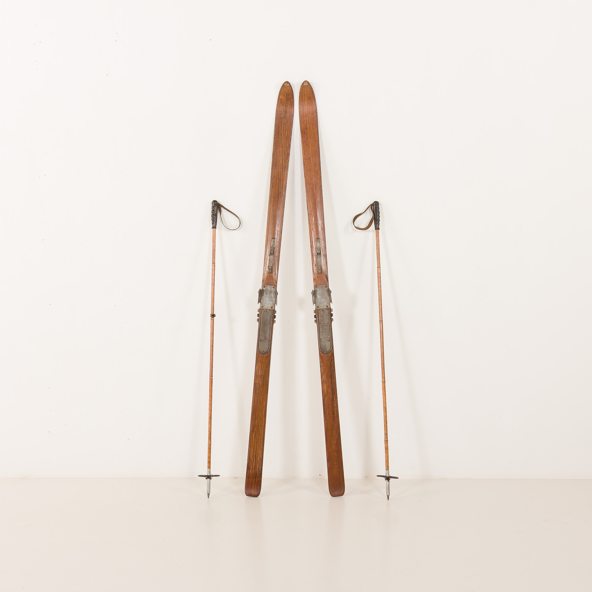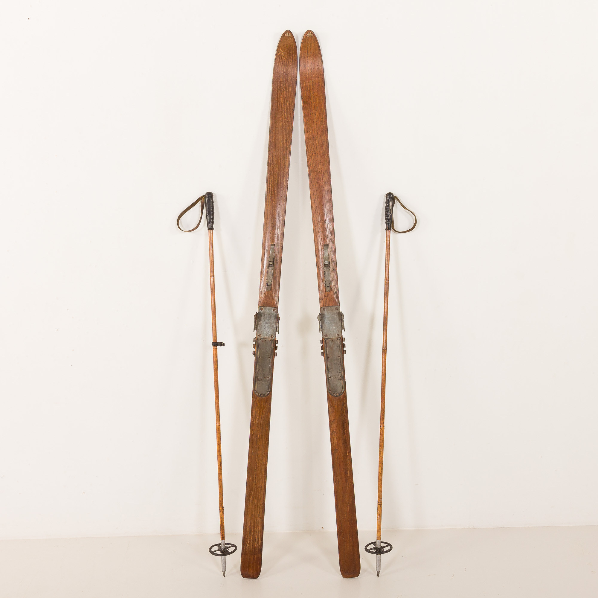 Para drewnianych nart zjazdowych, najprawdopodobniej wyprodukowanych pod koniec lat 50. lub na początku lat 60. Konstrukcja wykonana jest z jesionu; narty są wyposażone w oryginalne bambusowe kijki firmy Cober ze skórzanymi paskami na nadgarstki. Ten elegancki, dobrze zachowany zestaw reprezentuje kunszt i design sprzętu alpejskiego z XIX i XX wieku – idealne połączenie funkcjonalności, trwałości i stylu. Nie można już na nich jeździć, ale stanowią fantastyczną ozdobę górskiego domku, salonu lub prezent dla każdego miłośnika narciarstwa.