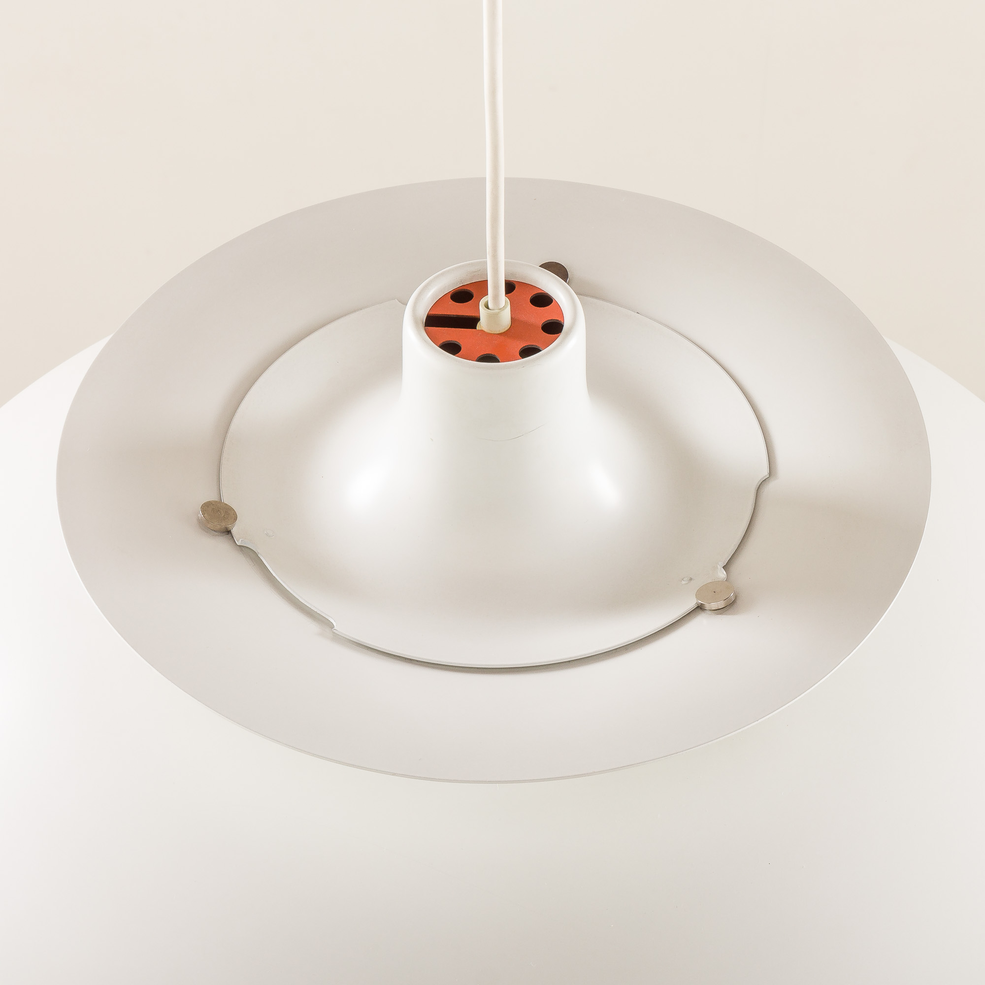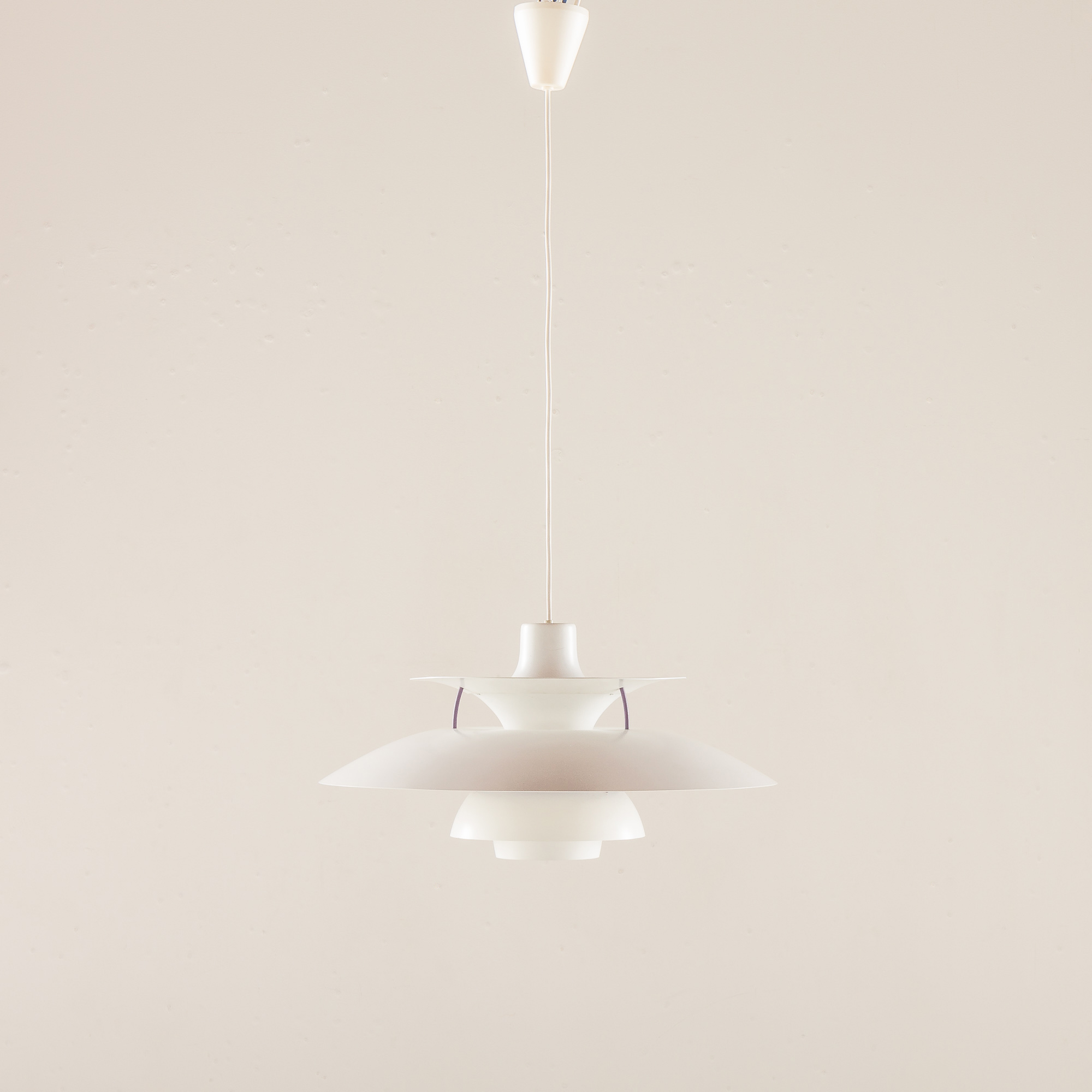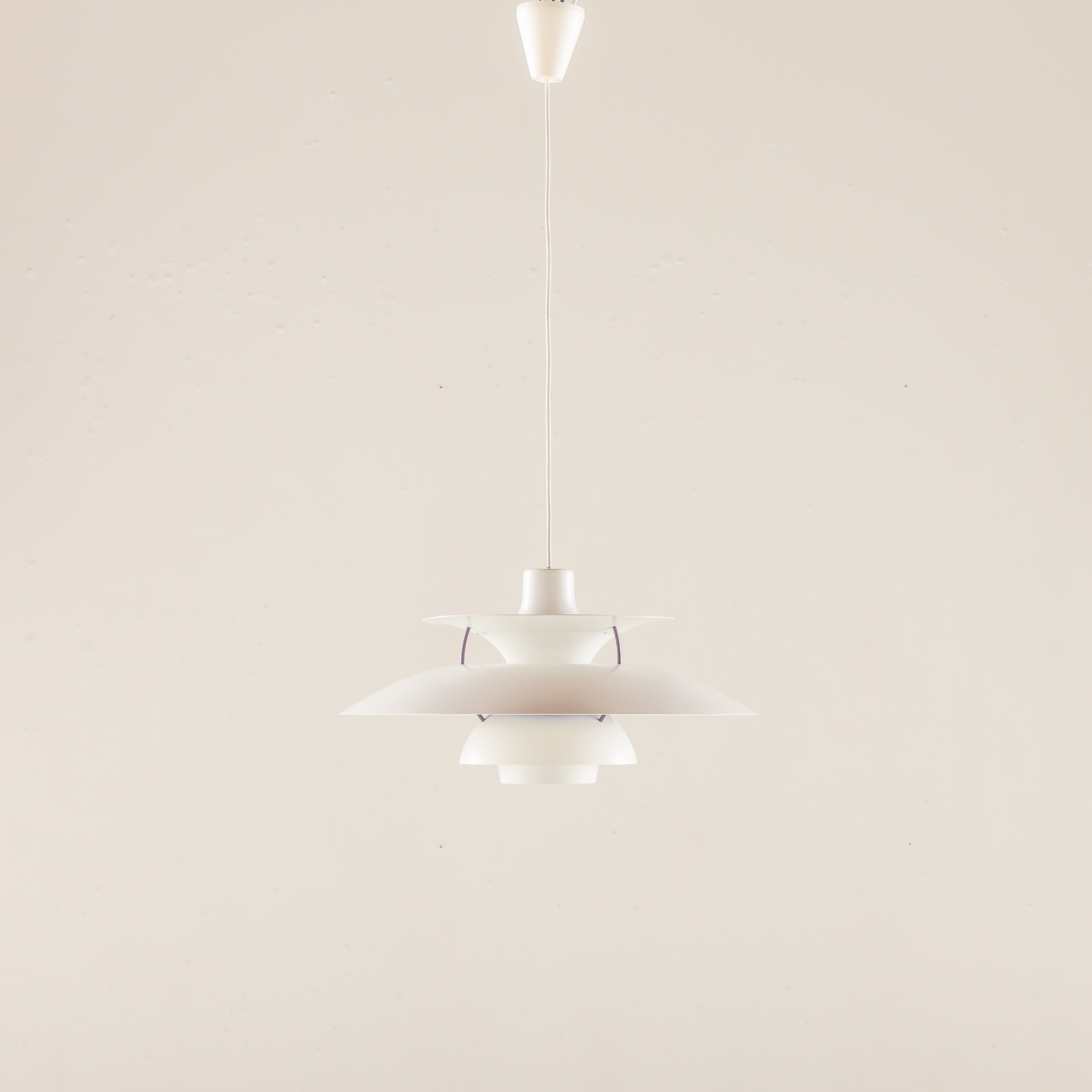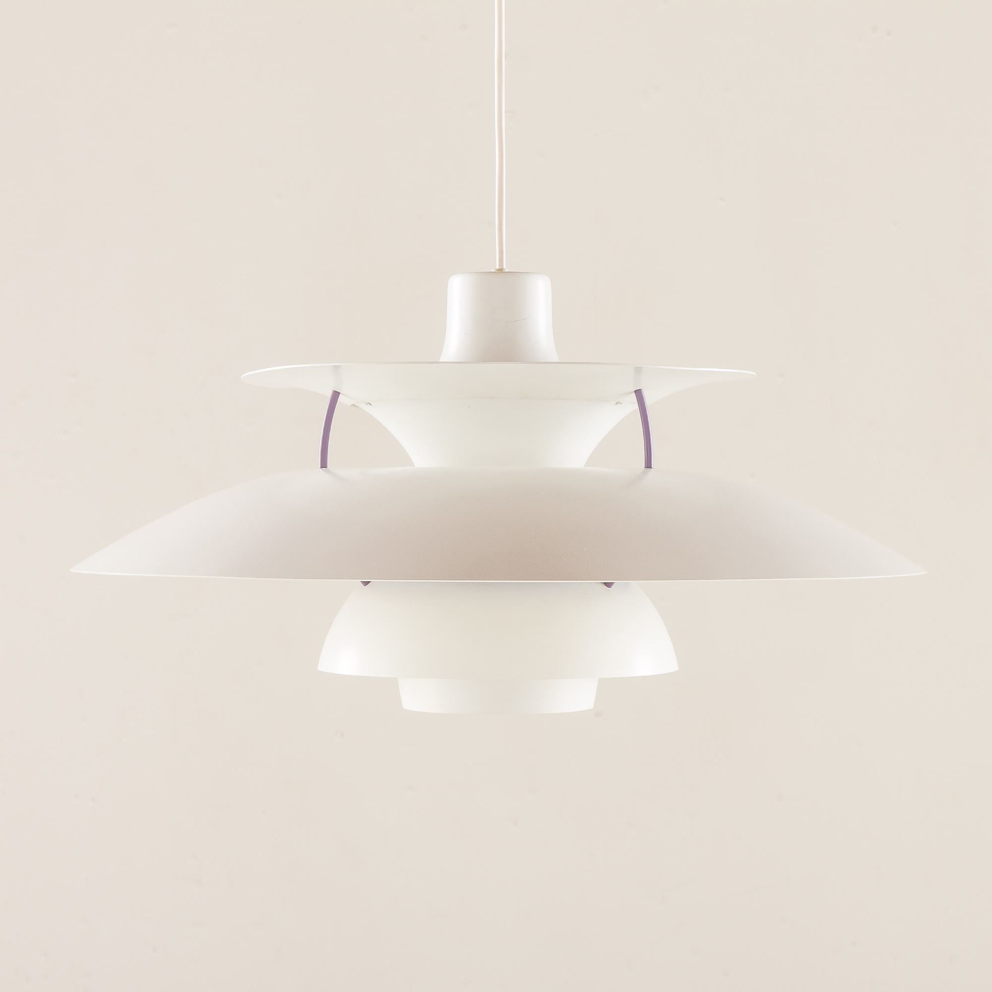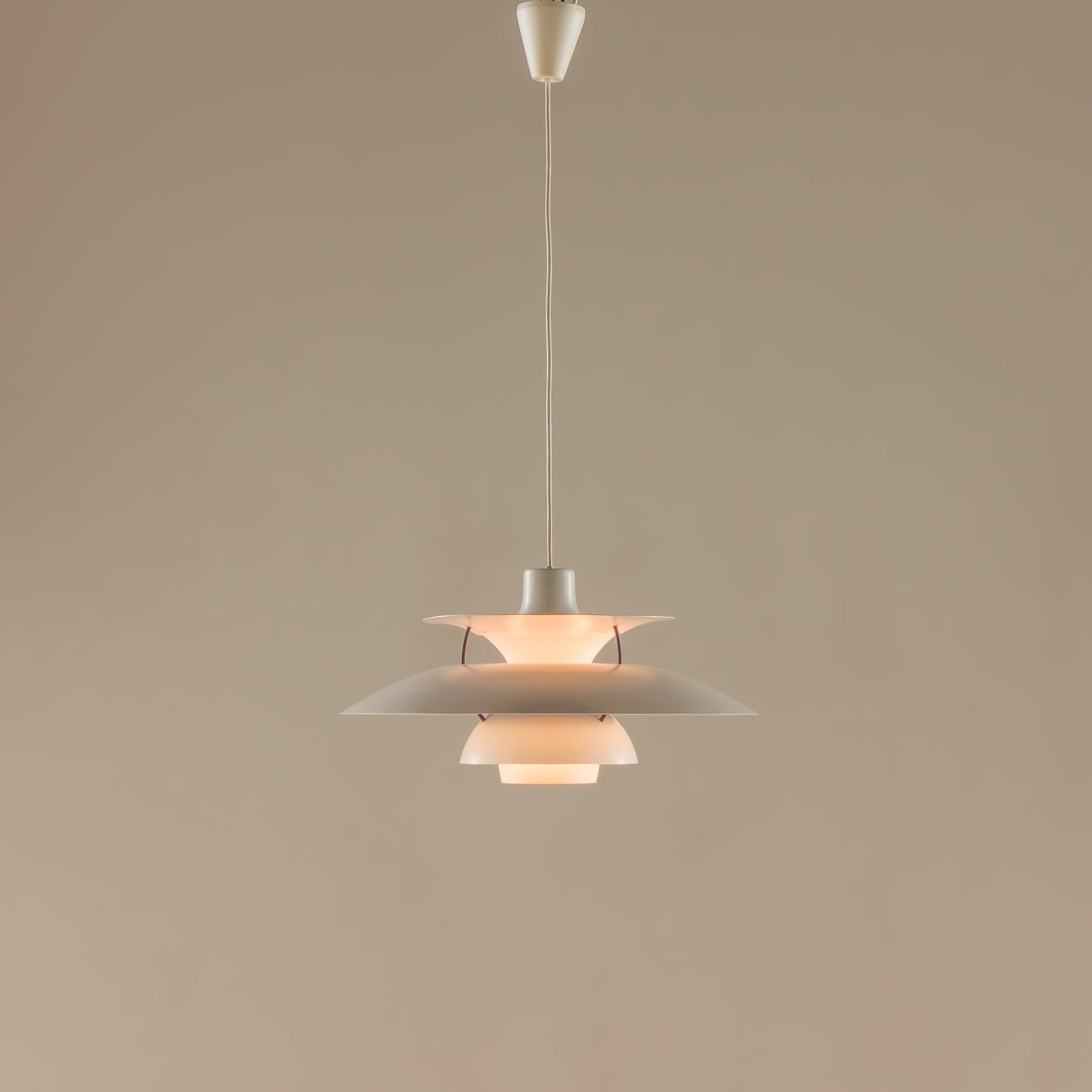 Ta konkretna lampa PH5 pochodzi najprawdopodobniej z lat 70., ale model ten jest jednym z najsłynniejszych projektów lamp wiszących pochodzących z Danii, stworzonym przez architekta Poula Henningsena dla producenta oświetlenia Louisa Poulsena. Po raz pierwszy wprowadzona na rynek w 1958 roku, PH5 stała się od tamtej pory ikoną wzornictwa modernistycznego mid-century. Celem projektu PH5 było zapewnienie oświetlenia bez oślepiania, uzyskanego dzięki kloszowi z kilkoma koncentrycznymi kloszami, które rozpraszają światło.