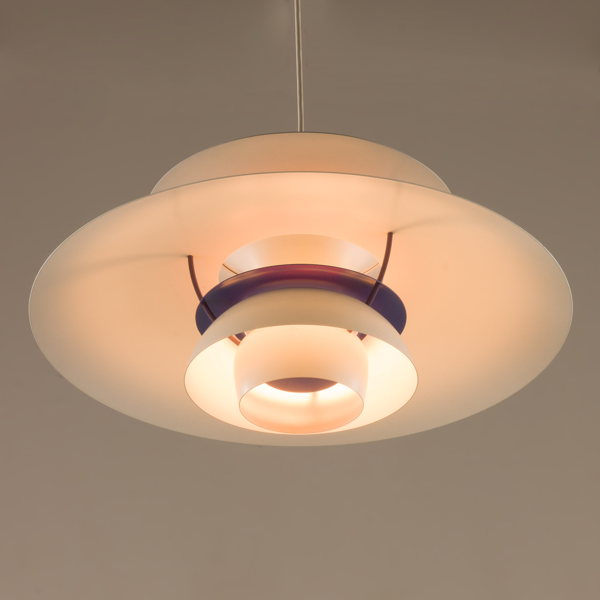 Lampa posiada również zakrzywiony, trąbkowy reflektor, który kieruje światło w dół, tworząc miękką, ciepłą poświatę. Na przestrzeni lat Louis Poulsen produkował PH5 w różnych kolorach, z których najbardziej znanym był biały, a późniejsze edycje w kolorze niebieskim, czerwonym i pomarańczowym. Prezentowana lampa jest biała i charakteryzuje się niebieskimi i pomarańczowymi detalami w konstrukcji.