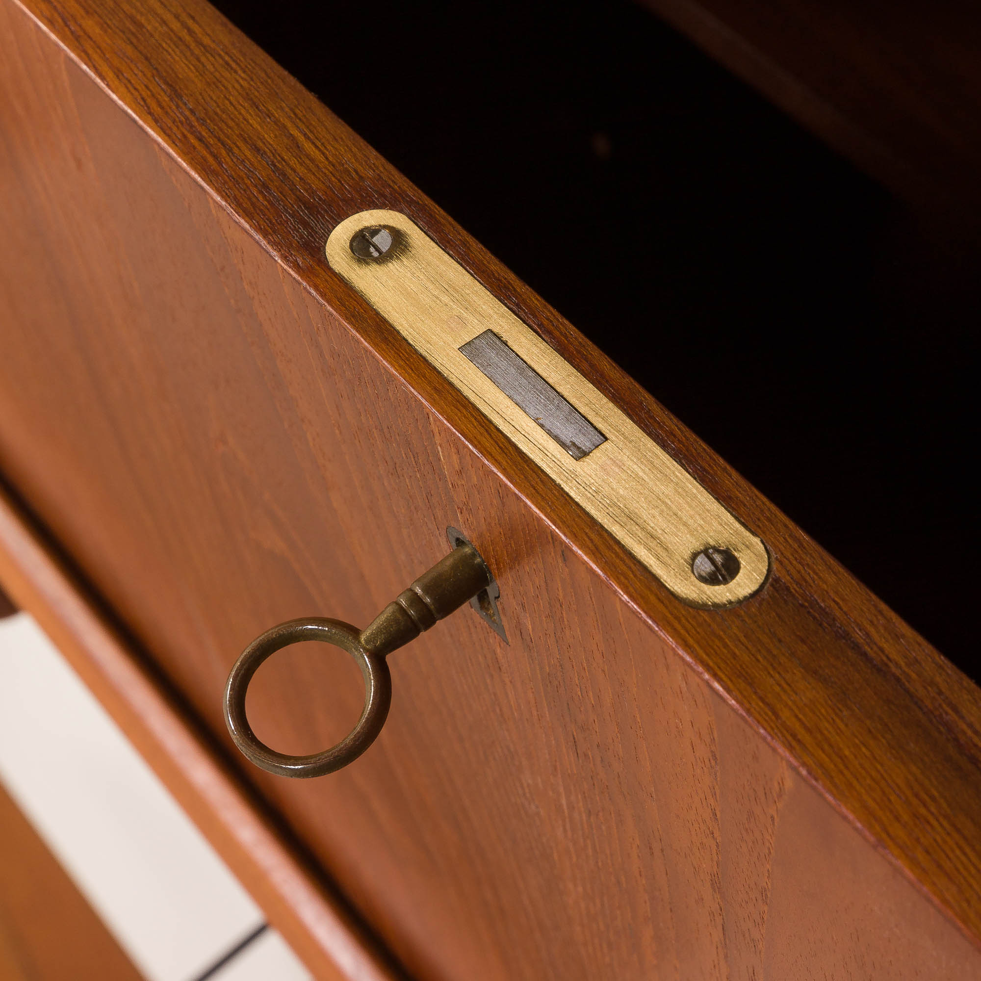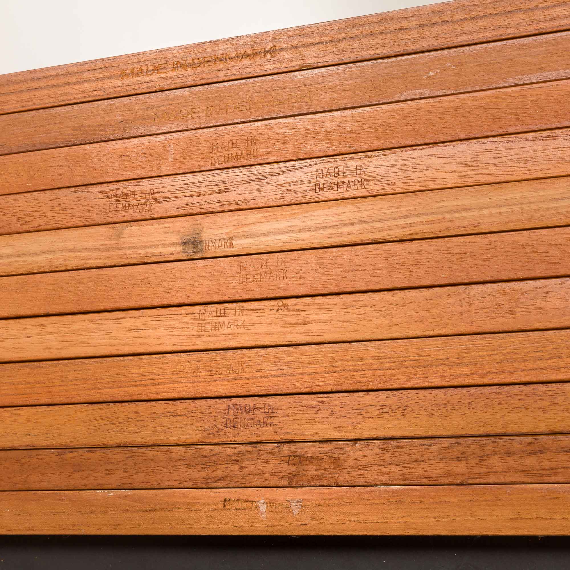 Zaprojektowany jako estetyczny, funkcjonalny i z charakterem zestaw, został wykonany z drewna tekowego w ciepłym odcieniu, prezentując piękny rysunek słojów zarówno na zewnątrz, jak i wewnątrz szafek. Zastosowanie wysokiej jakości drewna i forniru tekowego zapewnia trwałość i długowieczność mebla. Dbałość o szczegóły, najbardziej widoczna w starannie zintegrowanych uchwytach i idealnie połączonych krawędziach, odzwierciedla kunszt duńskiego rzemiosła. Oryginalny grawerunek producenta „made in Denmark” na półkach potwierdza pochodzenie zestawu.