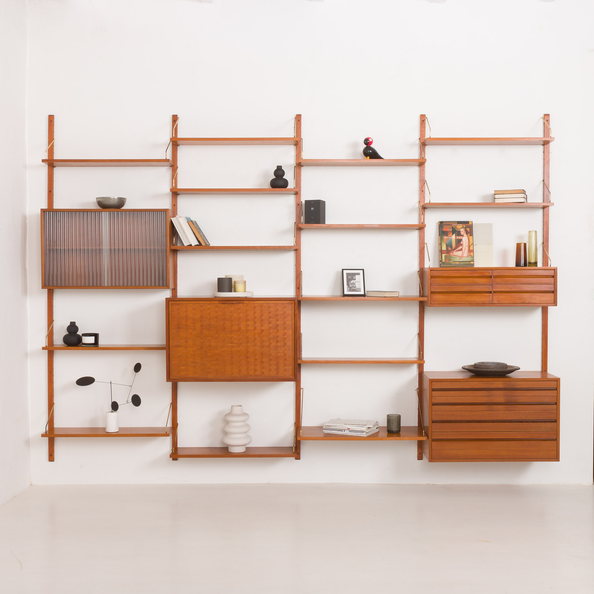 Regał ten jest w pełni modułowy i zapewnia różnorodną aranżację komponentów w zależności od potrzeb. System montażu jest prosty i intuicyjny. Półki montowane są na szynach z litego drewna za pomocą mosiężnych zawieszek, a większe elementy, takie jak komoda, czy konsolka, z wykorzystaniem metalowych pinów lub kołków.