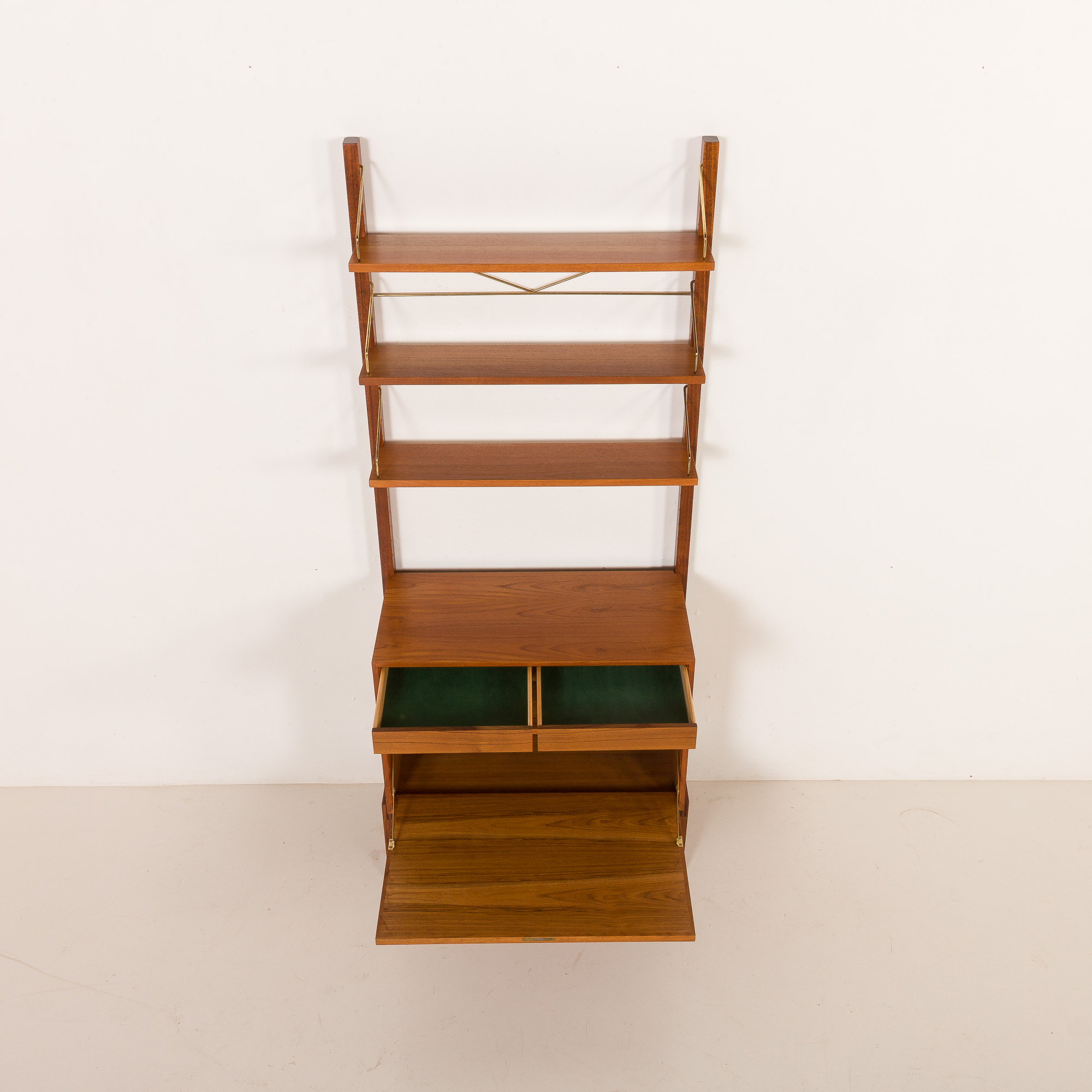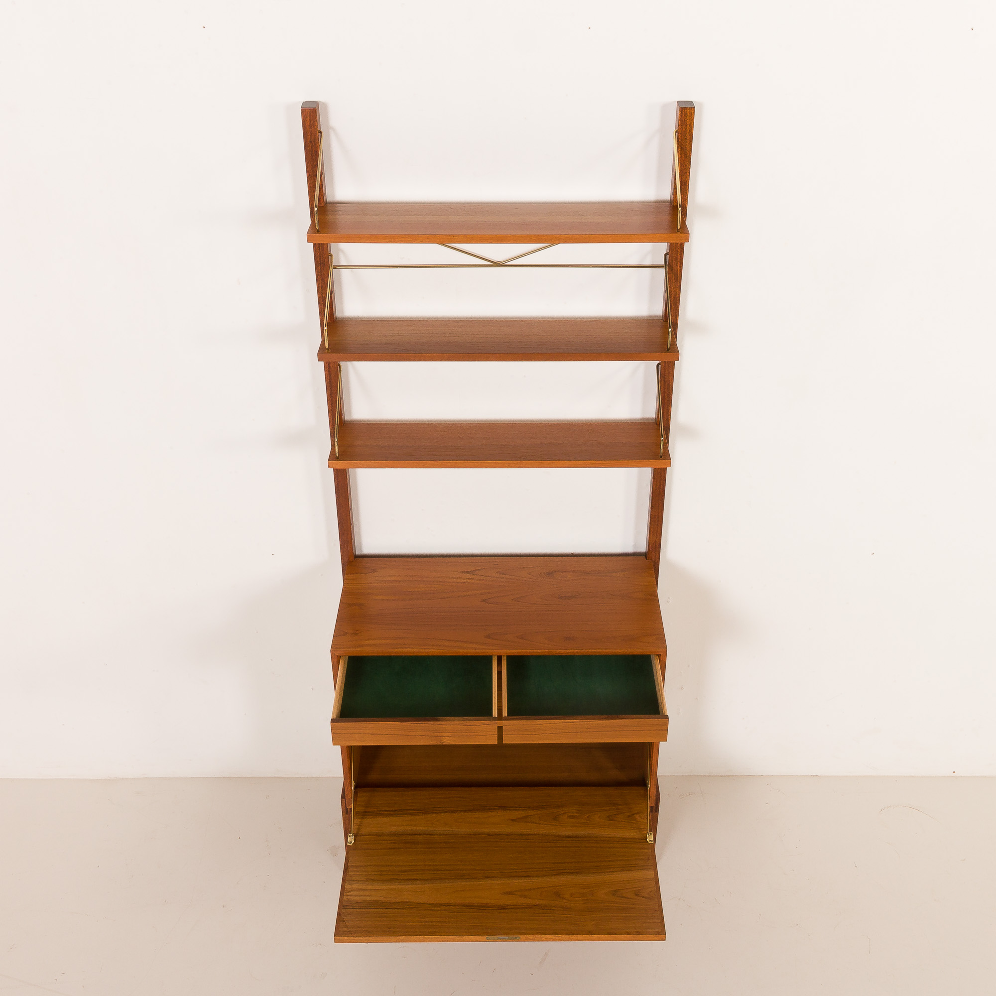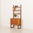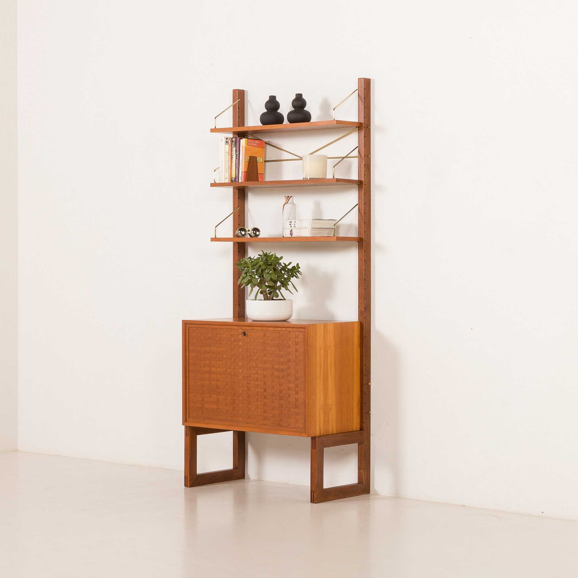 Zestaw stoi na solidnych, litych drewnianych nogach z precyzyjnym łączeniem i unikalnym kształtem płozy. To w pełni modułowy system, który można dowolnie aranżować według własnego gustu. Zestaw zawiera jedną szafkę lub sekretarzyk z opuszczanymi drzwiczkami, który może służyć jako ukryte biurko. Dzięki wewnętrznej półce na dokumenty, laptopy i akcesoria, stanowi doskonałą alternatywę dla tradycyjnego biurka i idealnie nadaje się do stworzenia dyskretnej przestrzeni biurowej w salonie. Charakterystyczny dla projektu Cadoviusa, front zdobią cienkie paski drewna tekowego, które można znaleźć w większości jego regałów, a także w meblach takich jak sofa Governor. Trzy półki idealnie nadają się do eksponowania książek i innych akcesoriów.