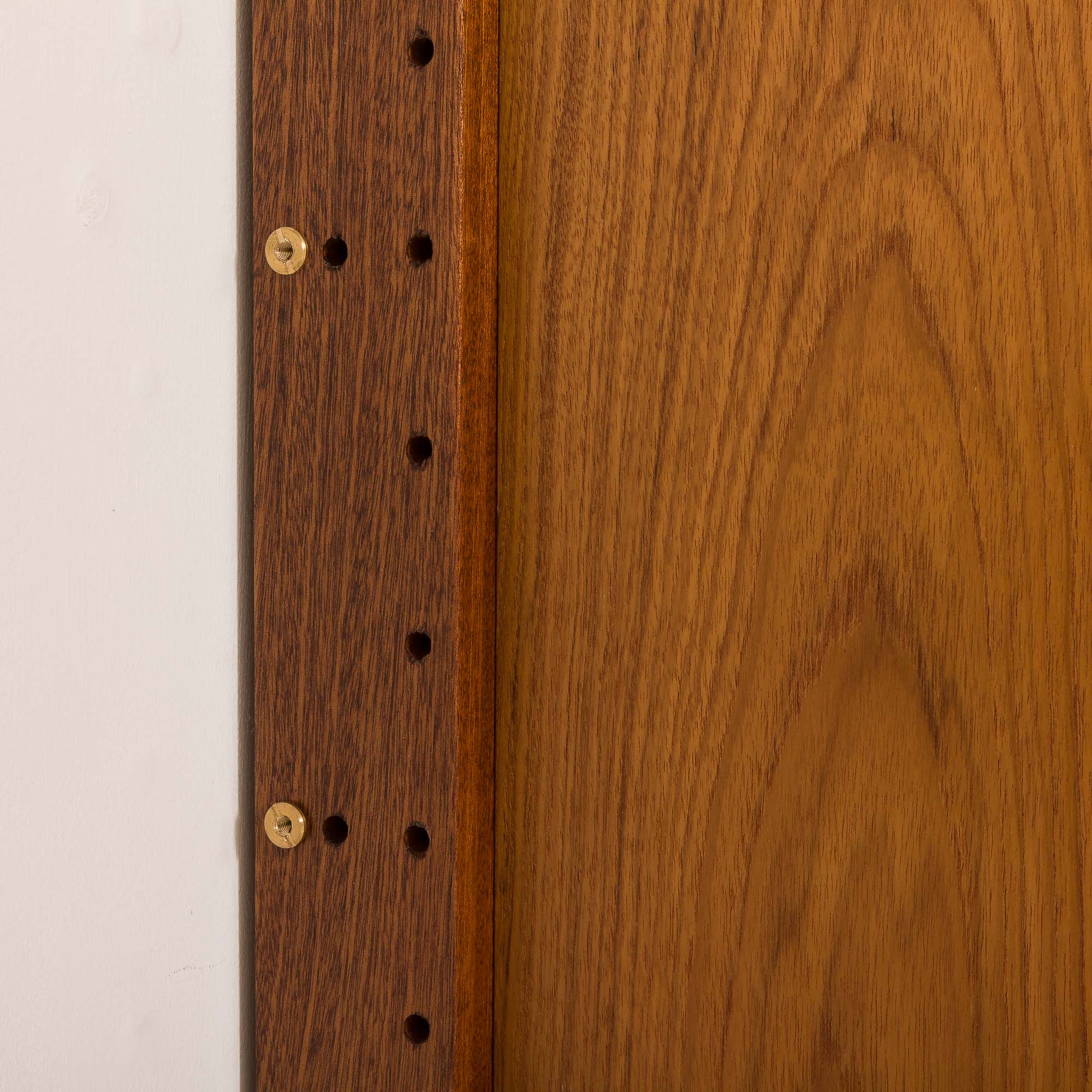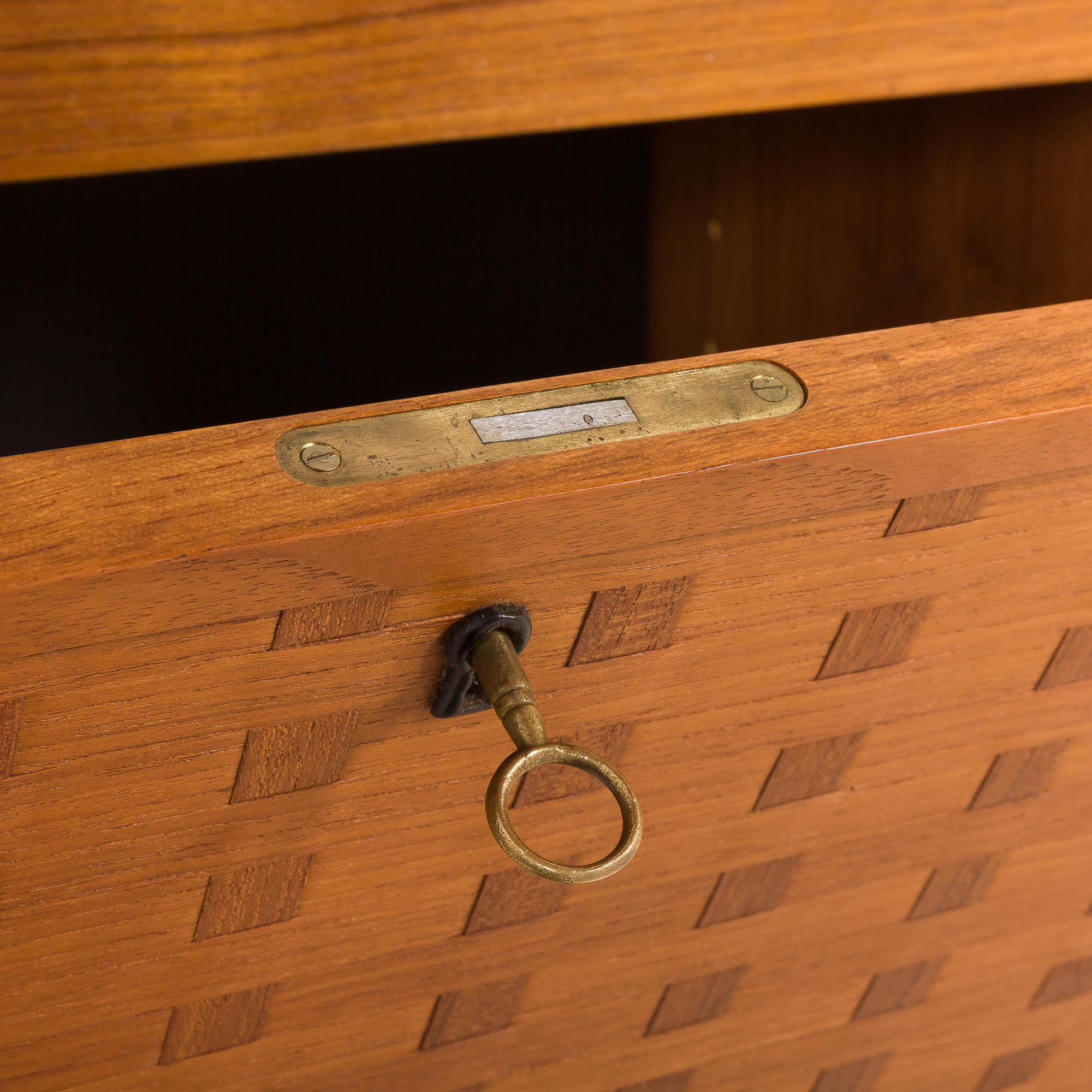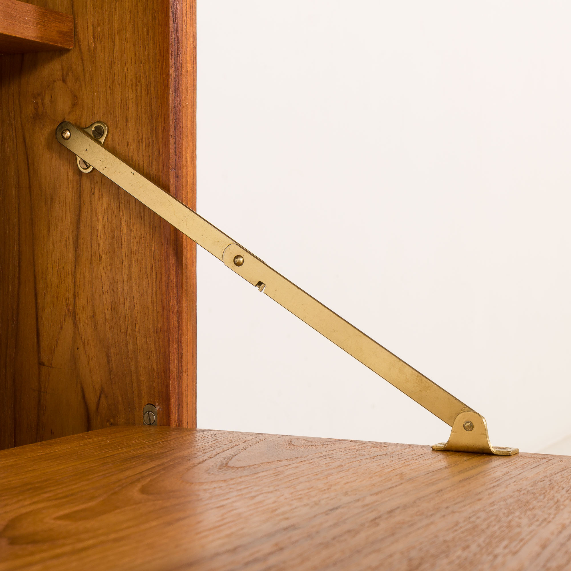 Zestaw stoi na solidnych, litych drewnianych nogach z precyzyjnym łączeniem i unikalnym kształtem płozy. To w pełni modułowy system, który można dowolnie aranżować według własnego gustu. Zestaw zawiera jedną szafkę lub sekretarzyk z opuszczanymi drzwiczkami, który może służyć jako ukryte biurko. Dzięki wewnętrznej półce na dokumenty, laptopy i akcesoria, stanowi doskonałą alternatywę dla tradycyjnego biurka i idealnie nadaje się do stworzenia dyskretnej przestrzeni biurowej w salonie. Charakterystyczny dla projektu Cadoviusa, front zdobią cienkie paski drewna tekowego, które można znaleźć w większości jego regałów, a także w meblach takich jak sofa Governor. Trzy półki idealnie nadają się do eksponowania książek i innych akcesoriów.