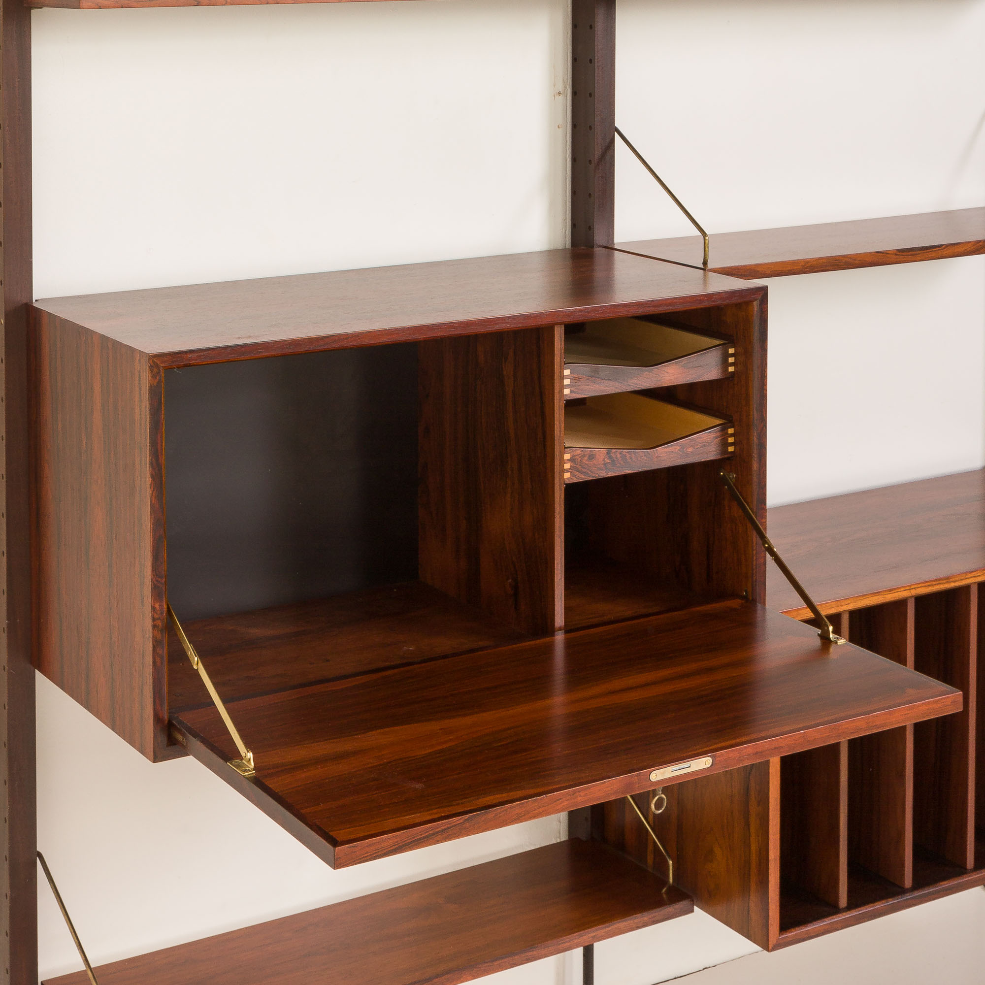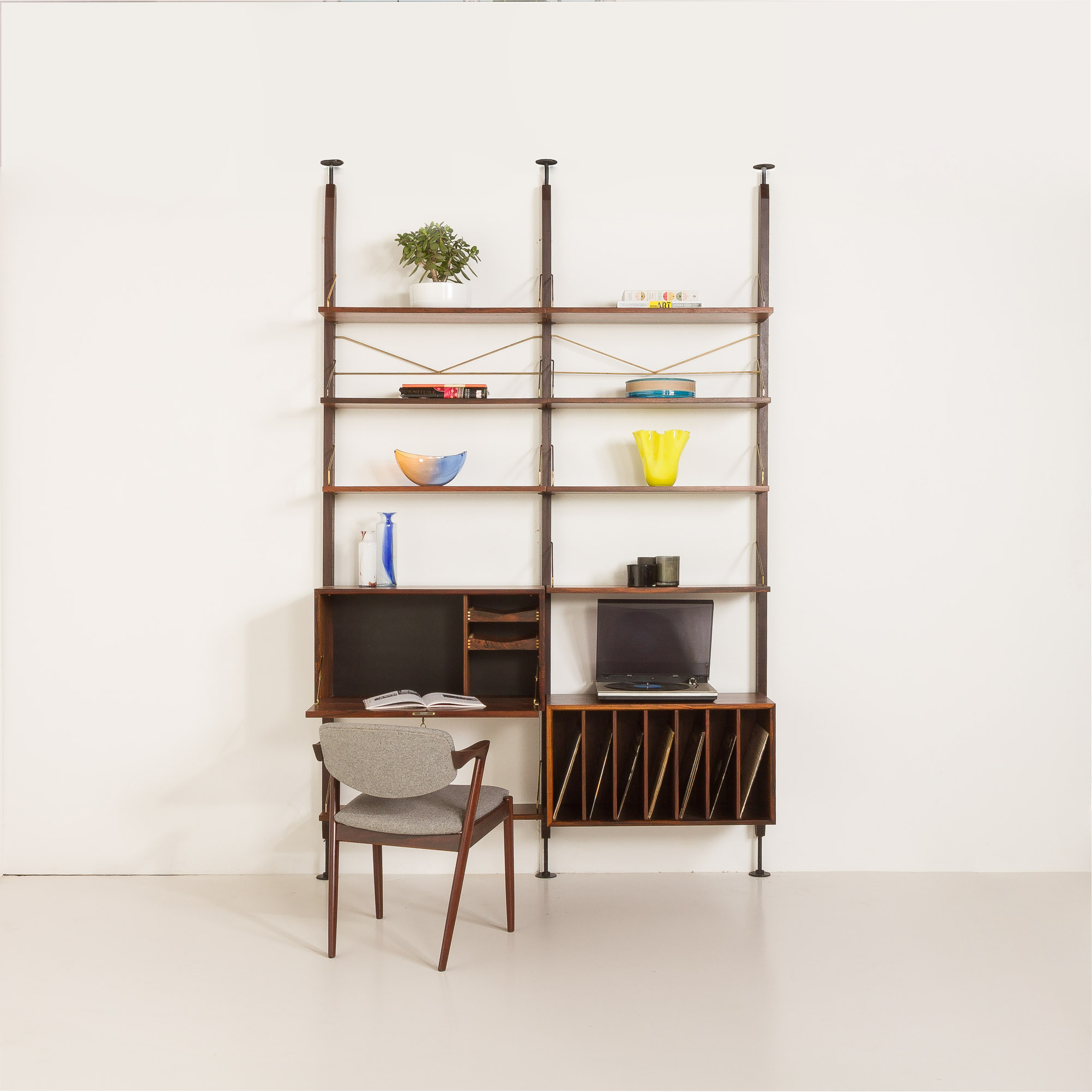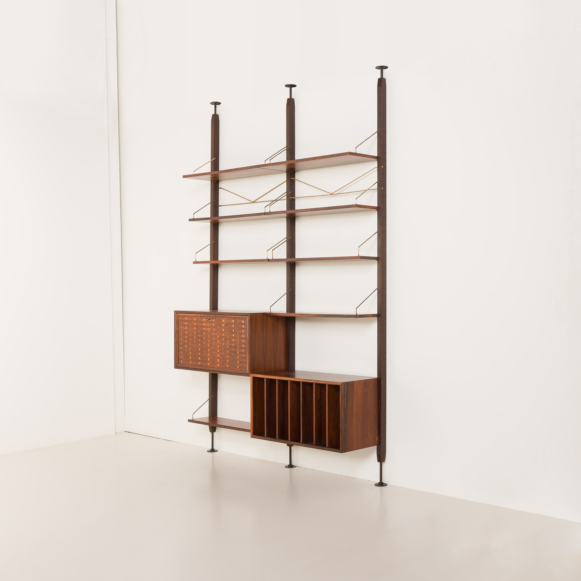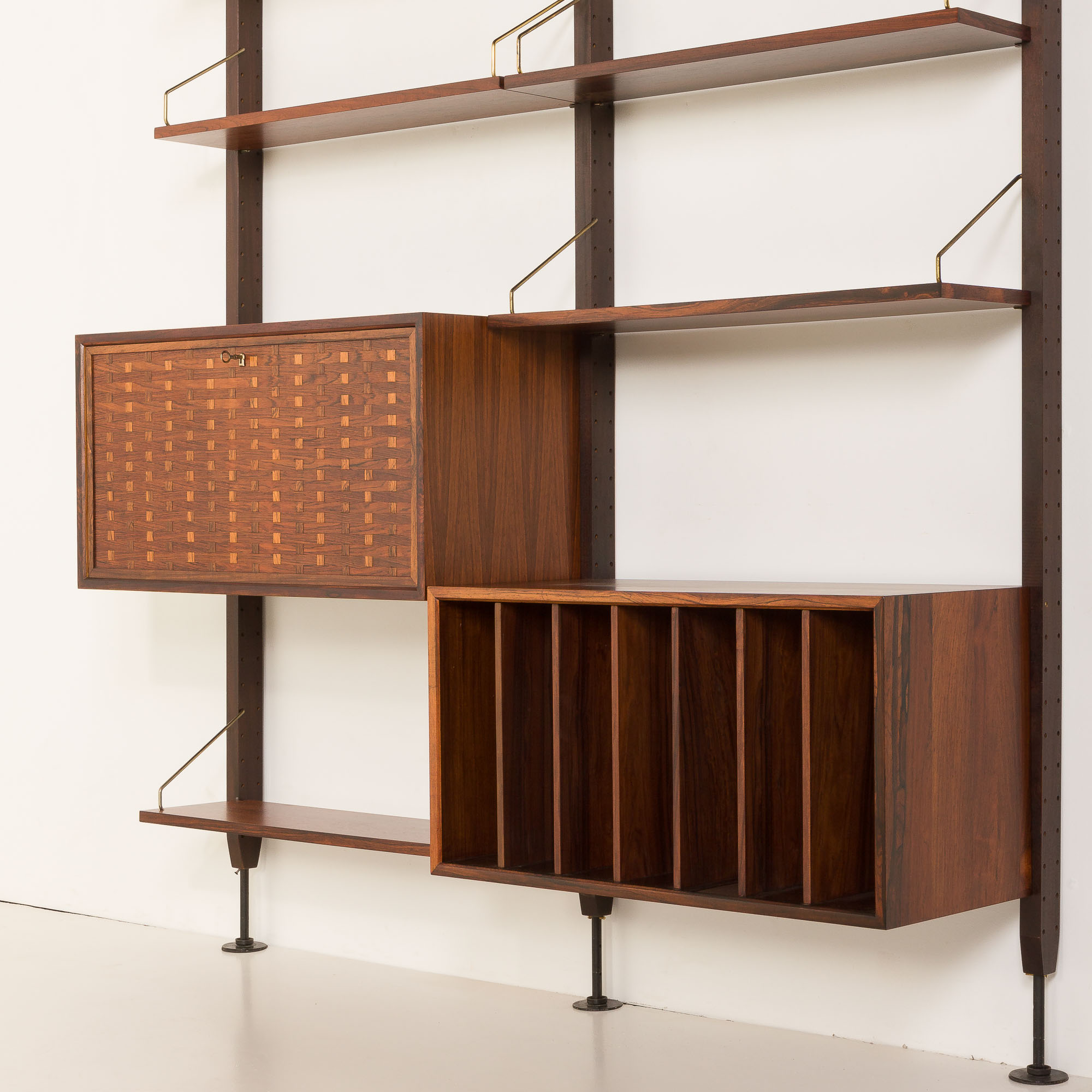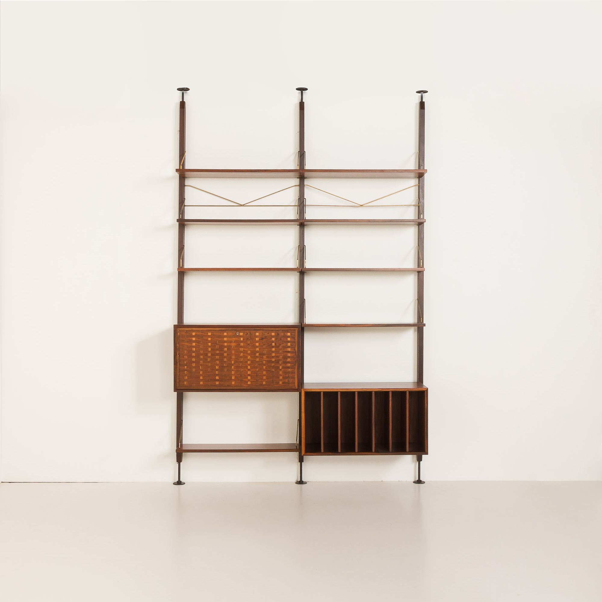 Regał posiada dwie szafki z pięknym usłojeniem drewna, zapewniające niezbędną przestrzeń do przechowywania, oraz 7 półek na książki i inne akcesoria. Wydaje się, że został zaprojektowany specjalnie dla miłośników winyli. Jedna szafka zapewnia mnóstwo miejsca na ulubione płyty, a jej górna część idealnie nadaje się na gramofon. Druga, z opuszczanym frontem, może pełnić funkcję miejsca do pracy - jako biurko - lub jako zamykany barek. Charakterystyczny dla projektu Cadoviusa, front wykończony cienkimi listwami z palisandru, można znaleźć w większości jego regałów, a także w meblach takich jak sofa Governor. Ten niezwykle ozdobny znak rozpoznawczy Cado to klasyka, która nigdy nie wyjdzie z mody. Co więcej, wyjątkowe mosiężne zawieszki półek tworzą elegancki, piękny wygląd, który wyróżnia duński styl w modernistycznym wzornictwie z połowy XX wieku.