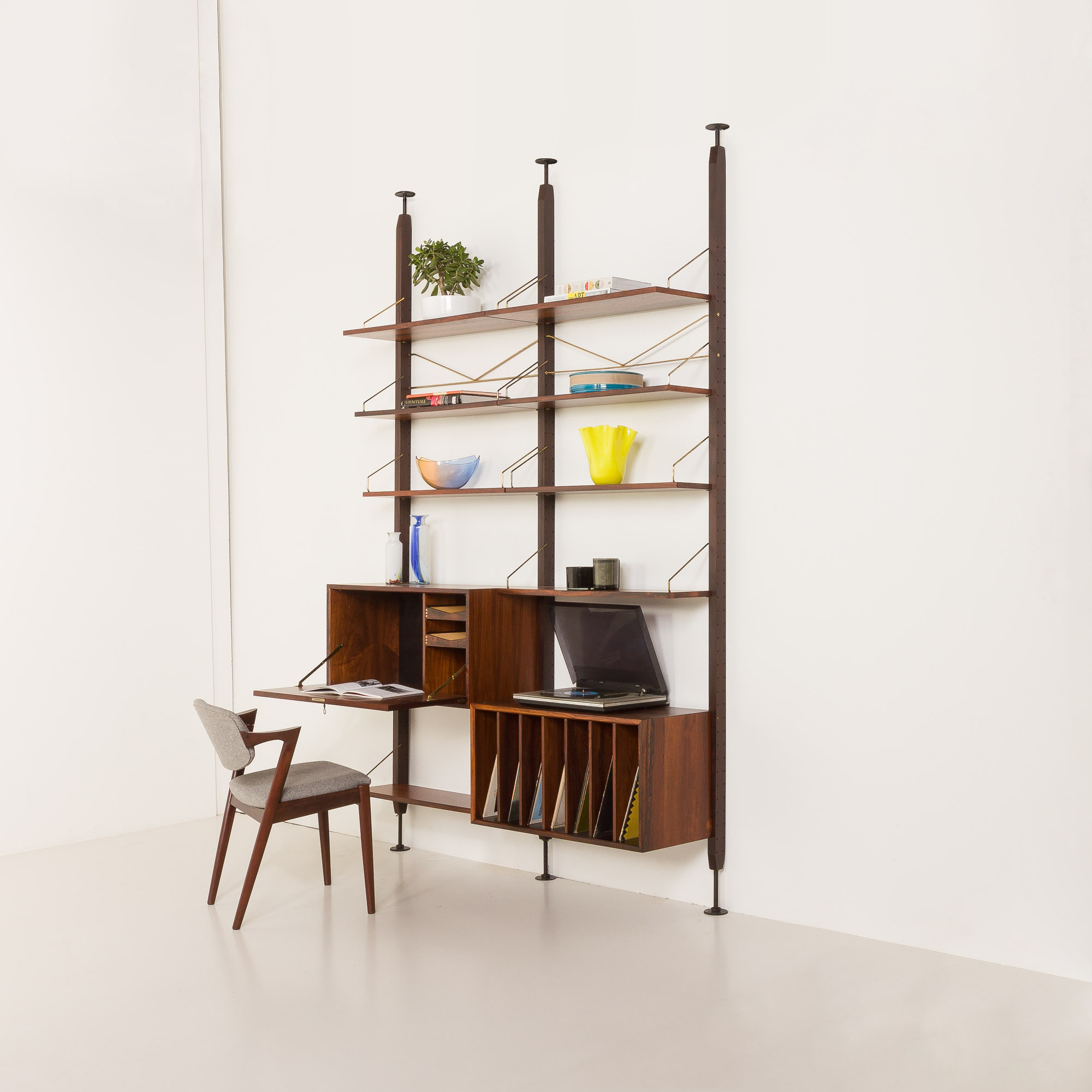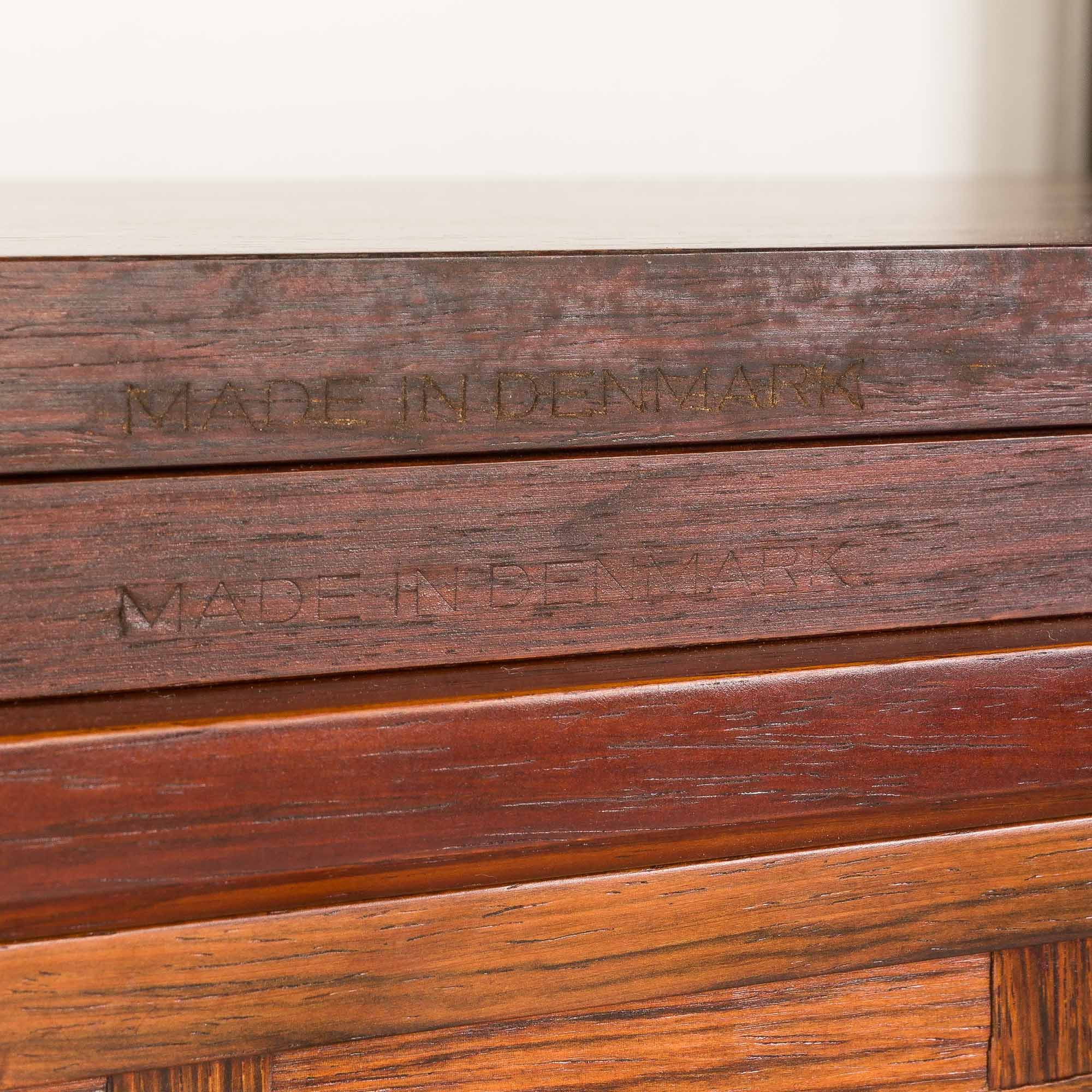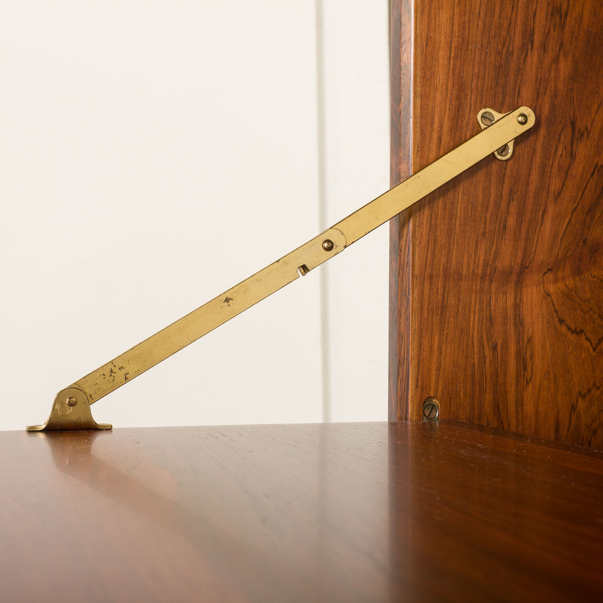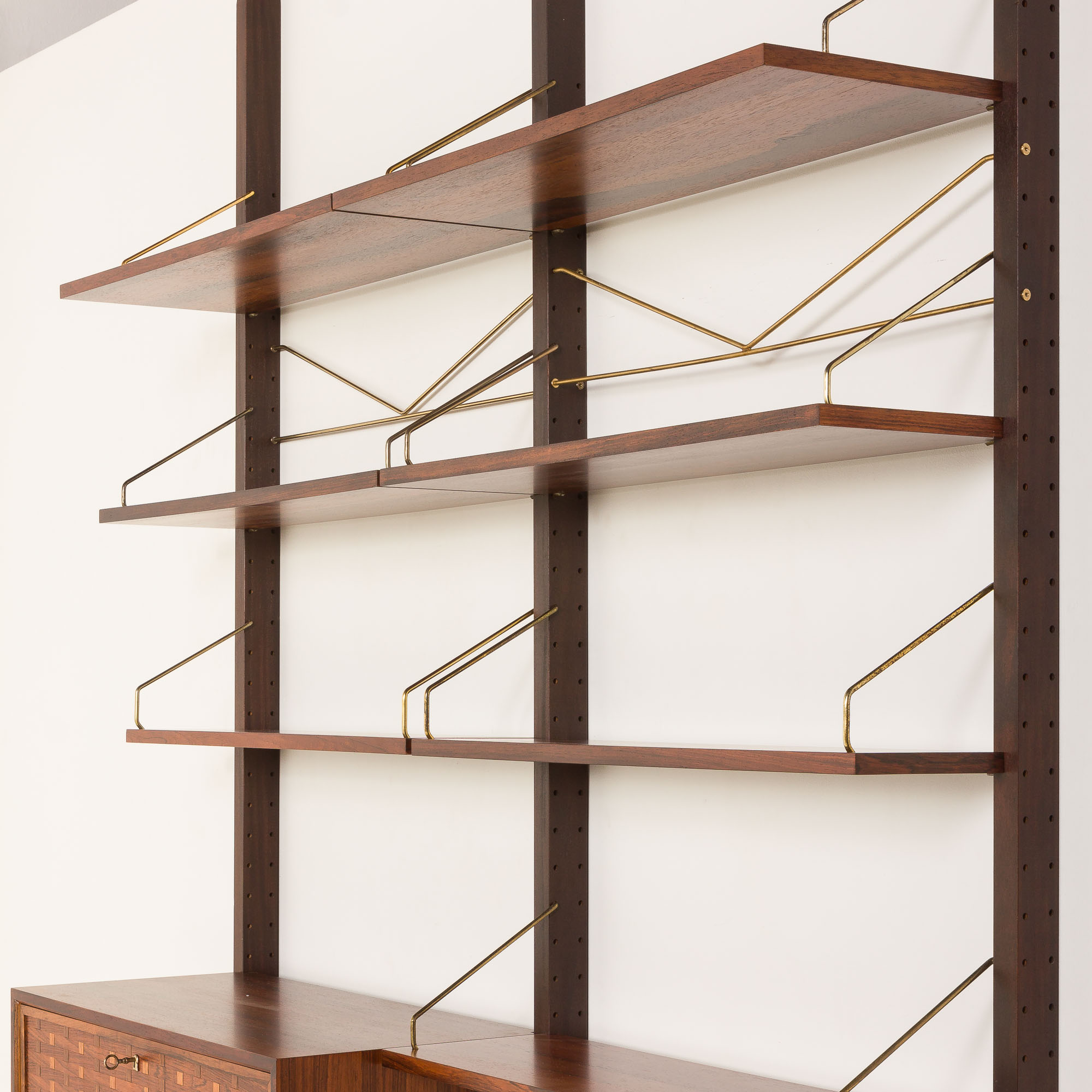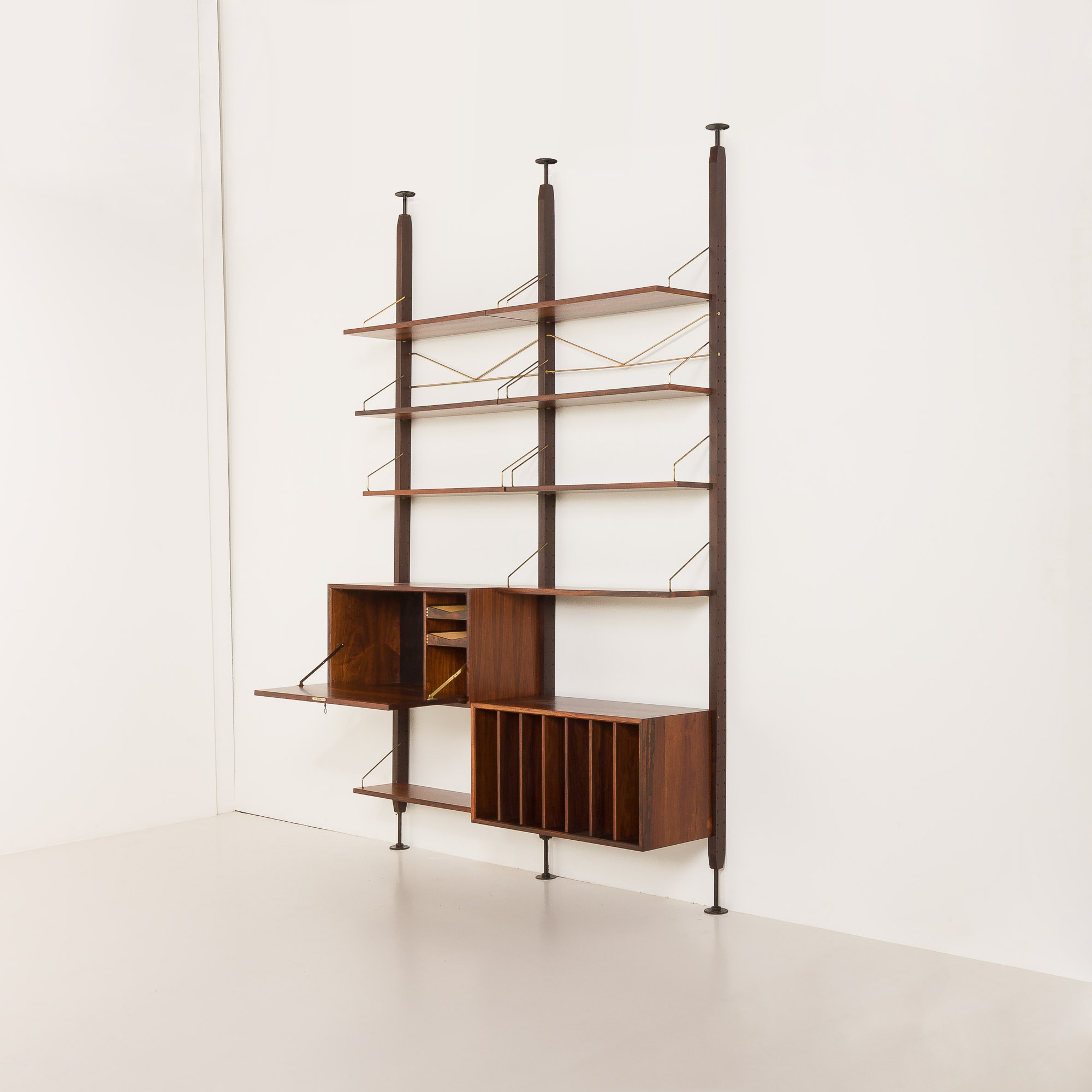 Pomimo upływu prawie sześciu dekad, mebel ten zachował się w doskonałym, oryginalnym stanie. Drewno zostało oczyszczone i zabezpieczone profesjonalnymi środkami, aby wydobyć jego naturalne piękno. Grawerunek „Made in Denmark” umieszczony z tyłu elementów potwierdza autentyczność pochodzenia mebla. Zdecydowanie zaleca się montaż tego regału zarówno na podłodze, jak i na suficie. Jeśli chcesz podwyższyć lub obniżyć zestaw, daj nam znać wcześniej – możemy go dostosować, ale najlepiej będzie go zachować w oryginalnym zakresie 254–264 cm.