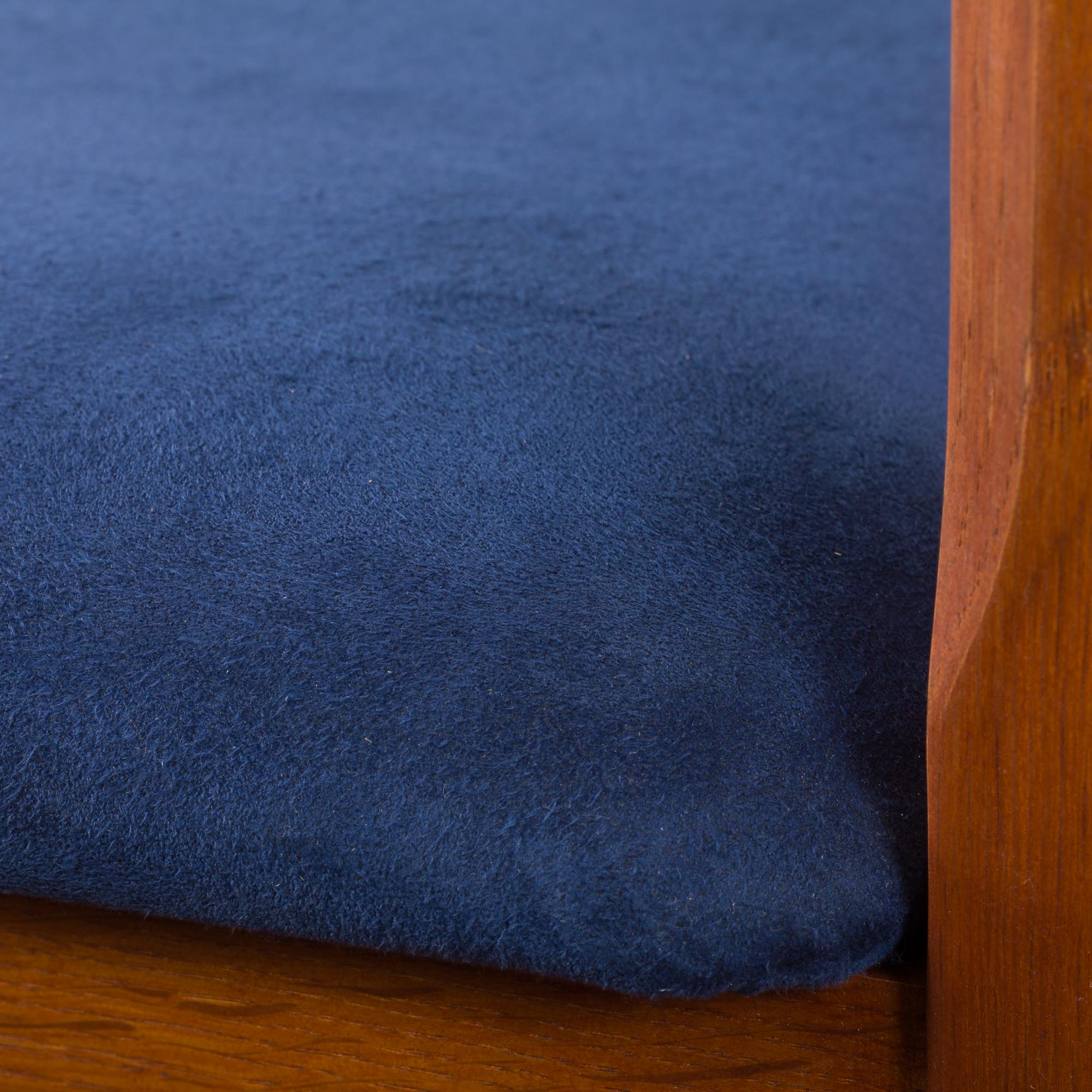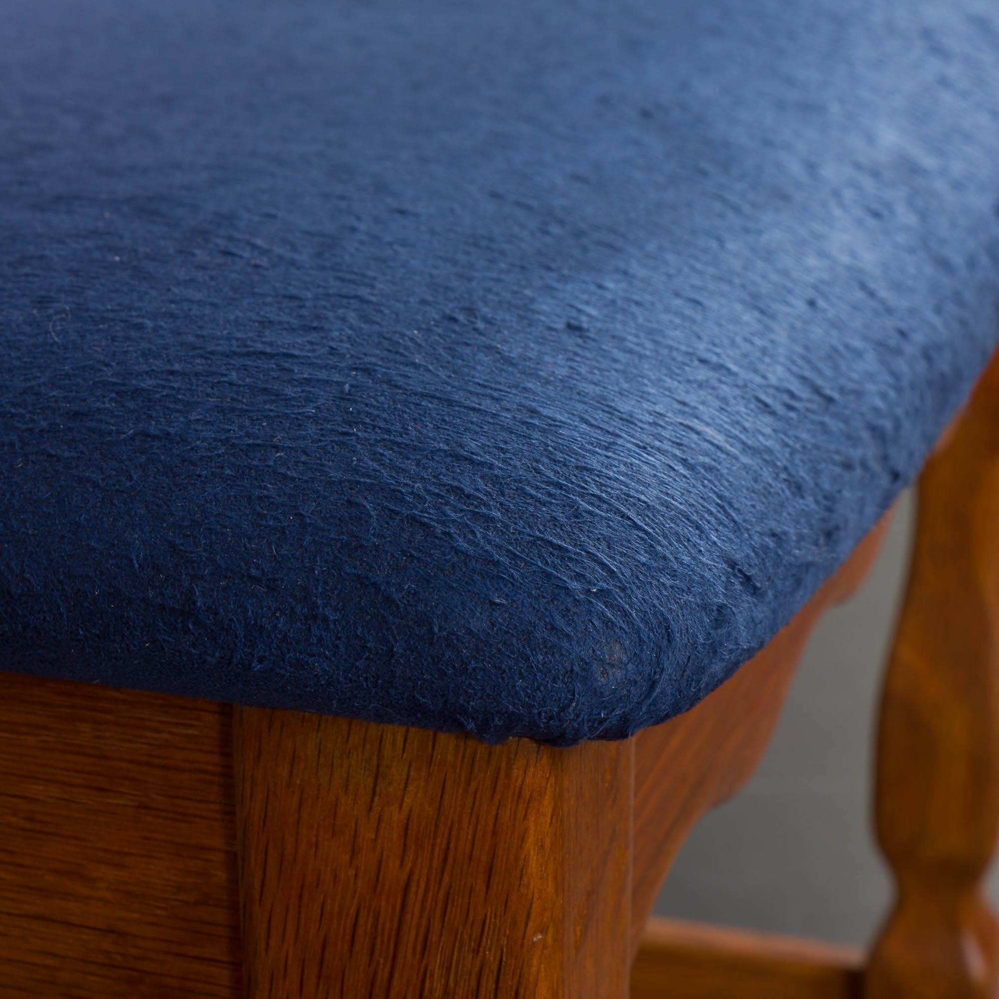 Naturalne usłojenie i kolor lakierowanego dębu uzupełnia oryginalna tapicerka siedzisk w kolorze kobaltu. Dzięki zaangażowaniu w łączenie tradycji i nowoczesności, projekt Henninga Kjærnulfa jest natychmiast rozpoznawalnym i ponadczasowym klasykiem.
