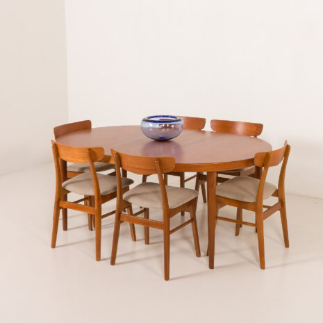 Wyrafinowany duński stół mid-century, wyprodukowany przez Feldballes Møbelfabrik w latach 60., ucieleśnia elegancję i kunszt charakterystyczny dla skandynawskiego, modernistycznego wzornictwa. Od dłuższego czasu jego autorstwo przypisuje się Kaiowi Kristiansenowi, który projektował dla FM.