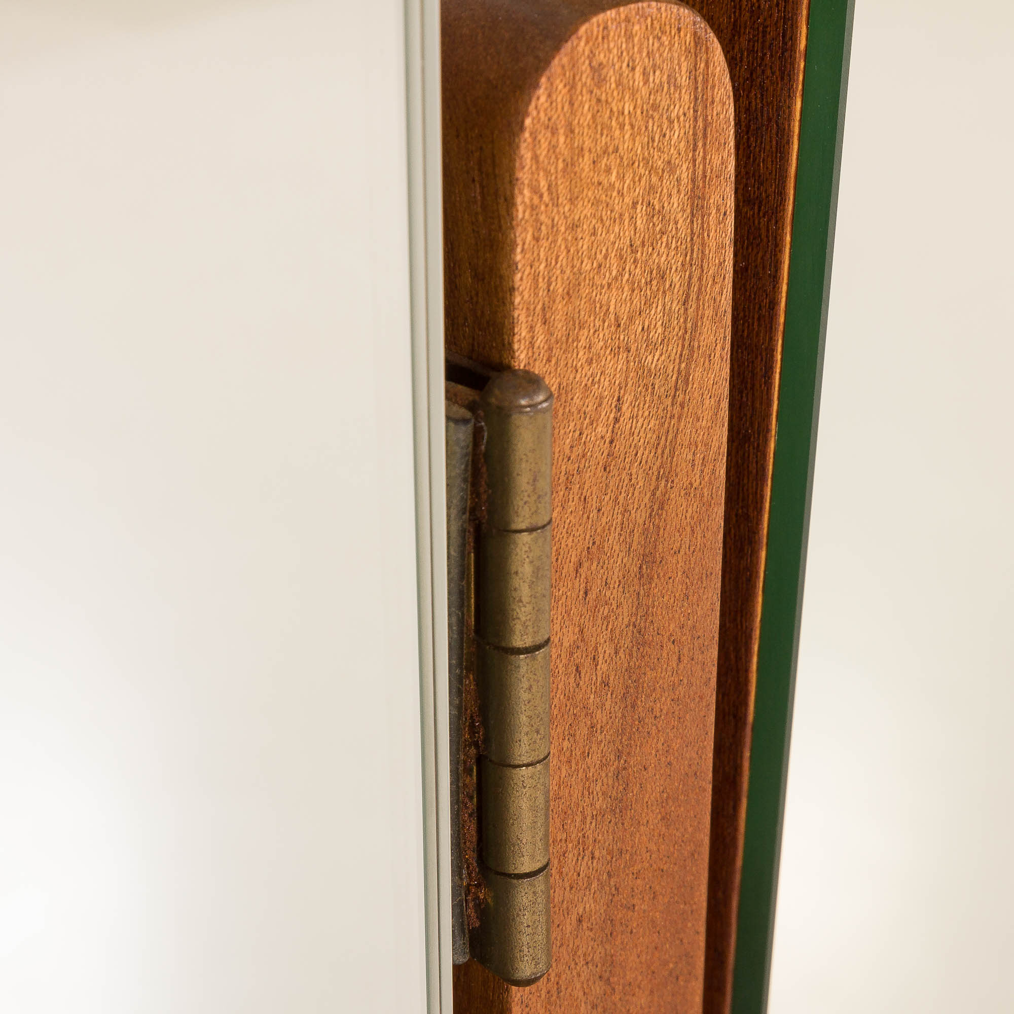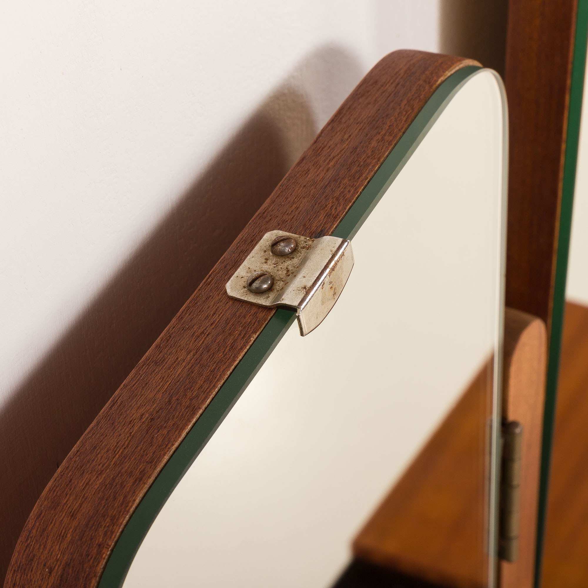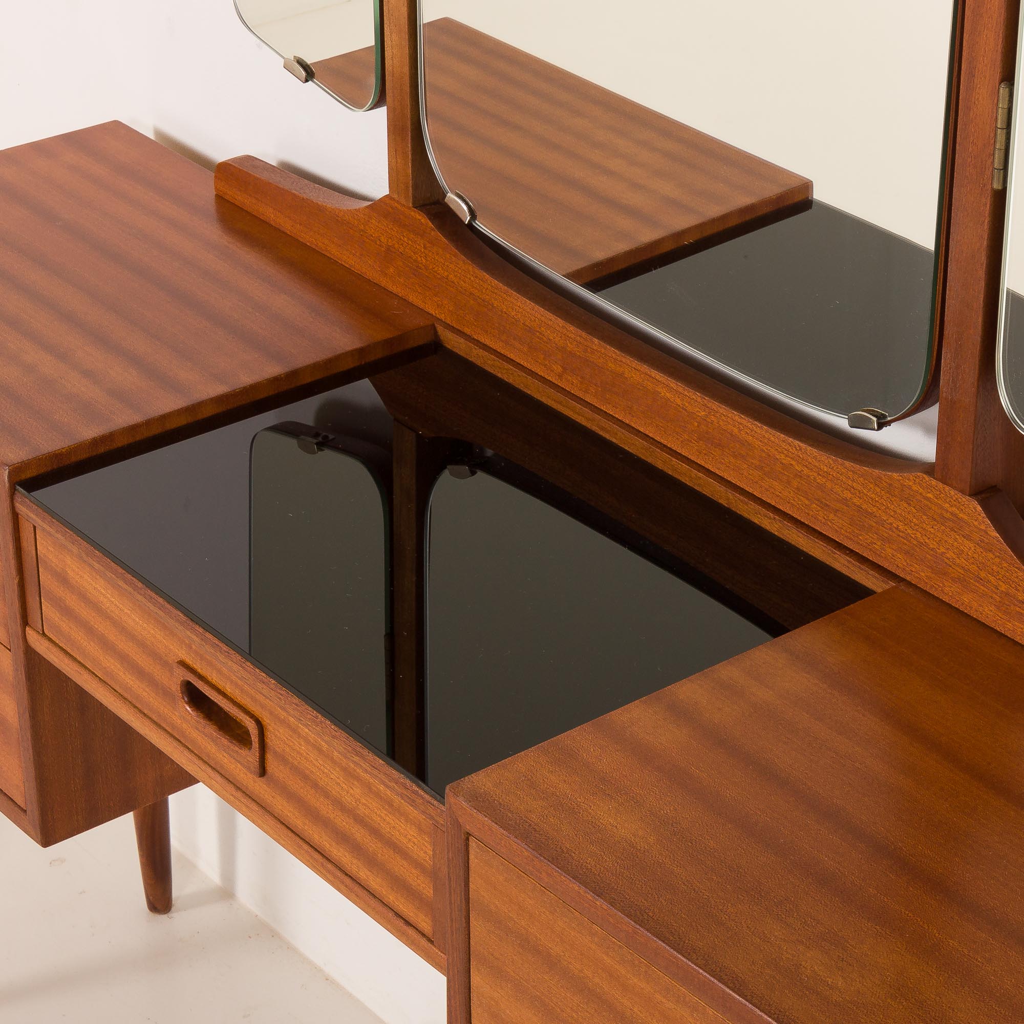 Toaletka, wyprodukowana najprawdopodobniej w Norwegii, posiada pięć szuflad, zapewniających funkcjonalną przestrzeń do przechowywania, a składane lustra zwiększają wygodę użytkowania. Ten mebel vintage wykonany jest z drewna mahoniowego Ribbon Stripe z wyrzeźbionymi w litym drewnie uchwytami.