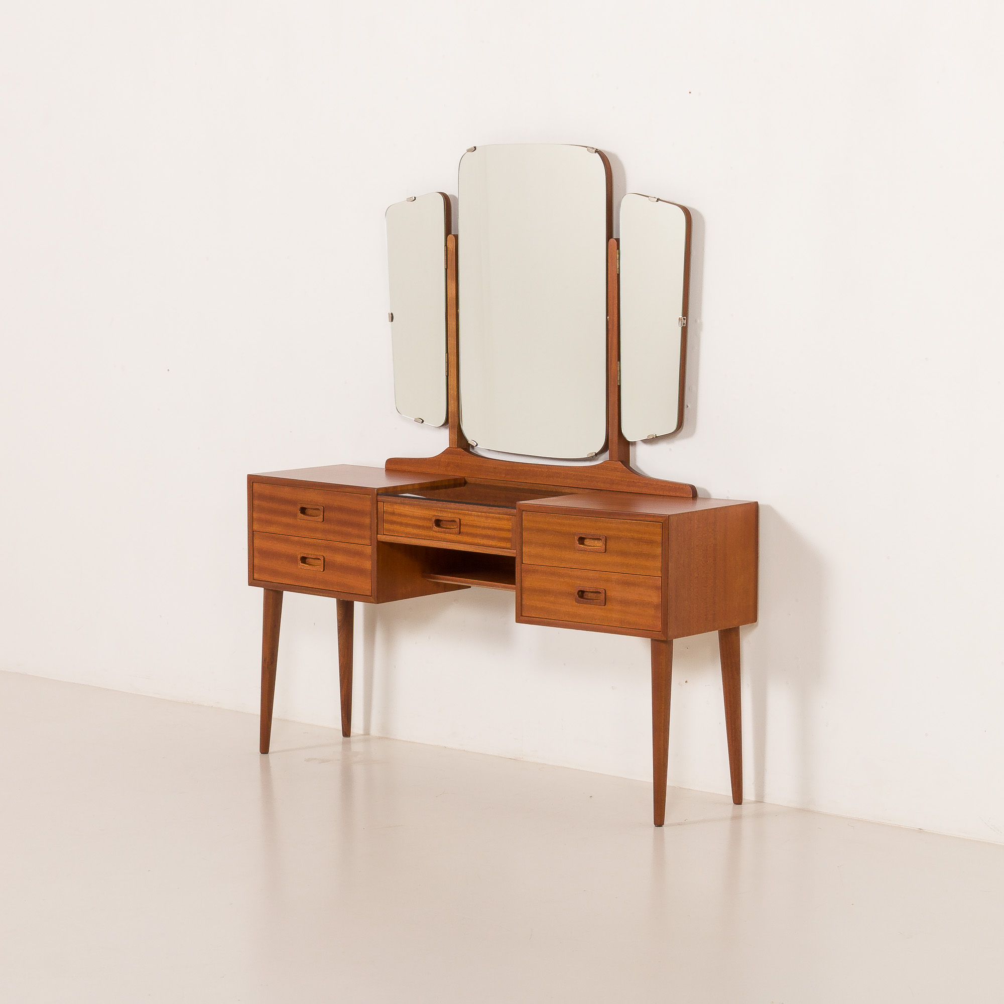 Ta elegancka skandynawska toaletka mid-century z drewna tekowego pochodzi z lat 60. Jest doskonałym przykładem kunsztu stolarskiego z połowy XX wieku, ucieleśniającym ponadczasową elegancję skandynawskiego wzornictwa.