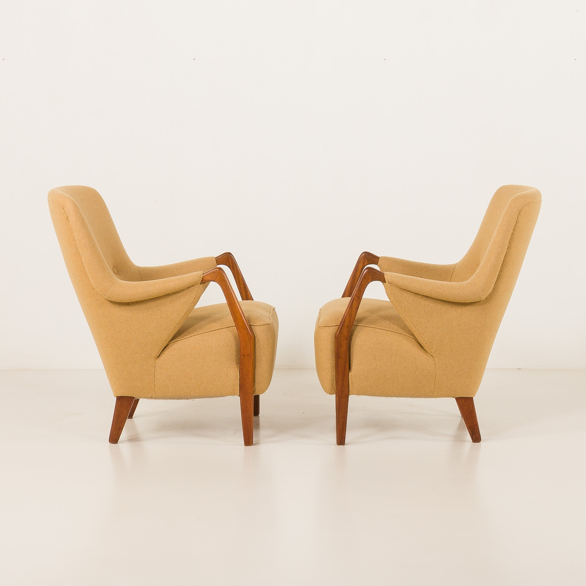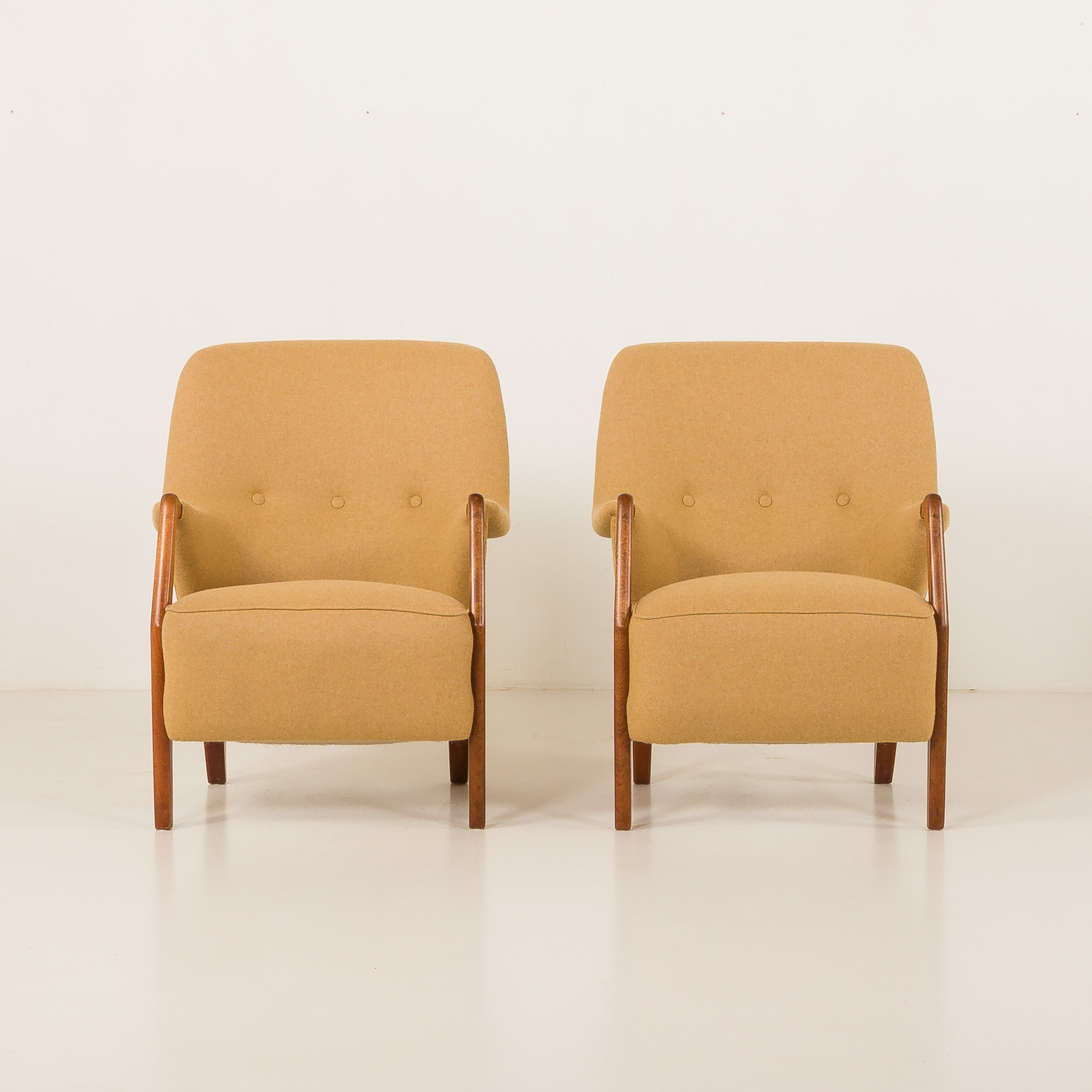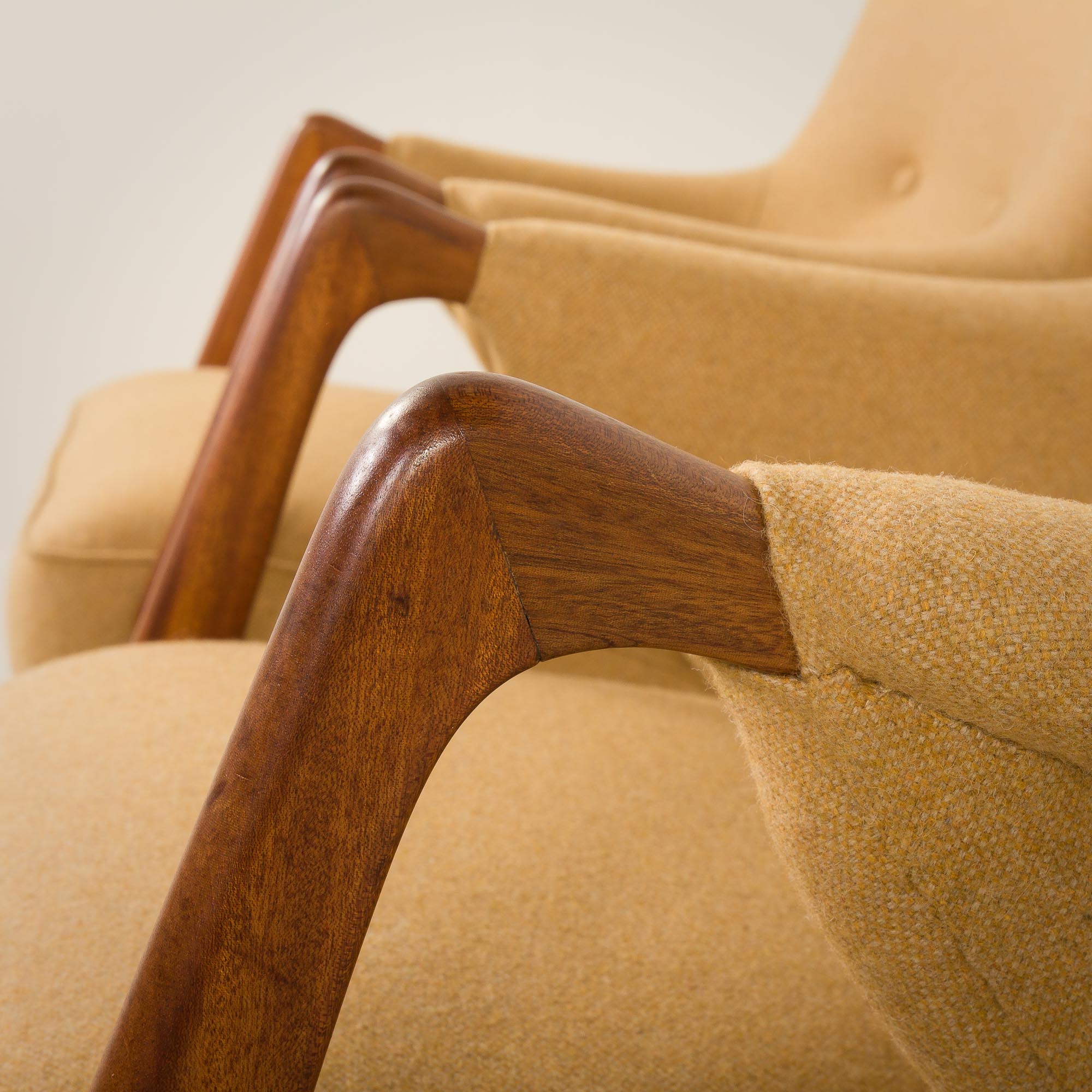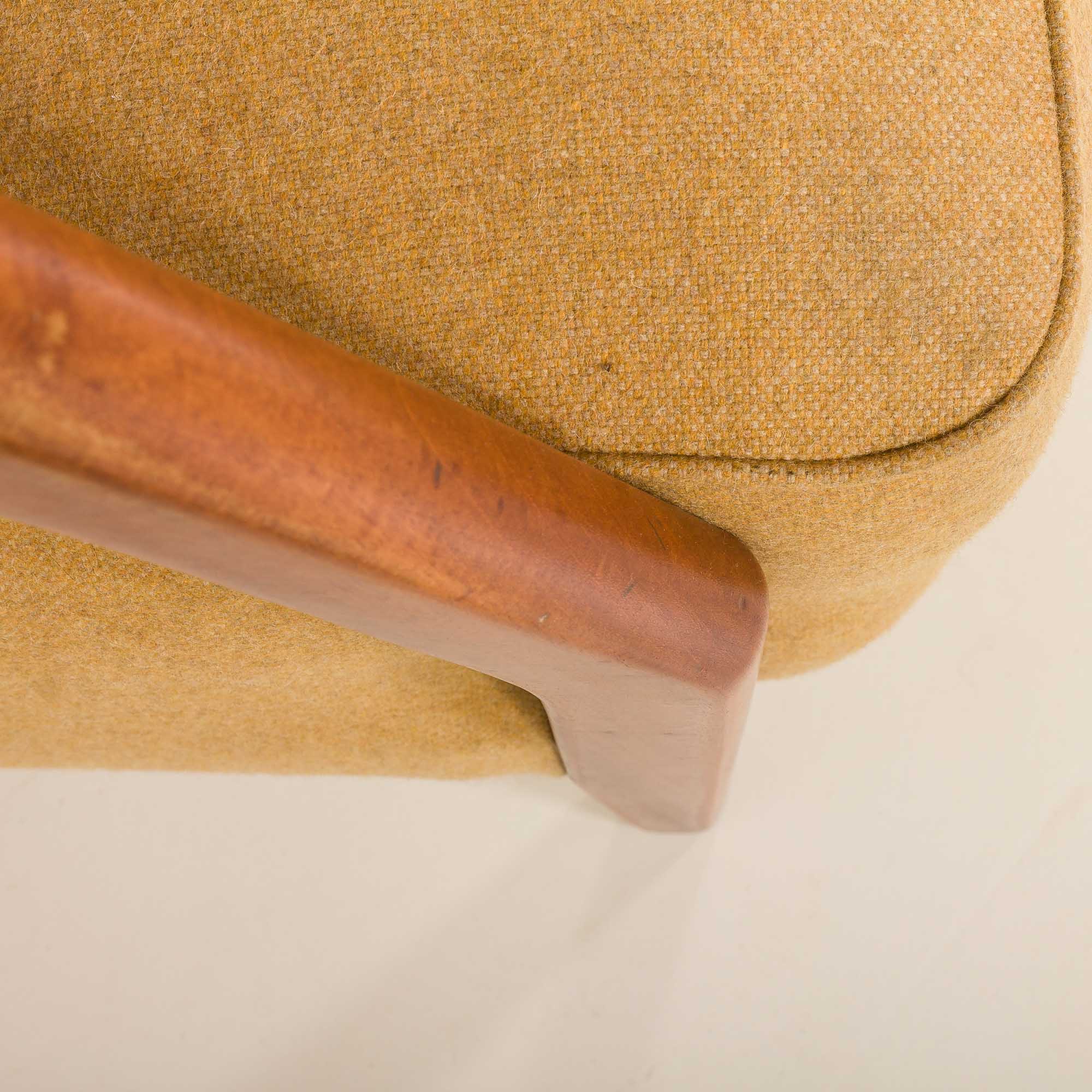 Drewniane ramy zostały w pełni odnowione poprzez nałożenie nowych warstw lakieru, co podkreśla ciepłe usłojenie drewna tekowego. Siedziska i oparcia zostały starannie odnowione wełną w kolorze musztardowym z nową pianką, co zapewnia trwałość i komfort. Ta ponadczasowa para foteli łączy w sobie funkcjonalność i elegancję, idealnie nadając się do dodania odrobiny stylu mid-century do salonu, pokoju wypoczynkowego lub innego pomieszczenia.