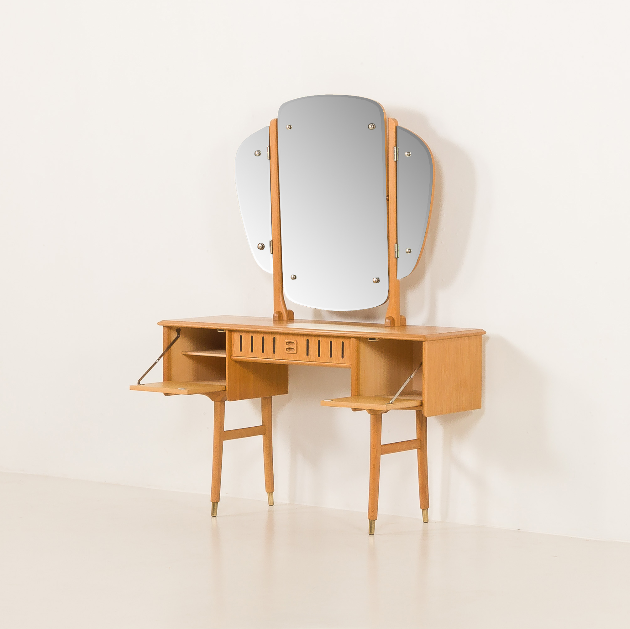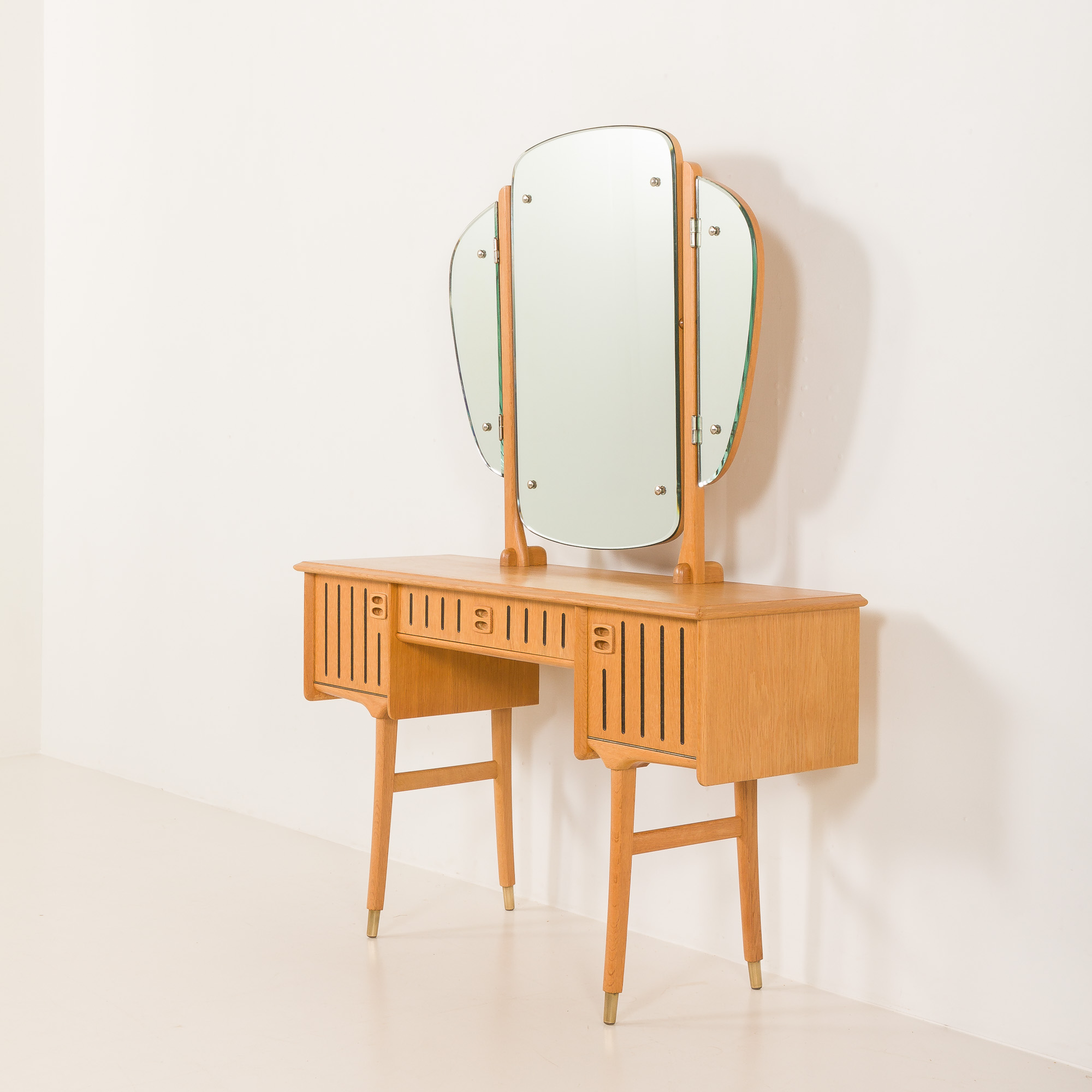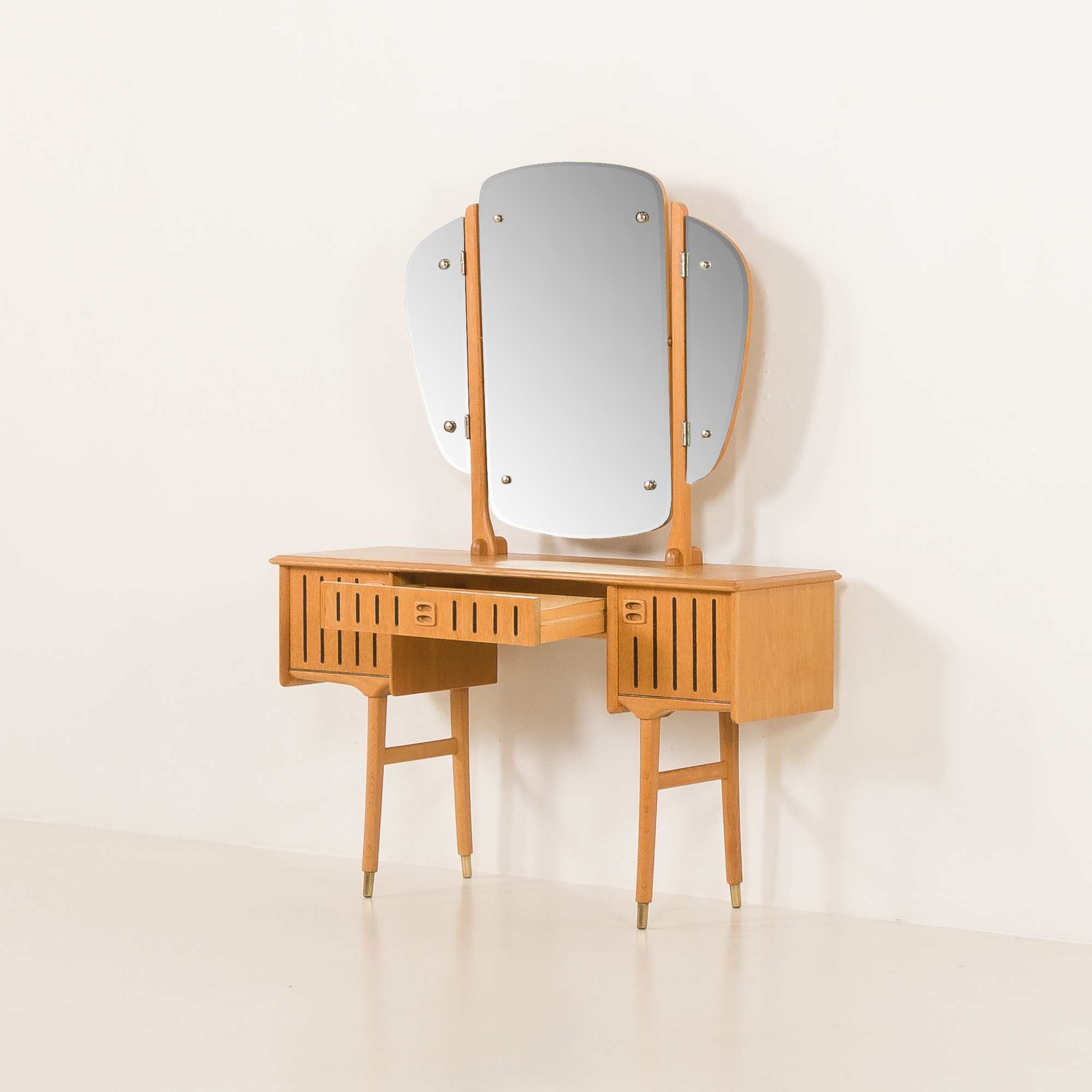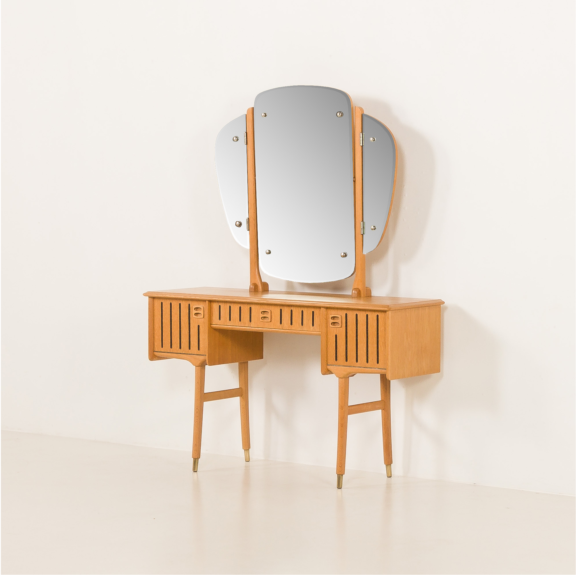 Elegancka skandynawska dębowa toaletka z połowy wieku stylem przypominająca projekty Henninga Kjaernulfa z lat 60-tych i 70-tych. Jednak niekoniecznie pochodzi z Dani. Toaletka ma centralną szufladę i dwie boczne szafki z opuszczanymi drzwiami, zapewniając funkcjonalną przestrzeń do przechowywania, a składane lustra zwiększają wygodę użytkowania. Toaletka vintage jest wykonana z litego dębu z pięknie rzeźbionymi uchwytami i stoi na litej podstawie. Nogi są odłączane, co ułatwia transport