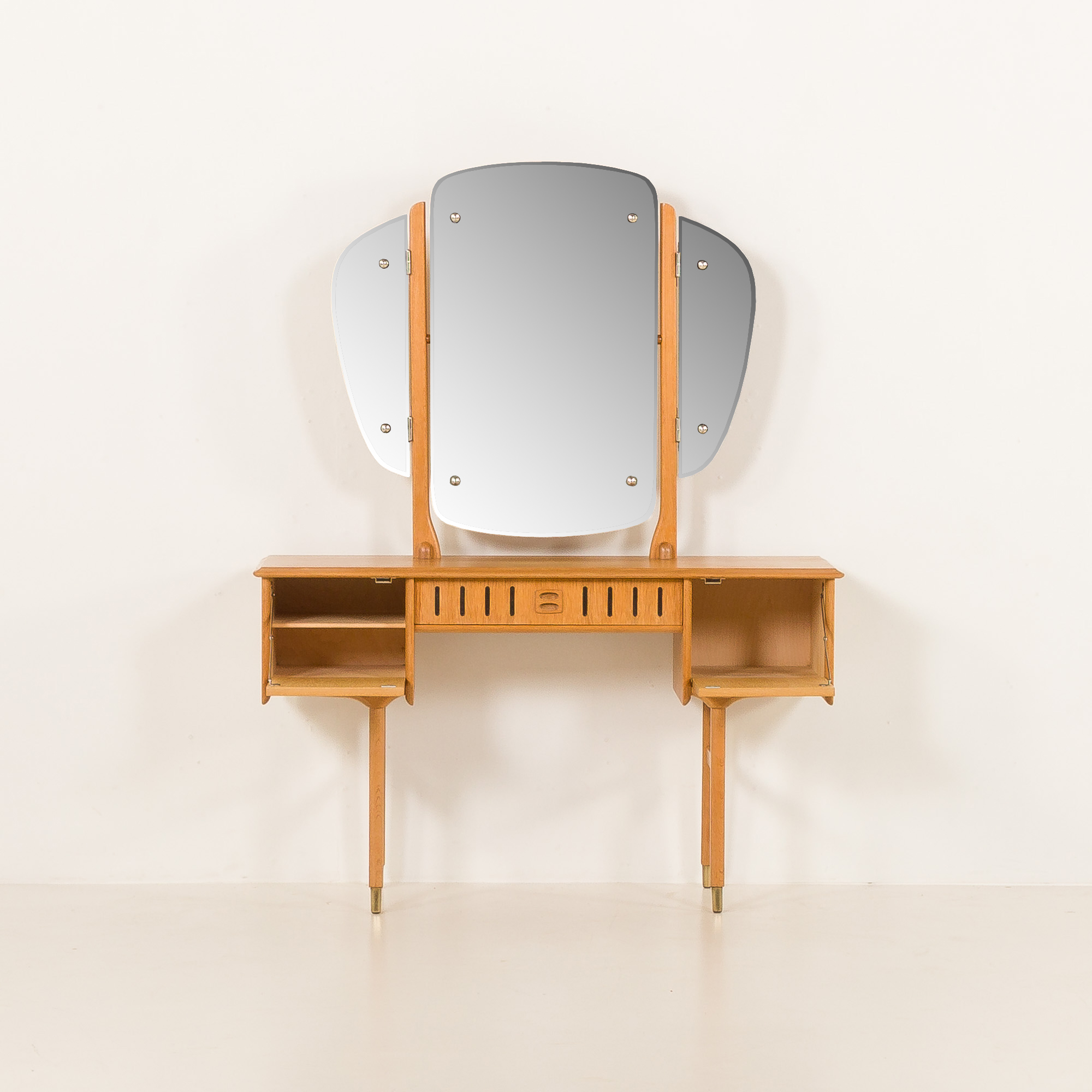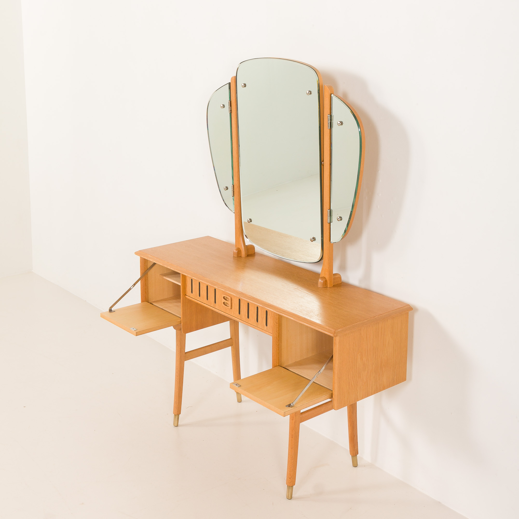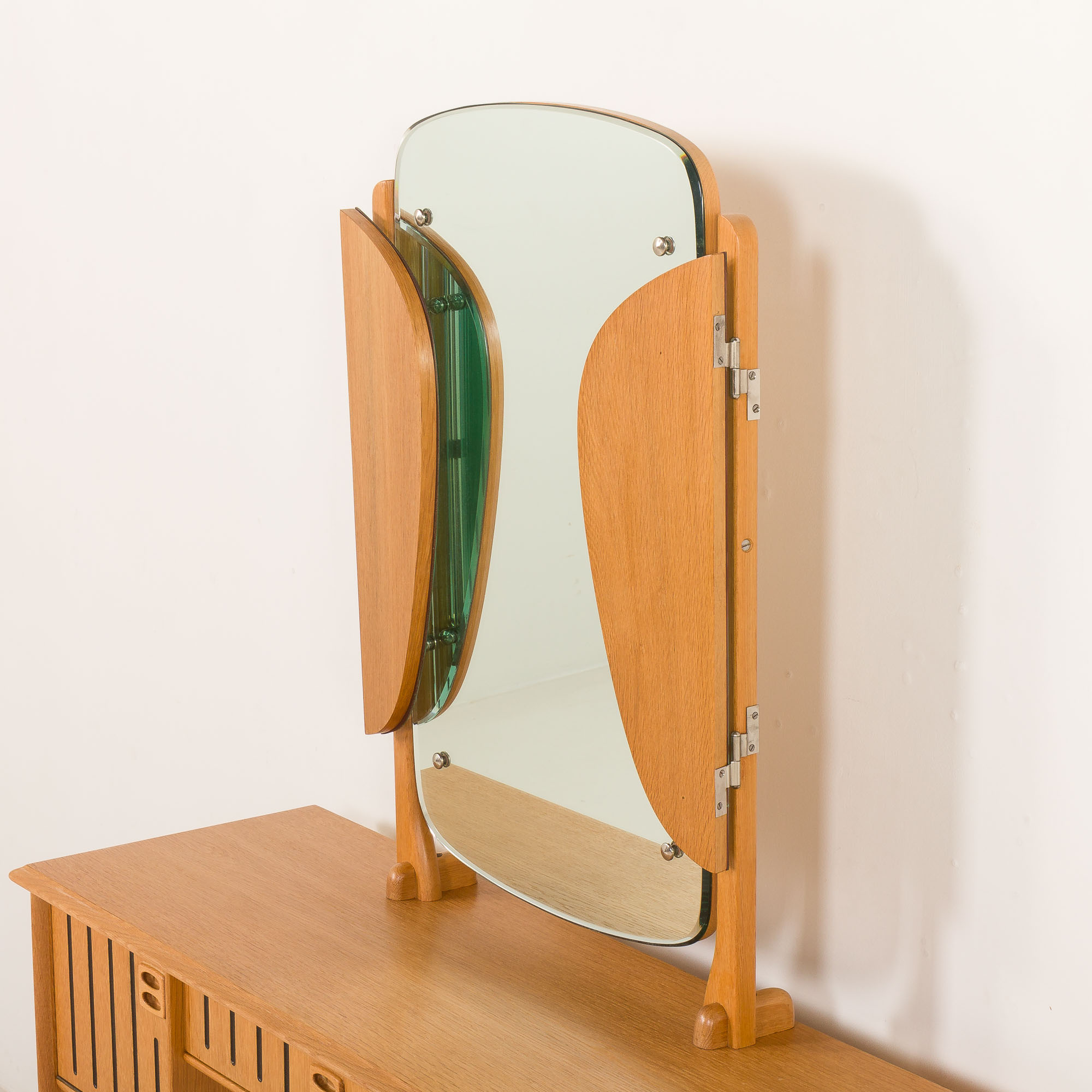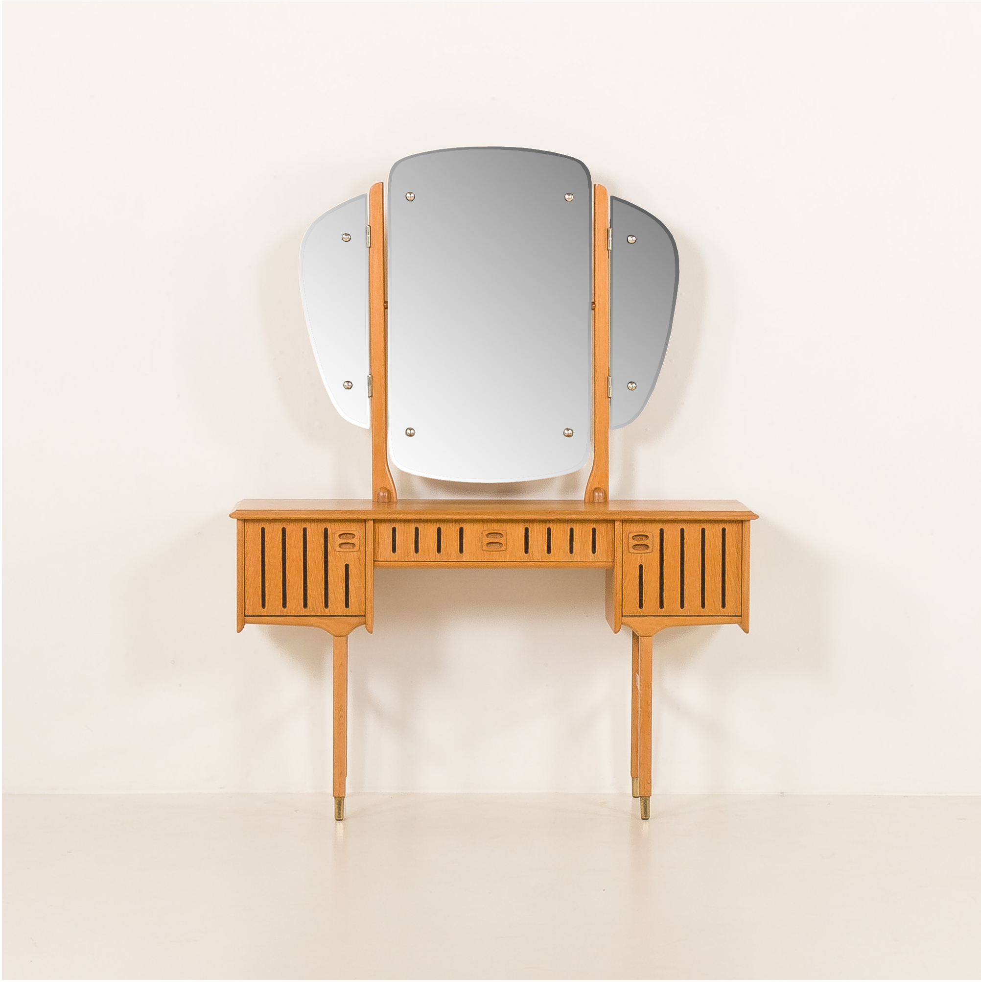 Elegancka skandynawska dębowa toaletka z połowy wieku stylem przypominająca projekty Henninga Kjaernulfa z lat 60-tych i 70-tych. Jednak niekoniecznie pochodzi z Dani. Toaletka ma centralną szufladę i dwie boczne szafki z opuszczanymi drzwiami, zapewniając funkcjonalną przestrzeń do przechowywania, a składane lustra zwiększają wygodę użytkowania. Toaletka vintage jest wykonana z litego dębu z pięknie rzeźbionymi uchwytami i stoi na litej podstawie. Nogi są odłączane, co ułatwia transport