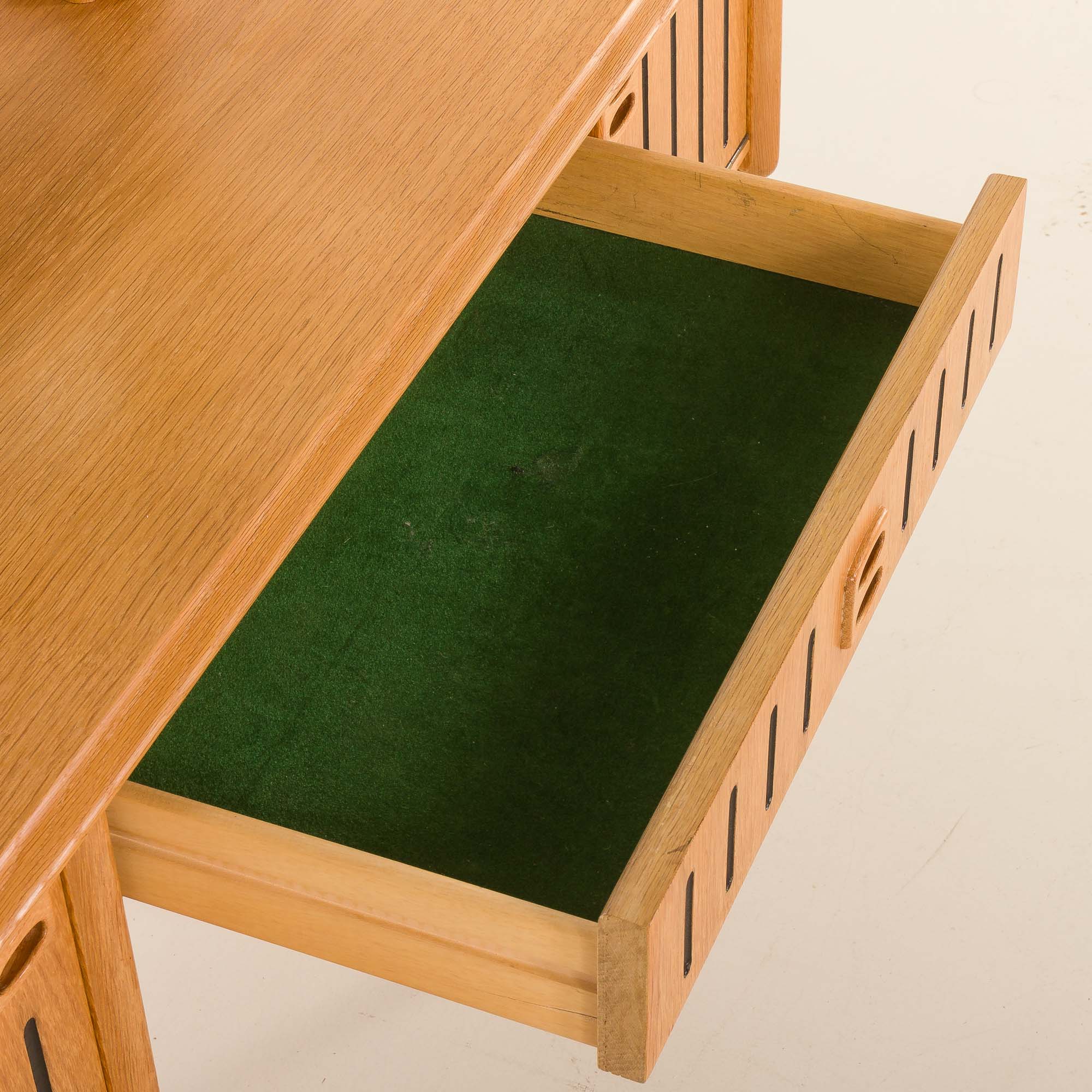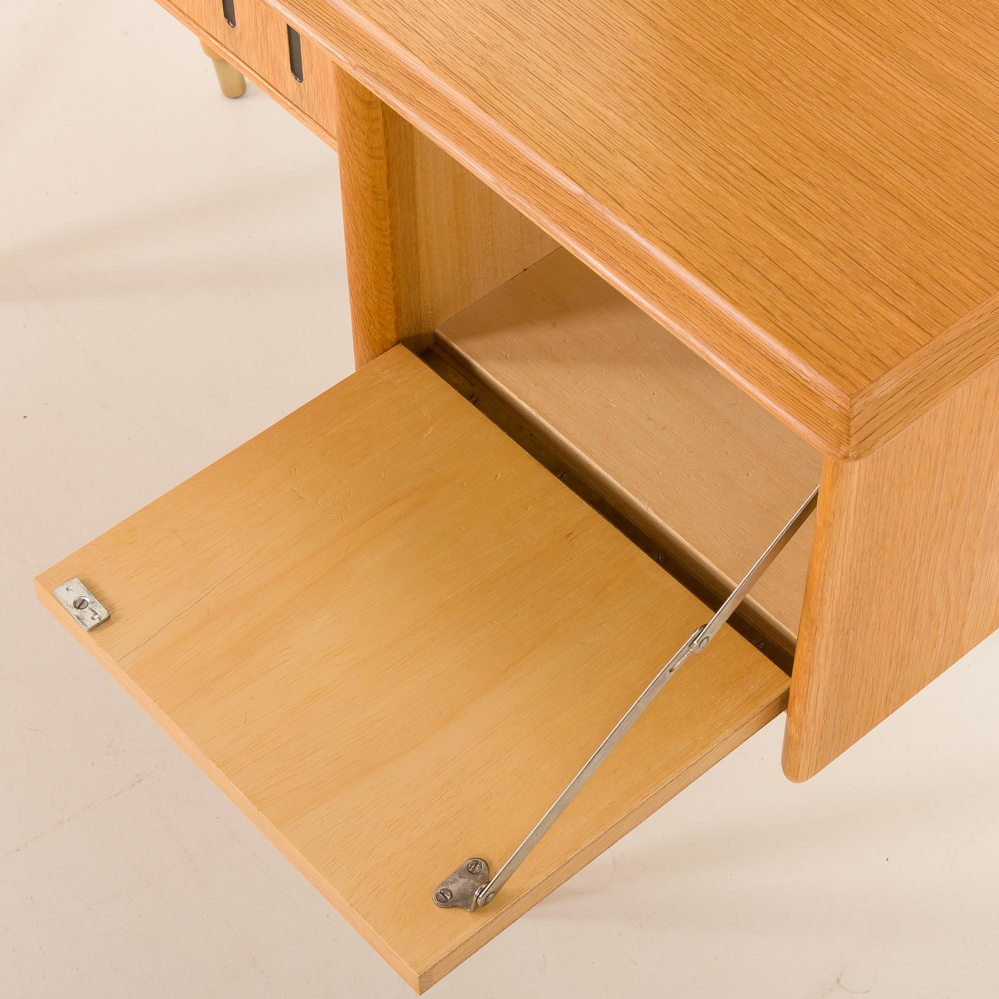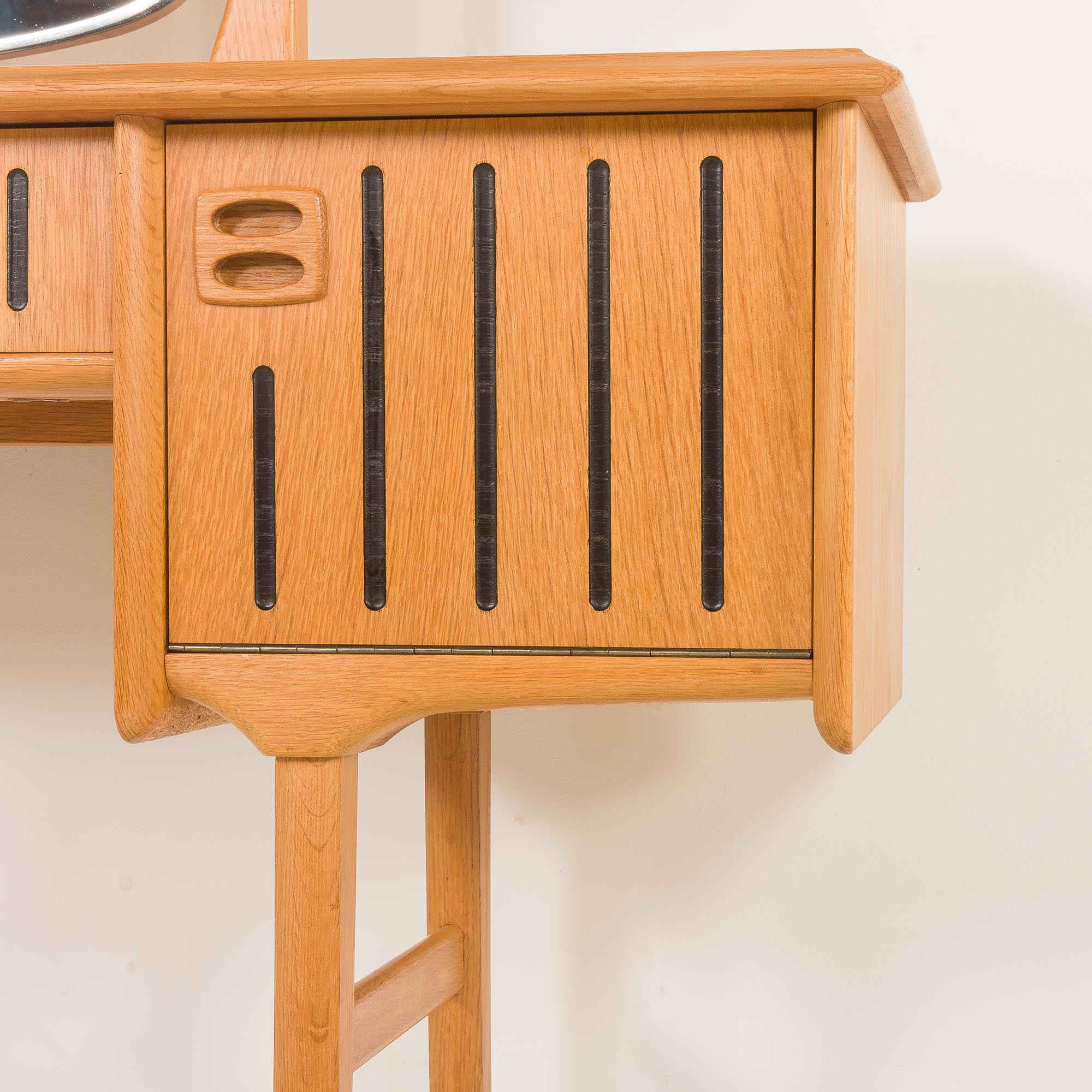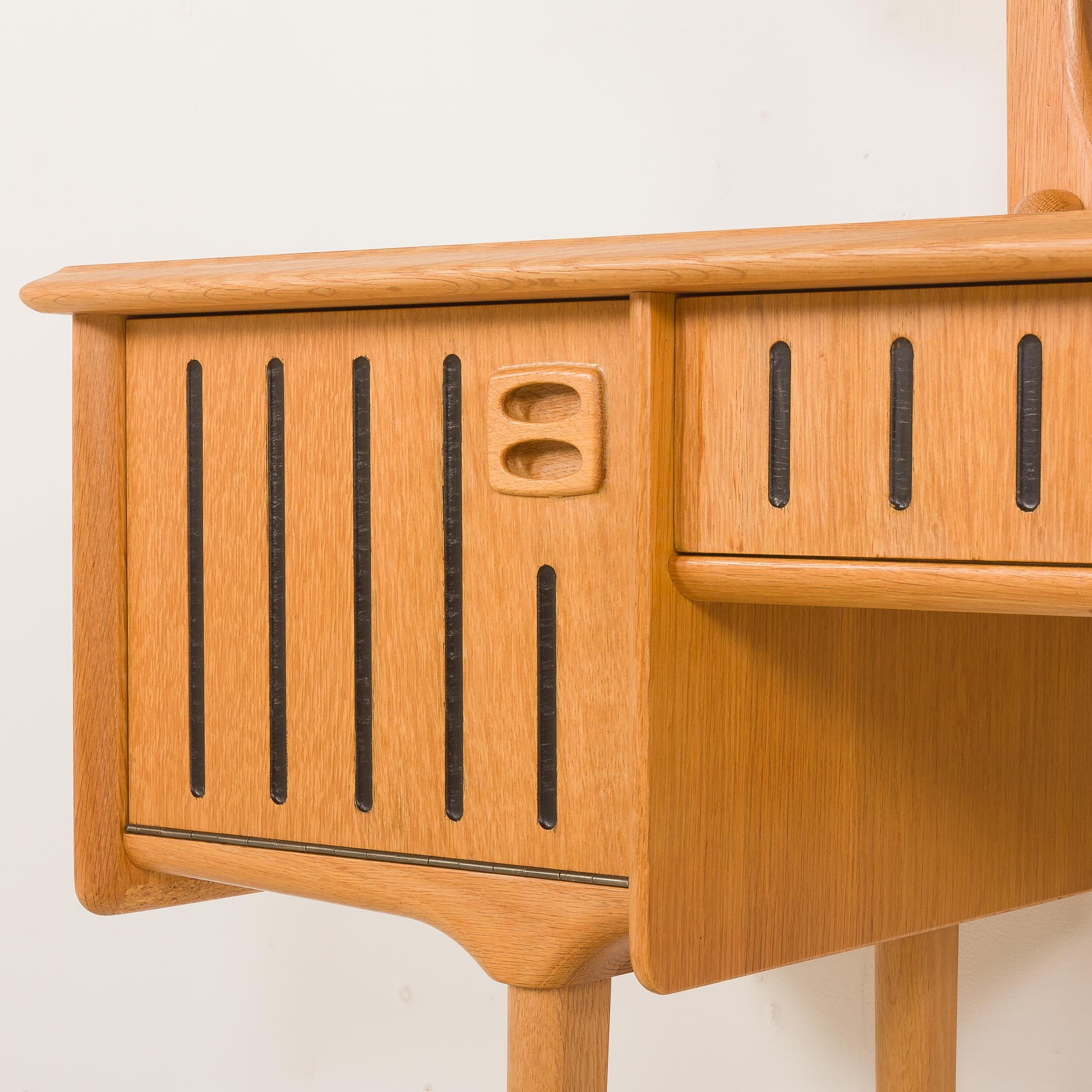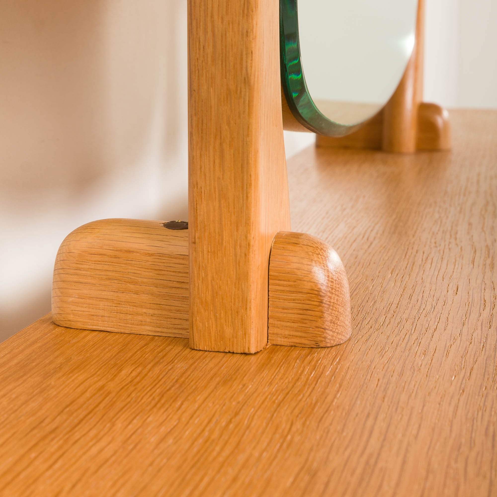 Elegancka skandynawska dębowa toaletka z połowy wieku stylem przypominająca projekty Henninga Kjaernulfa z lat 60-tych i 70-tych. Jednak niekoniecznie pochodzi z Dani. Toaletka ma centralną szufladę i dwie boczne szafki z opuszczanymi drzwiami, zapewniając funkcjonalną przestrzeń do przechowywania, a składane lustra zwiększają wygodę użytkowania. Toaletka vintage jest wykonana z litego dębu z pięknie rzeźbionymi uchwytami i stoi na litej podstawie. Nogi są odłączane, co ułatwia transport