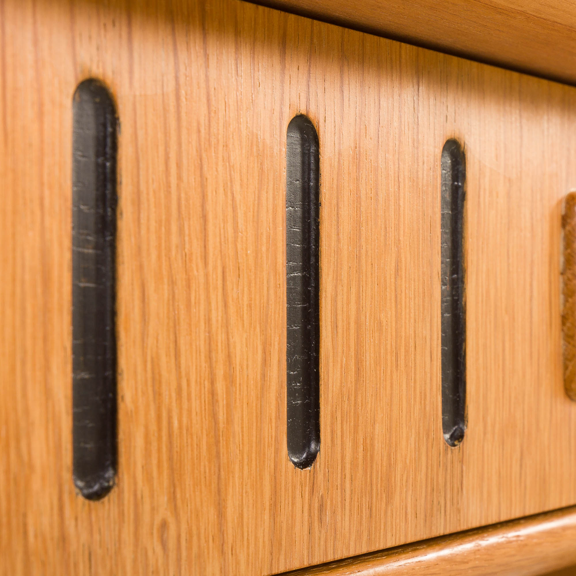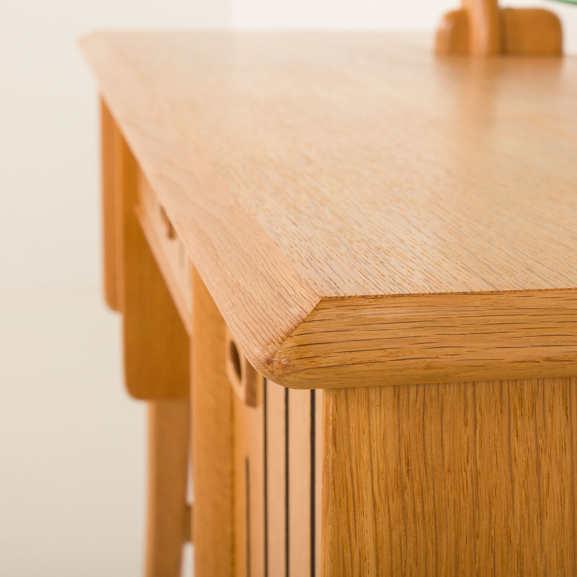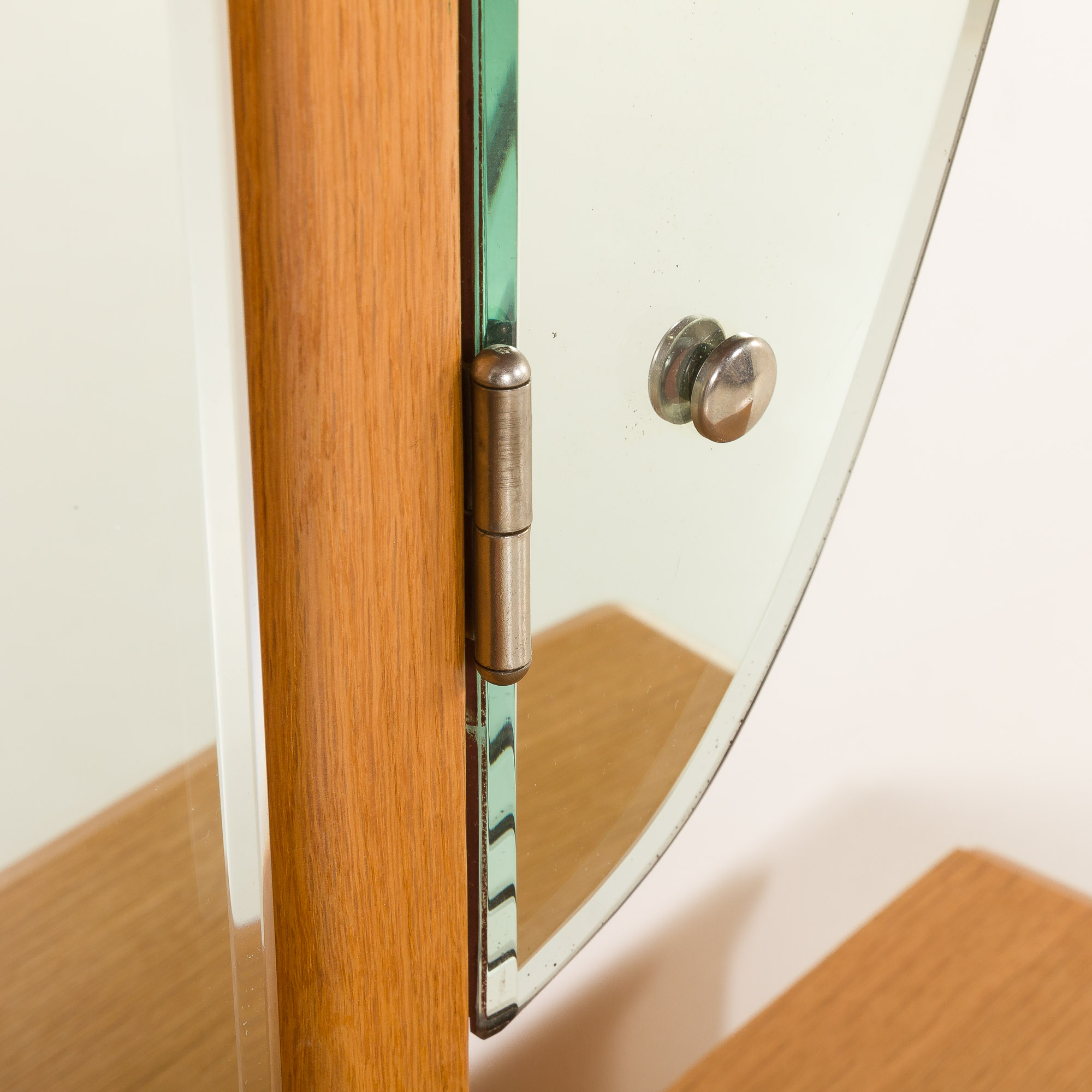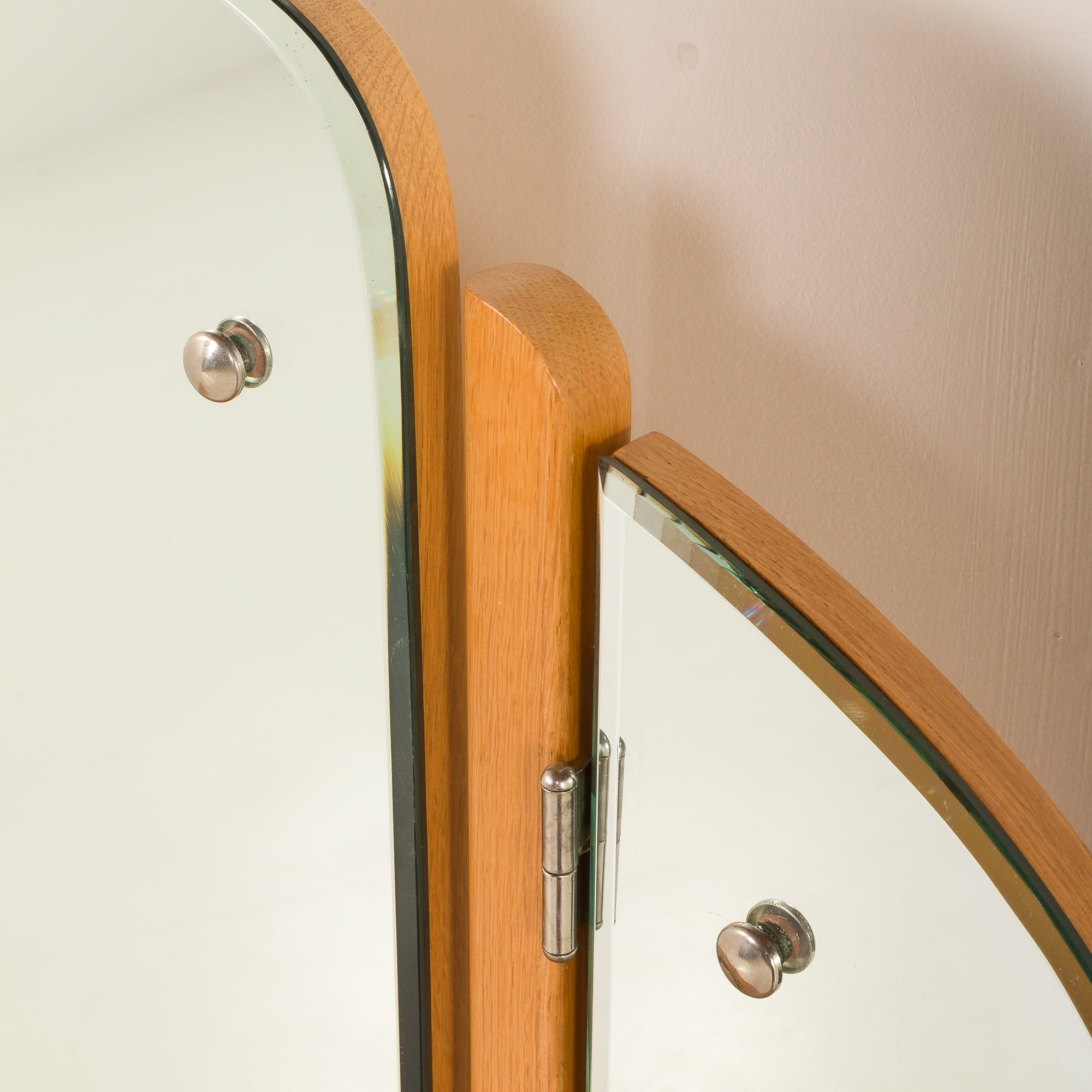 Elegancka skandynawska dębowa toaletka z połowy wieku stylem przypominająca projekty Henninga Kjaernulfa z lat 60-tych i 70-tych. Jednak niekoniecznie pochodzi z Dani. Toaletka ma centralną szufladę i dwie boczne szafki z opuszczanymi drzwiami, zapewniając funkcjonalną przestrzeń do przechowywania, a składane lustra zwiększają wygodę użytkowania. Toaletka vintage jest wykonana z litego dębu z pięknie rzeźbionymi uchwytami i stoi na litej podstawie. Nogi są odłączane, co ułatwia transport