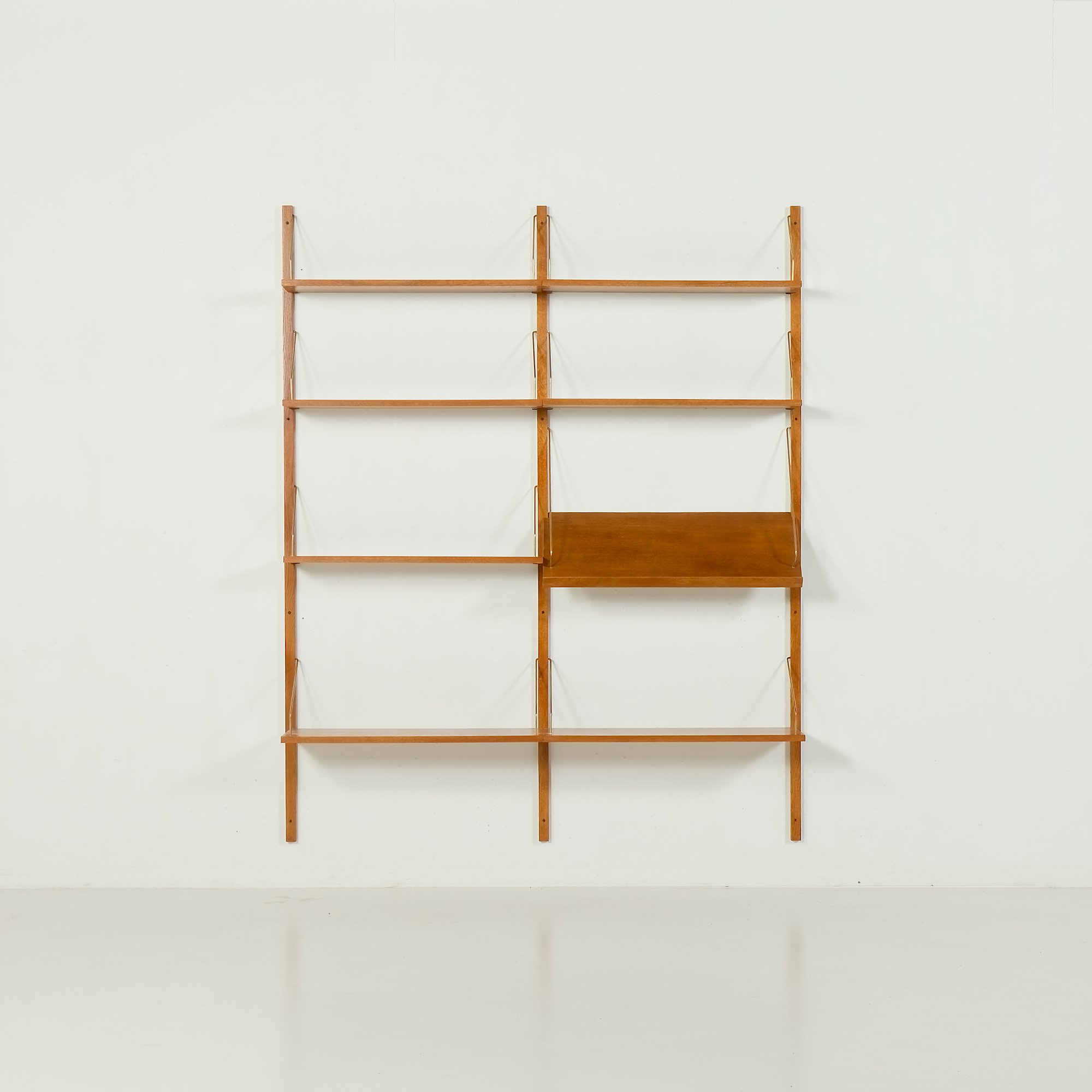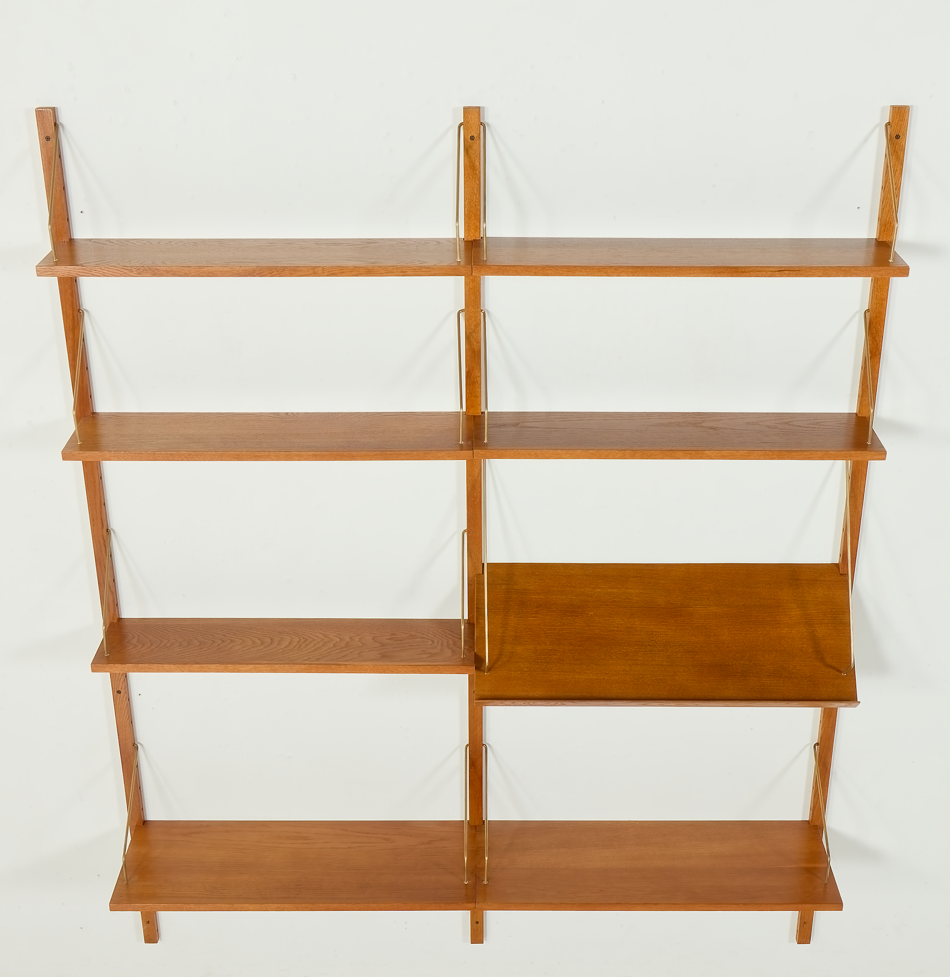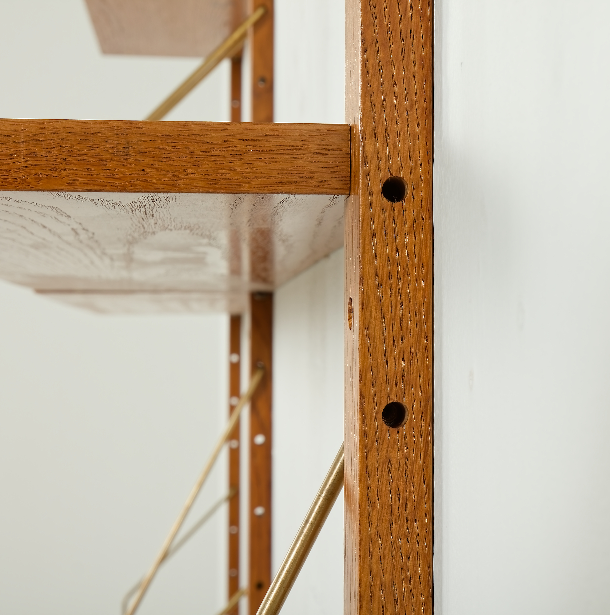 Ten skandynawski dębowy regał ścienny w stylu vintage został wyprodukowany w Danii w latach 70., w tym samym okresie co słynne meble Poula Cadoviusa. Posiada również bardzo podobne cechy, takie jak mosiężne zawieszki i regulowana wysokość półek. Mebel posiada siedem półek i jedną półkę ekspozycyjną.