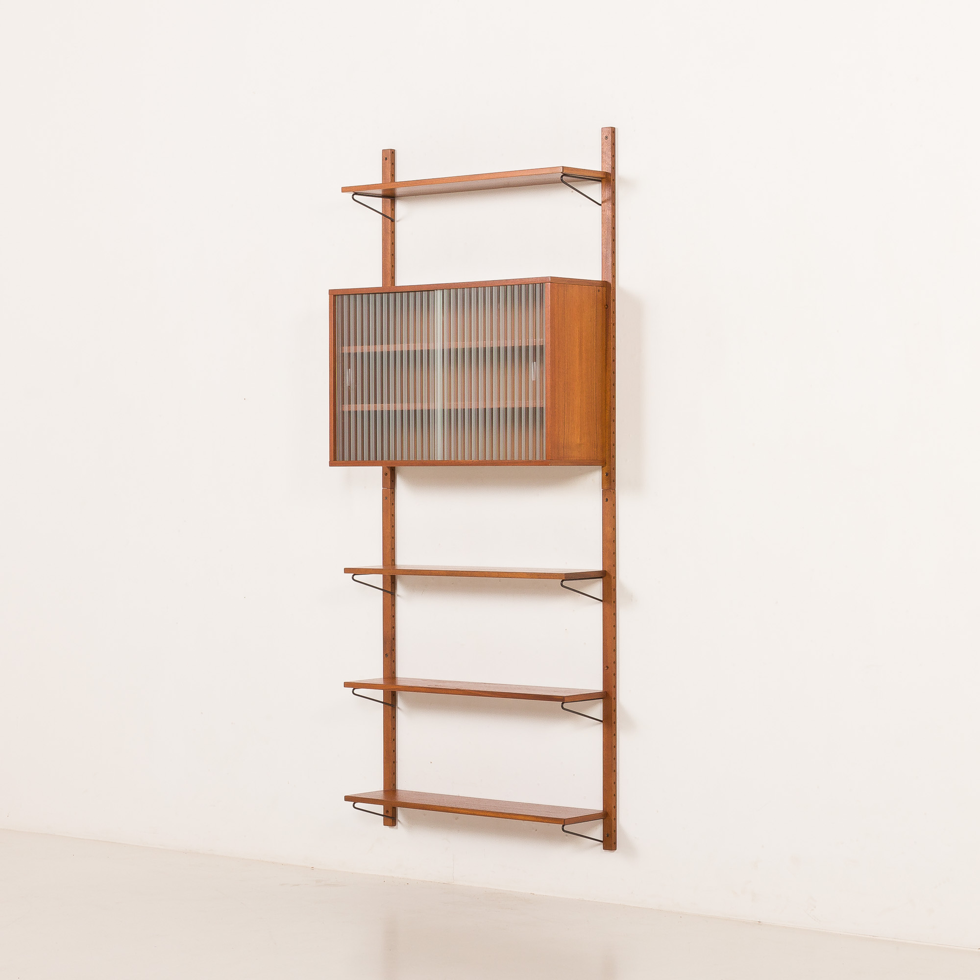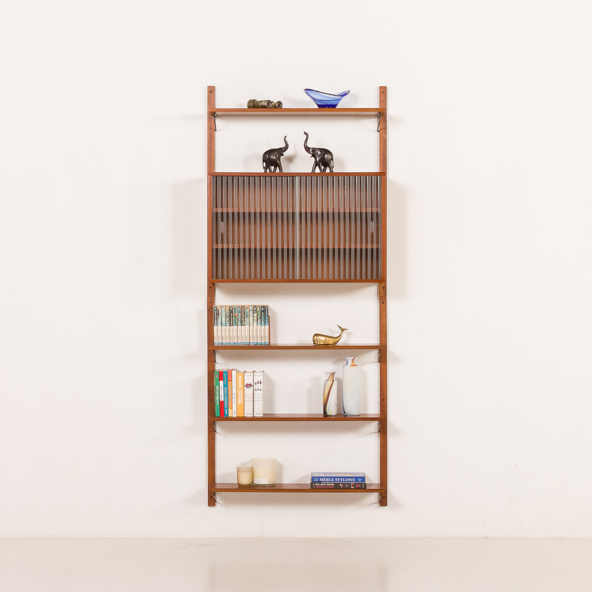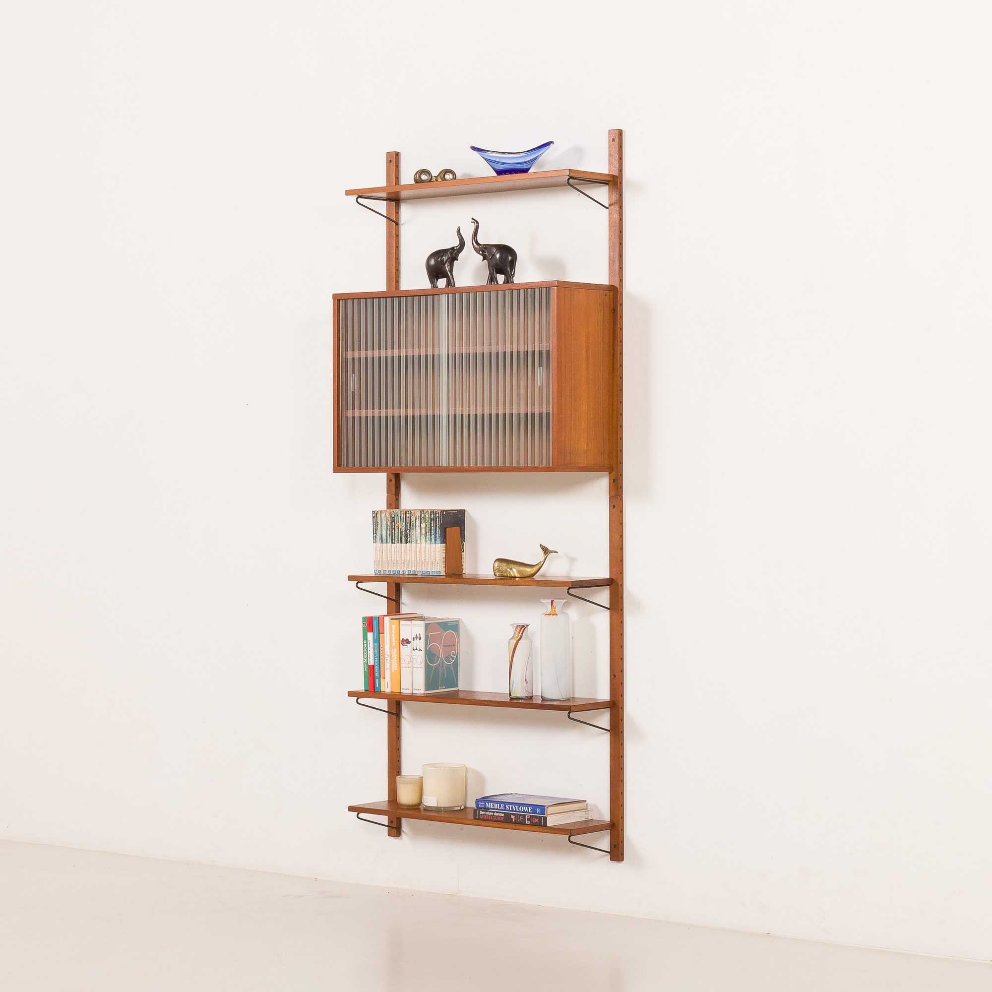 Ten skandynawski regał vintage z drewna tekowego został wyprodukowany w Danii w latach 60. Pochodzi z tego samego okresu i jest bardzo podobny do słynnych projektów Poula Cadoviusa. Składa się z czterech półek i witrynki.