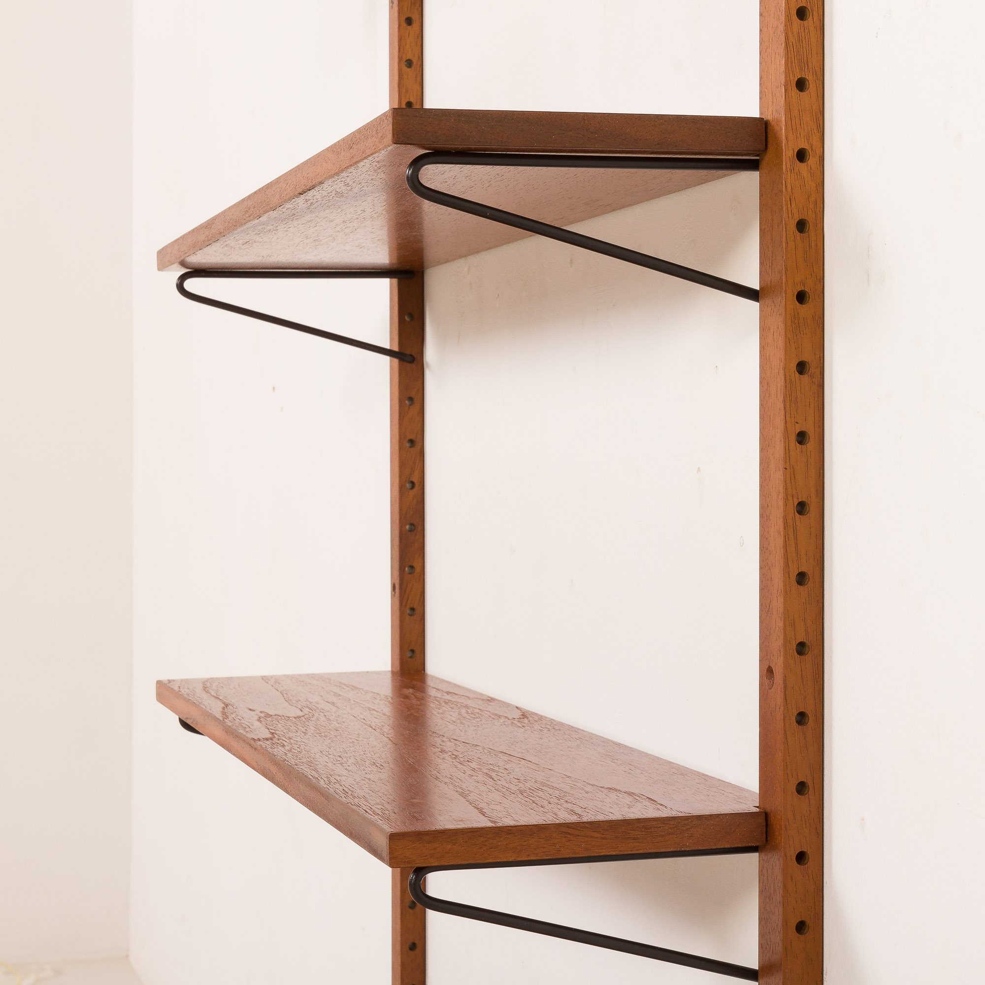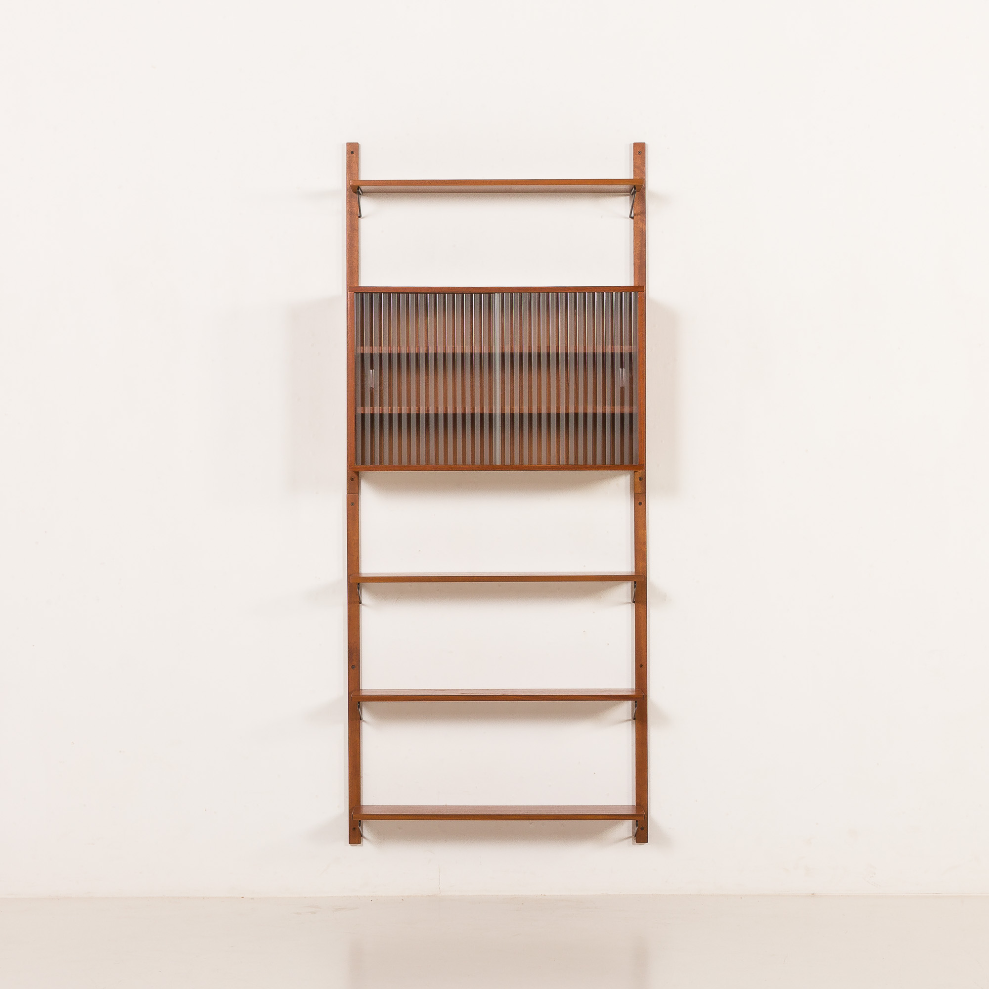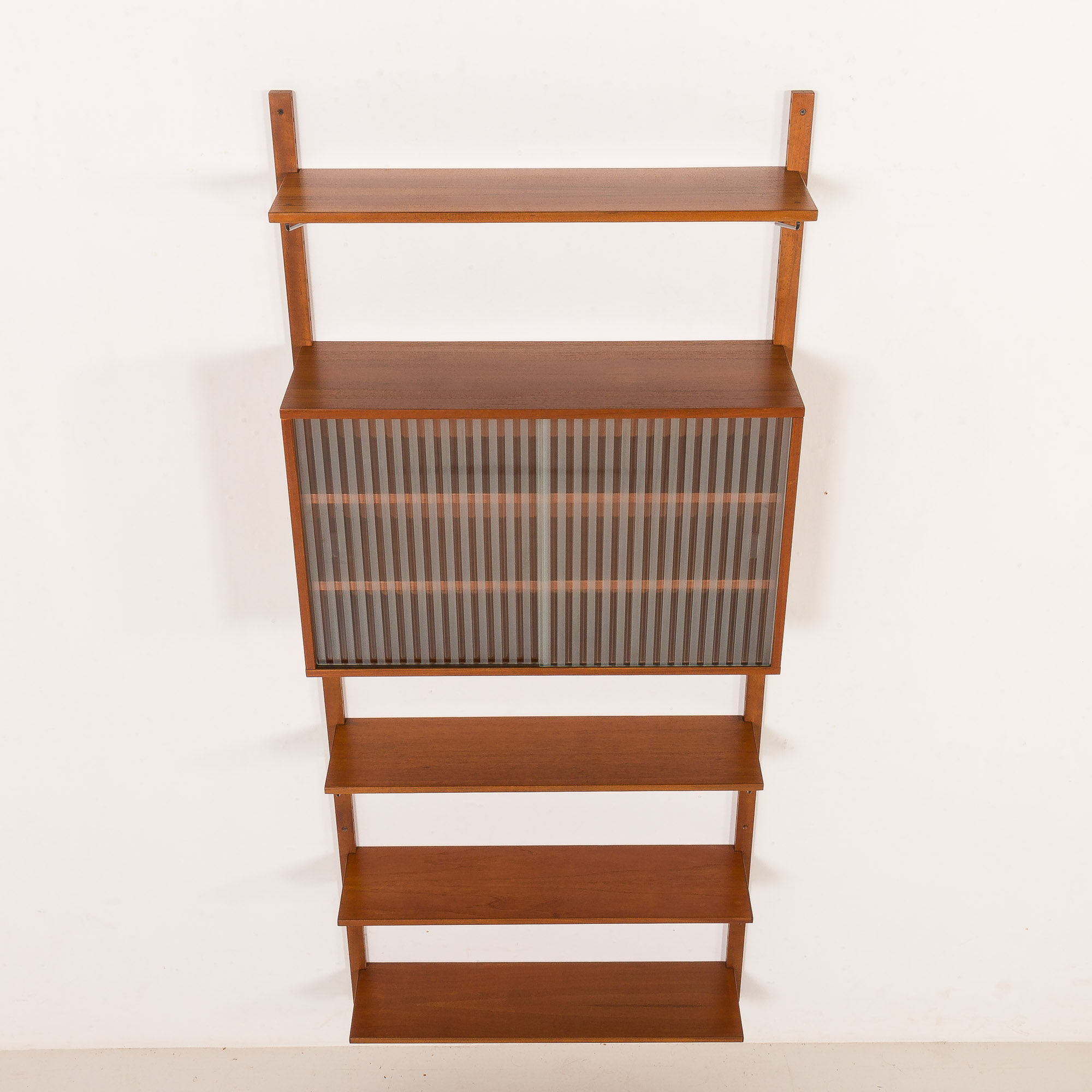 Ten skandynawski regał vintage z drewna tekowego został wyprodukowany w Danii w latach 60. Pochodzi z tego samego okresu i jest bardzo podobny do słynnych projektów Poula Cadoviusa. Składa się z czterech półek i witrynki.