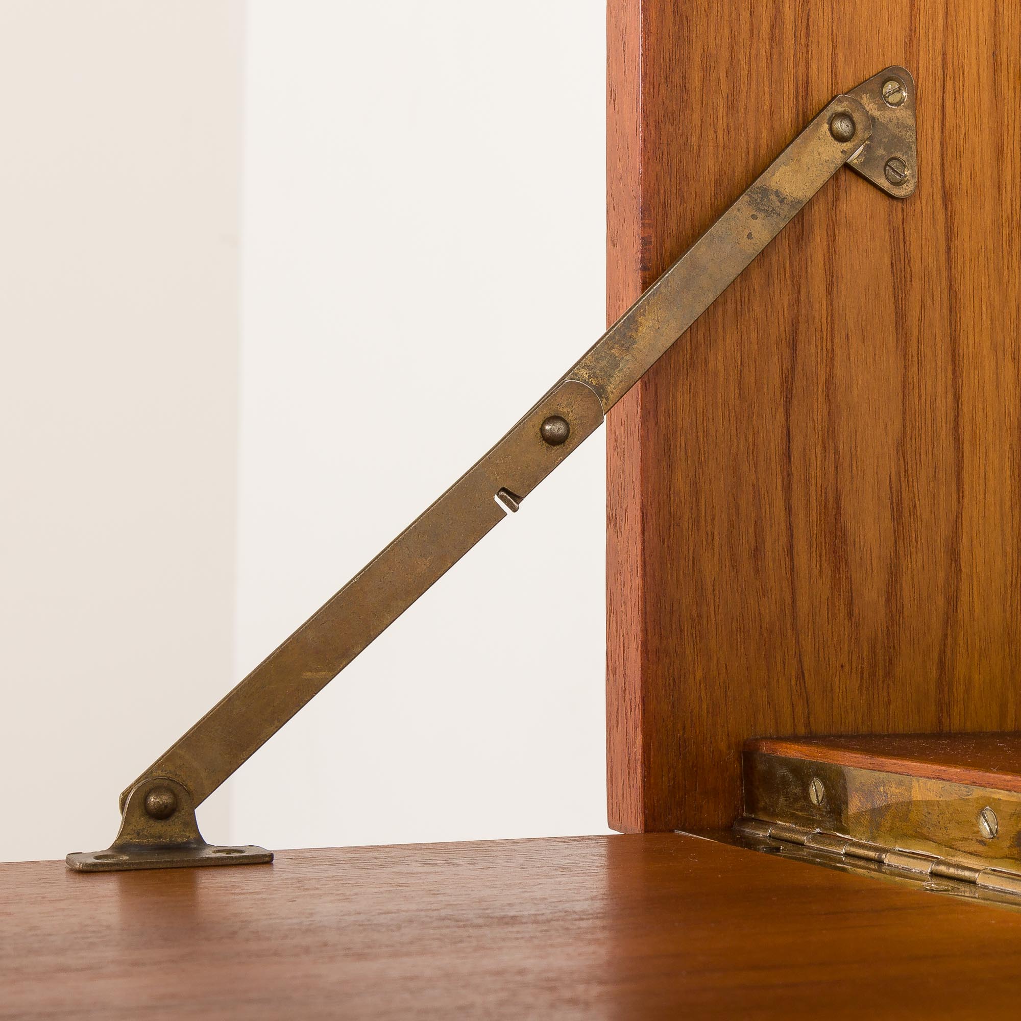 Skandynawski, tekowy regał wiszący do domowego gabinetu z sekretarzykiem pochodzi z lat 70. i zapewnia dyskretną przestrzeń do pracy i przechowywania. Bardzo przypomina meble Poula Cadoviusa z tego samego okresu. Idealny do salonu, sypialni lub gabinetu. To w pełni modułowy system. Wszystkie elementy mają 75 cm szerokości i można je dowolnie ustawiać, niżej lub wyżej.
