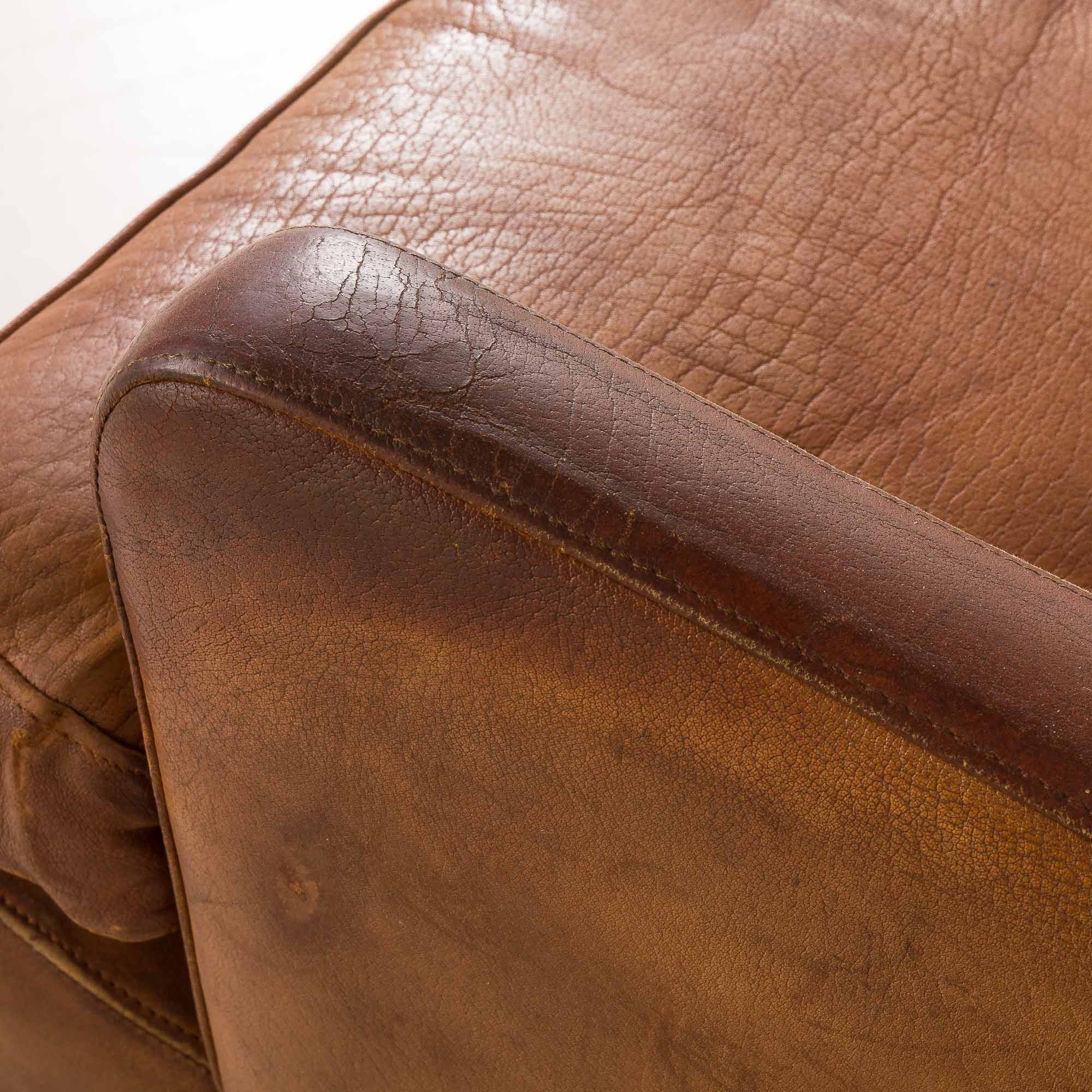 The armchair features a high, winged backrest with softly sculpted sides. The most interesting part is the leather. Full grain aniline buffalo leather with amazing patina. The letter has small cracks, discoloration. It is a perfect example of how the quality leather age and how durable and beautiful material it is. Combine with classic mid century form this armchair will become a statement piece in a living room, office, or reading corner. Perfect for loft interiors, or mountain chalet.