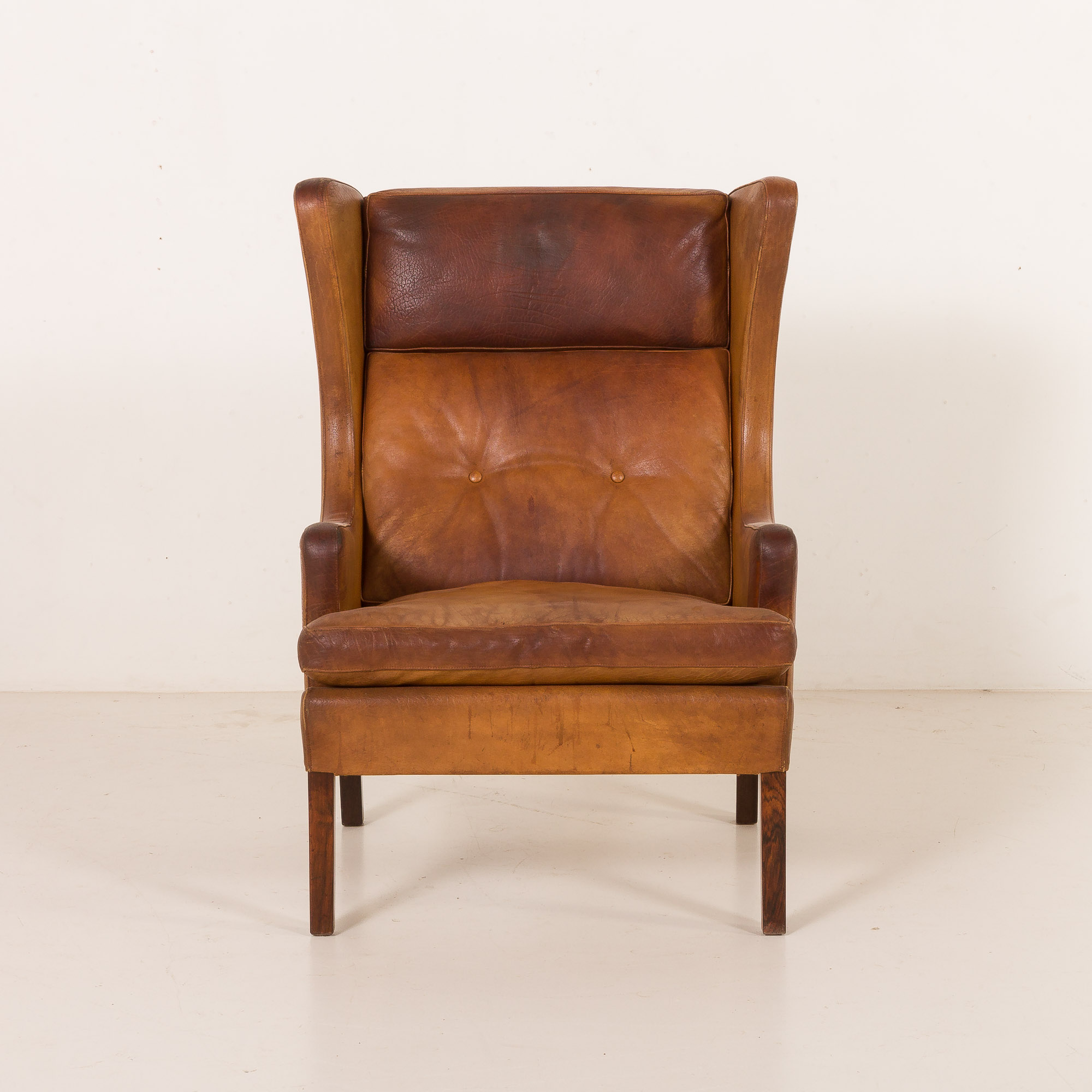 This Scandinavian vintage wingback armchair from the 1960s, upholstered in buffalo leather, by its design strictly remains Børge Mogensen’s iconic wingback armchairs from the same period.