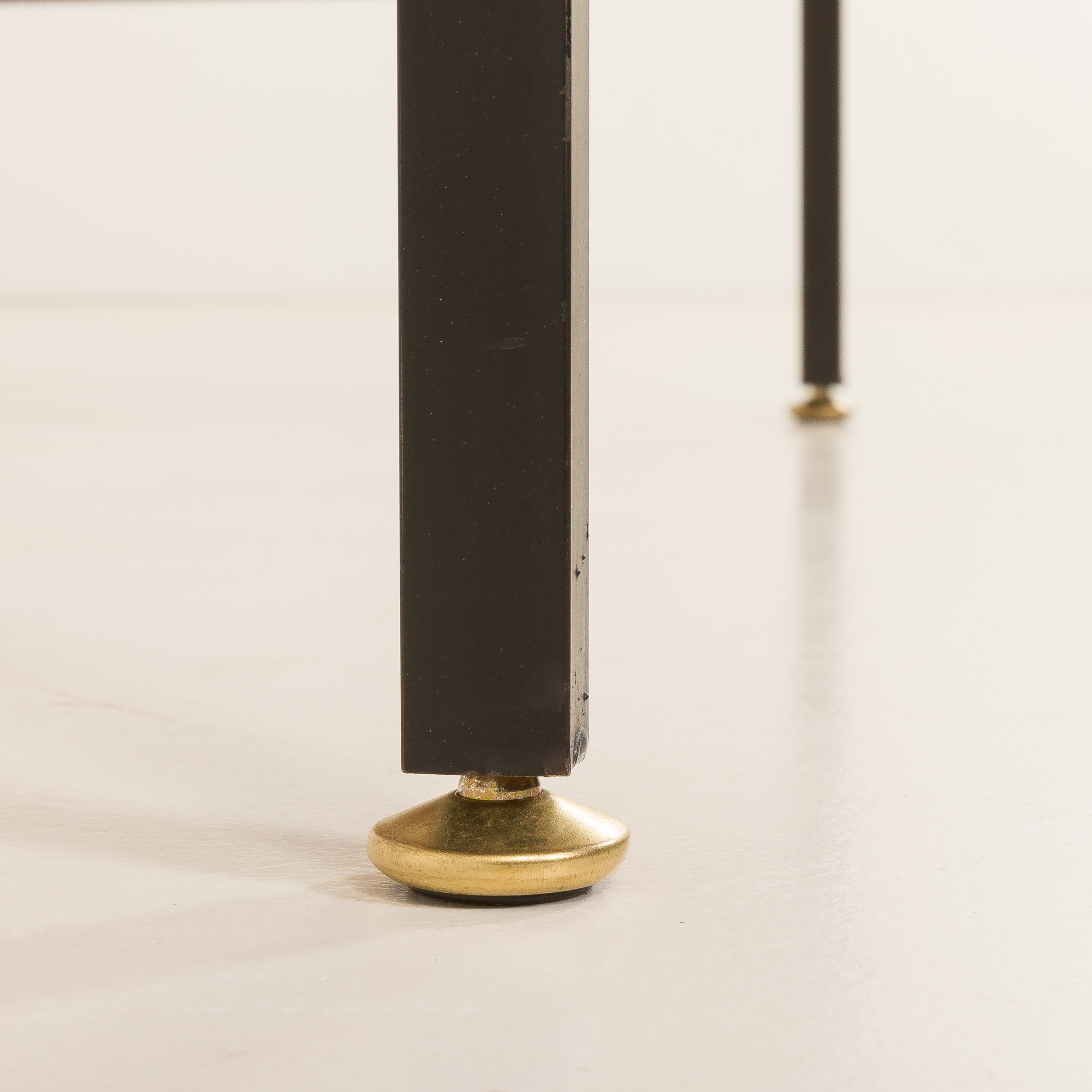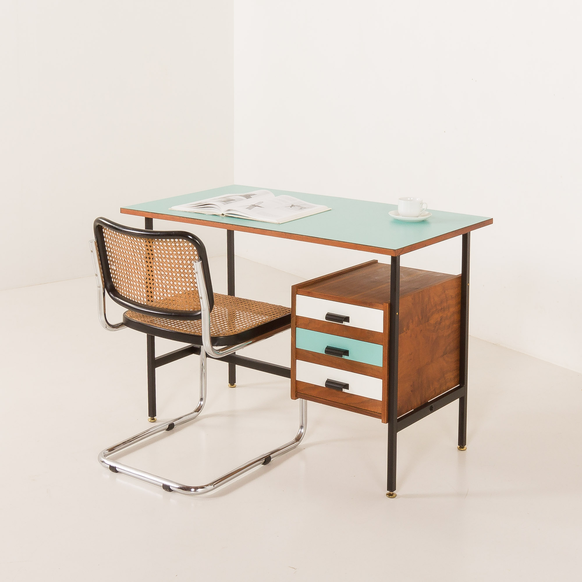 To eleganckie, małe włoskie biurko mid-century z lat 70. ucieleśnia wyrafinowaną i funkcjonalną estetykę typową dla tamtej epoki. Projekt łączy minimalistyczną, czarną, metalową ramę z grą kolorów i faktur laminowanych powierzchni oraz eleganckim fornirem orzechowym.