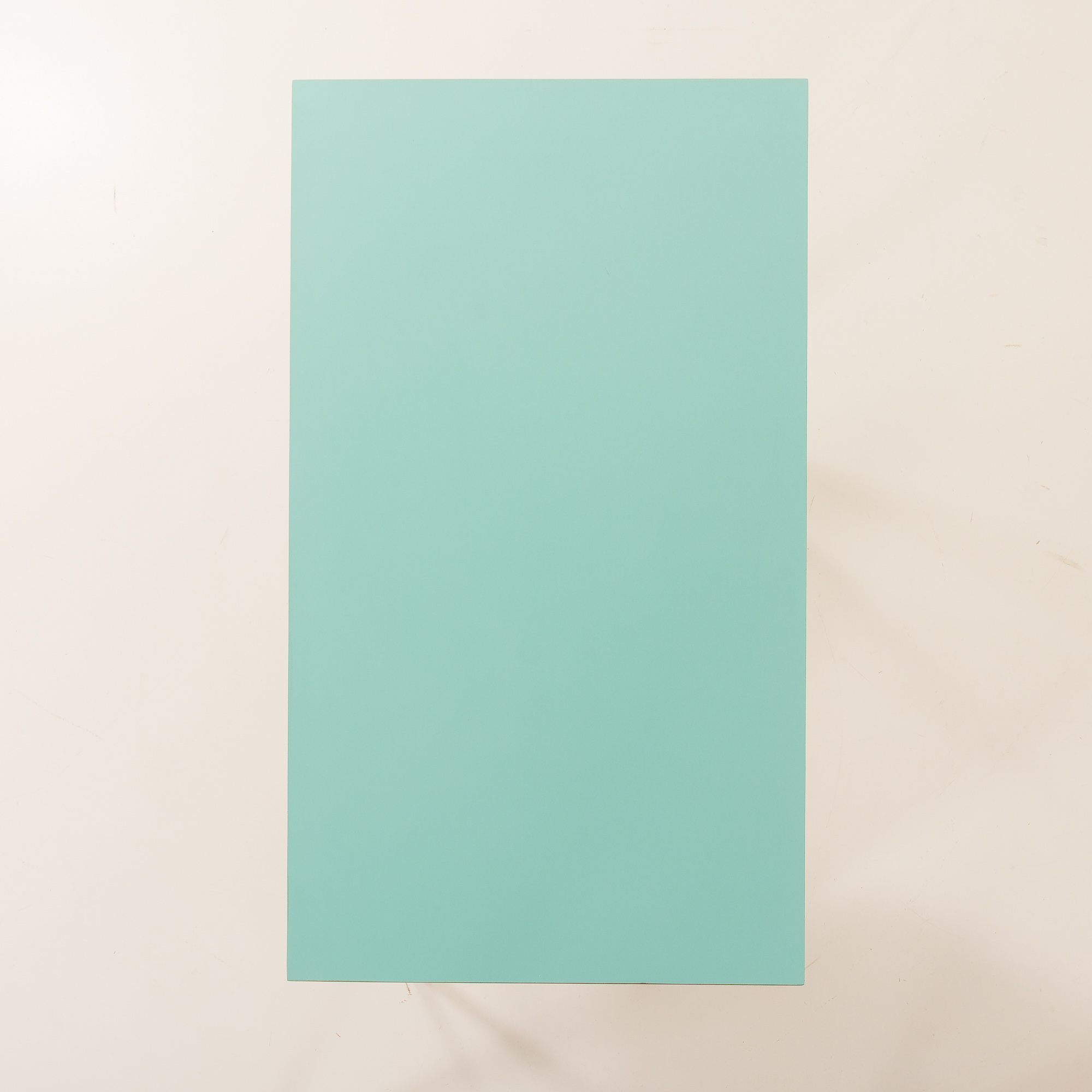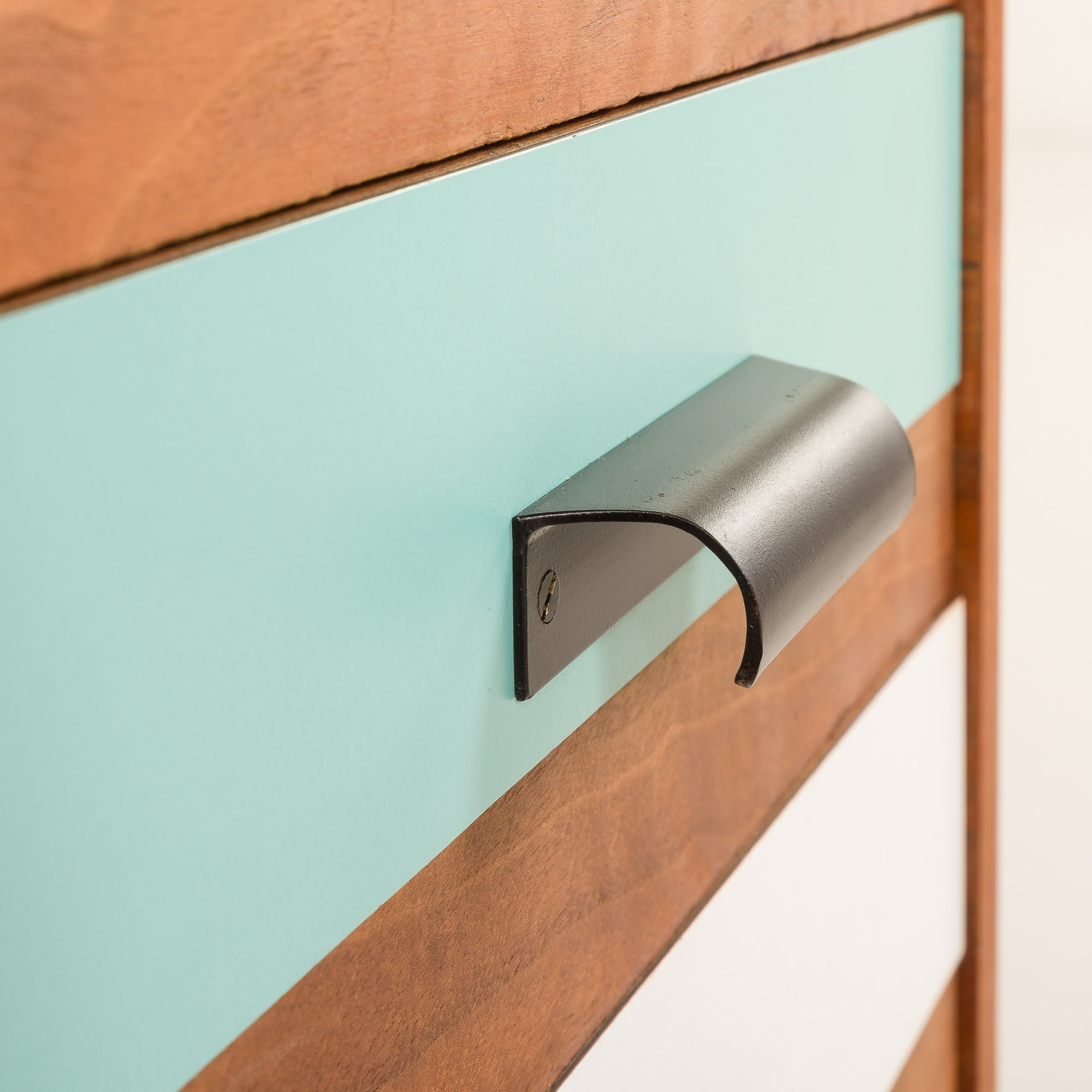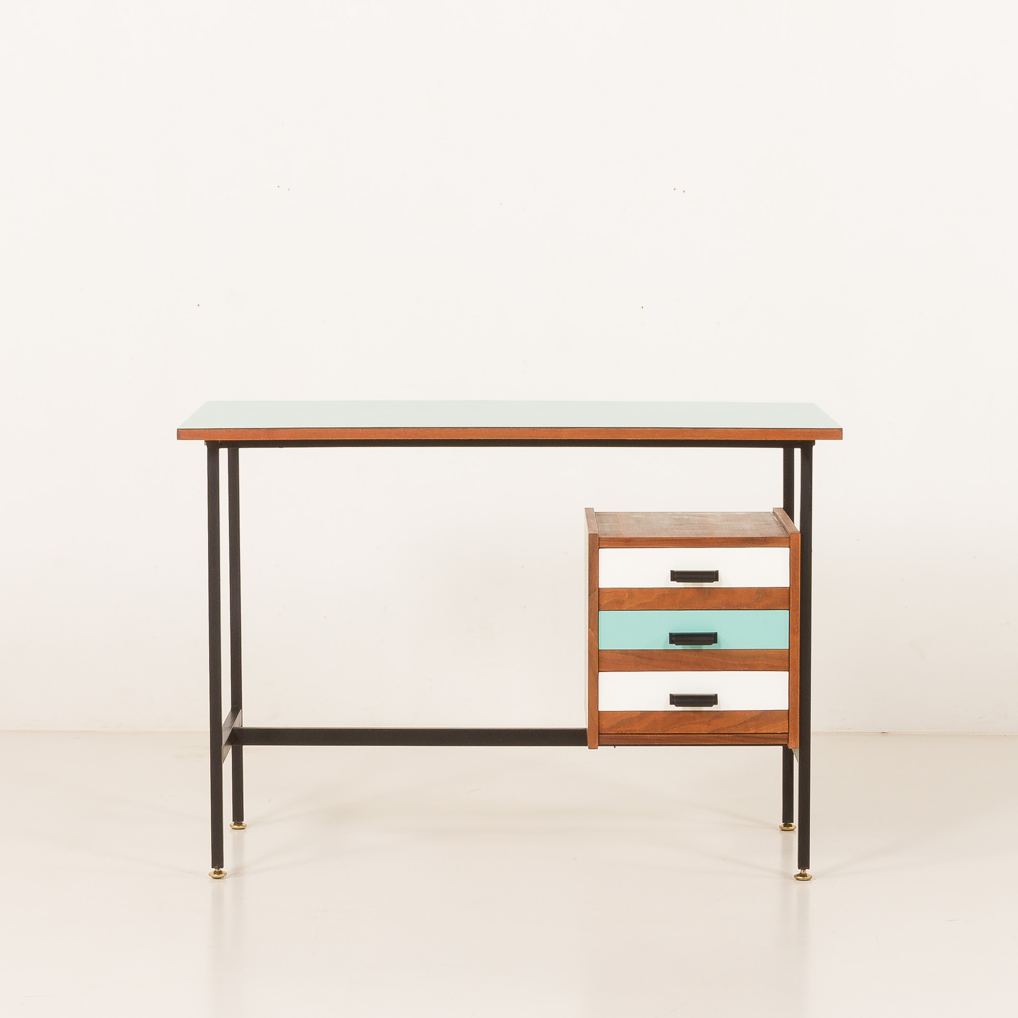 Prostokątny blat wykończony jest laminatem w kolorze jasnej akwamaryny, co tworzy świeży i wyrazisty kontrast. Trzy szuflady posiadają fronty w dwóch odcieniach – dwa w czystej bieli i jeden w kolorze akwamaryny – wszystkie wyposażone w smukłe, czarne, metalowe uchwyty, które podkreślają linearną i zrównoważoną kompozycję biurka. Mebel stoi na smukłych, metalowych nogach zakończonych delikatnymi, mosiężnymi stopkami, co dodaje subtelnej nuty wyrafinowania i uroku vintage.