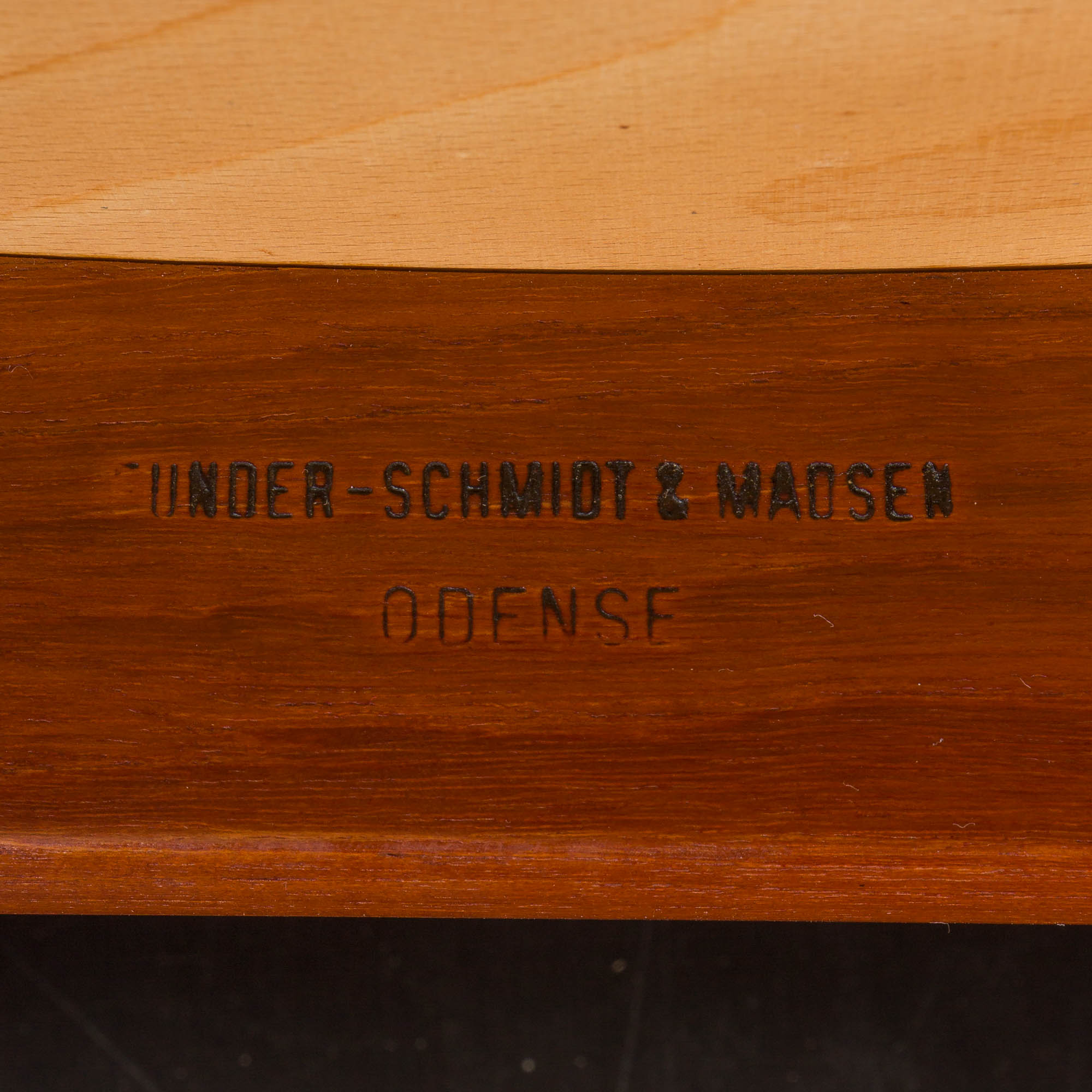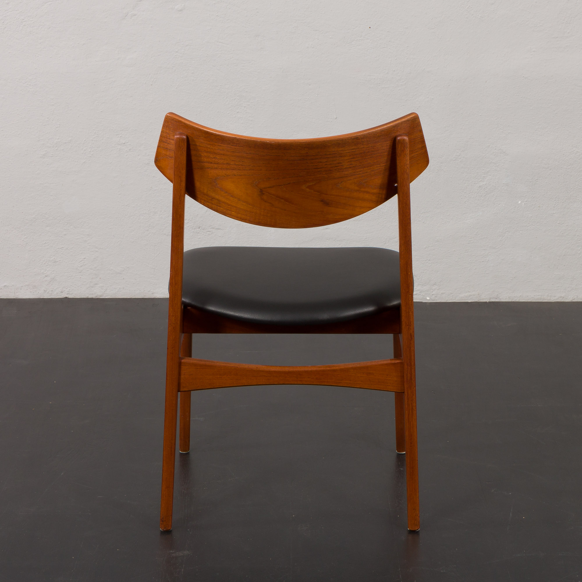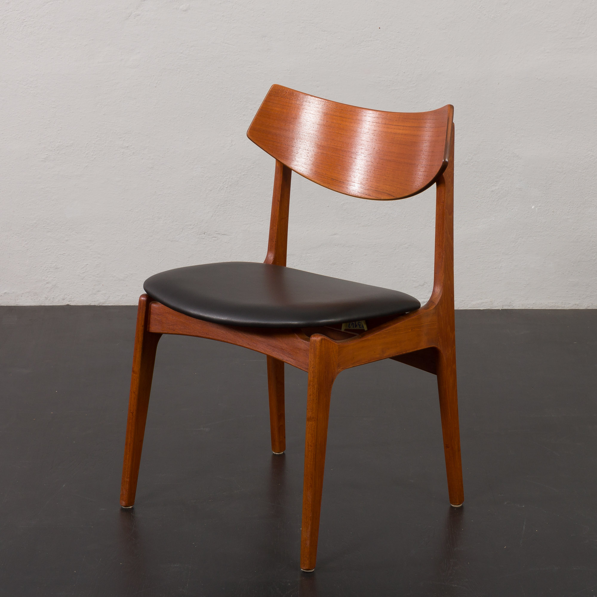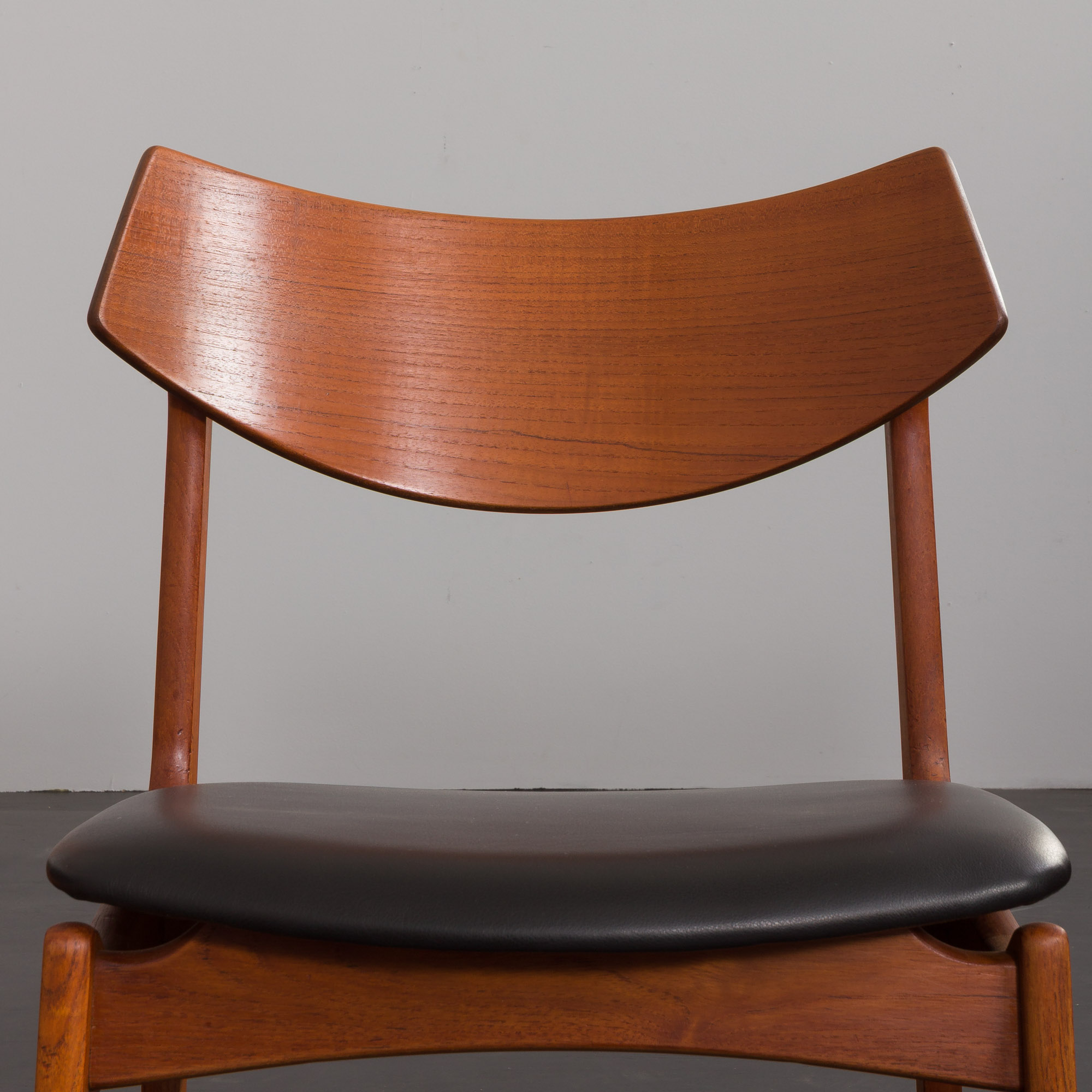 Fantastyczne krzesło do jadalni z okresu mid century modern zostało wyprodukowane przez firmę Funder-Schmidt & Madsen. Rama krzesła wykonana z litego drewna tekowego z oparciem efektownie profilowanym i fornirowanym drewnem tekowym z bogatym usłojeniem, a także nowa tapicerka z czarnej skóry anilinowej, skłądają się na modernistyczną formę lat 60. Krzesło to zachwyca kształtem i wygodą siedzenia.