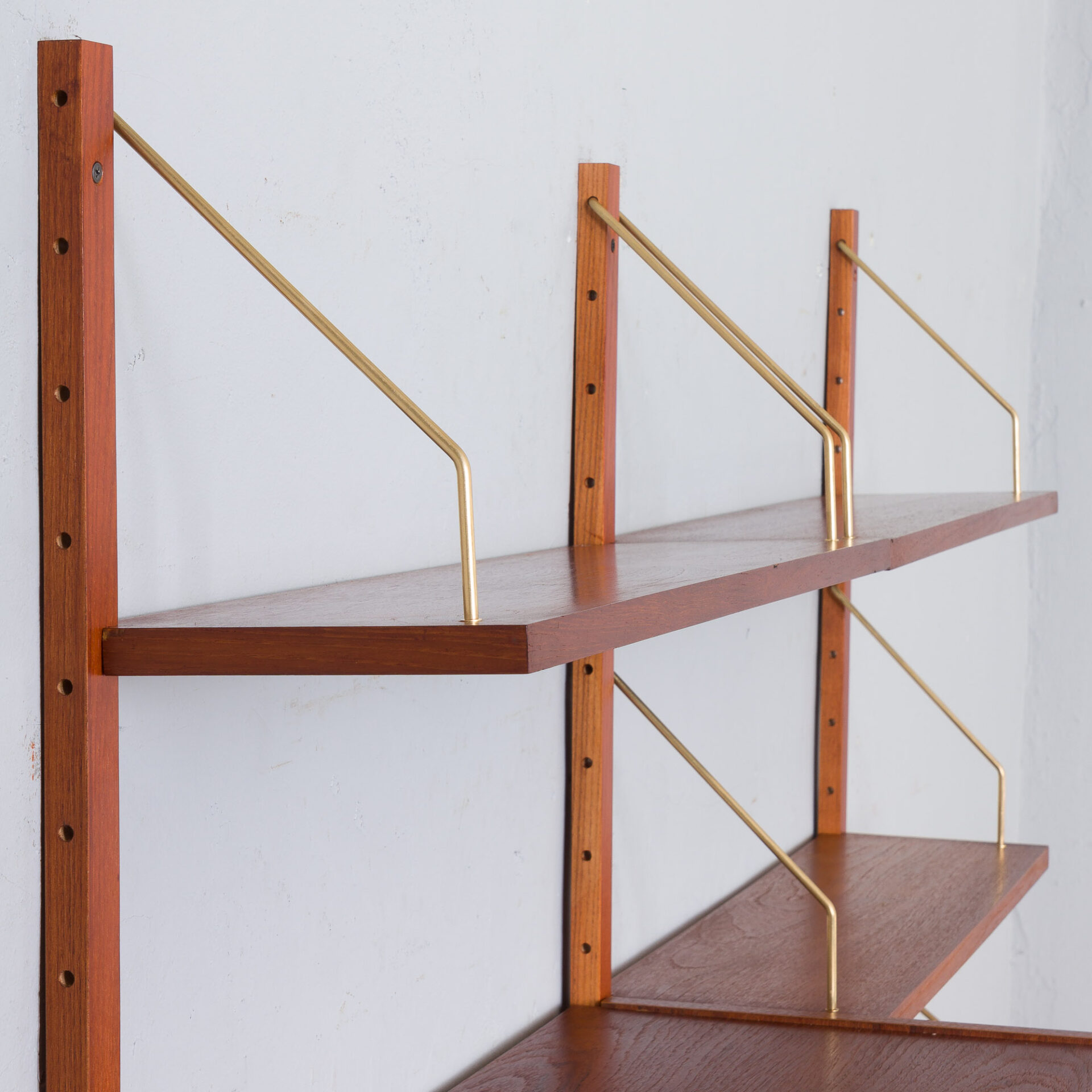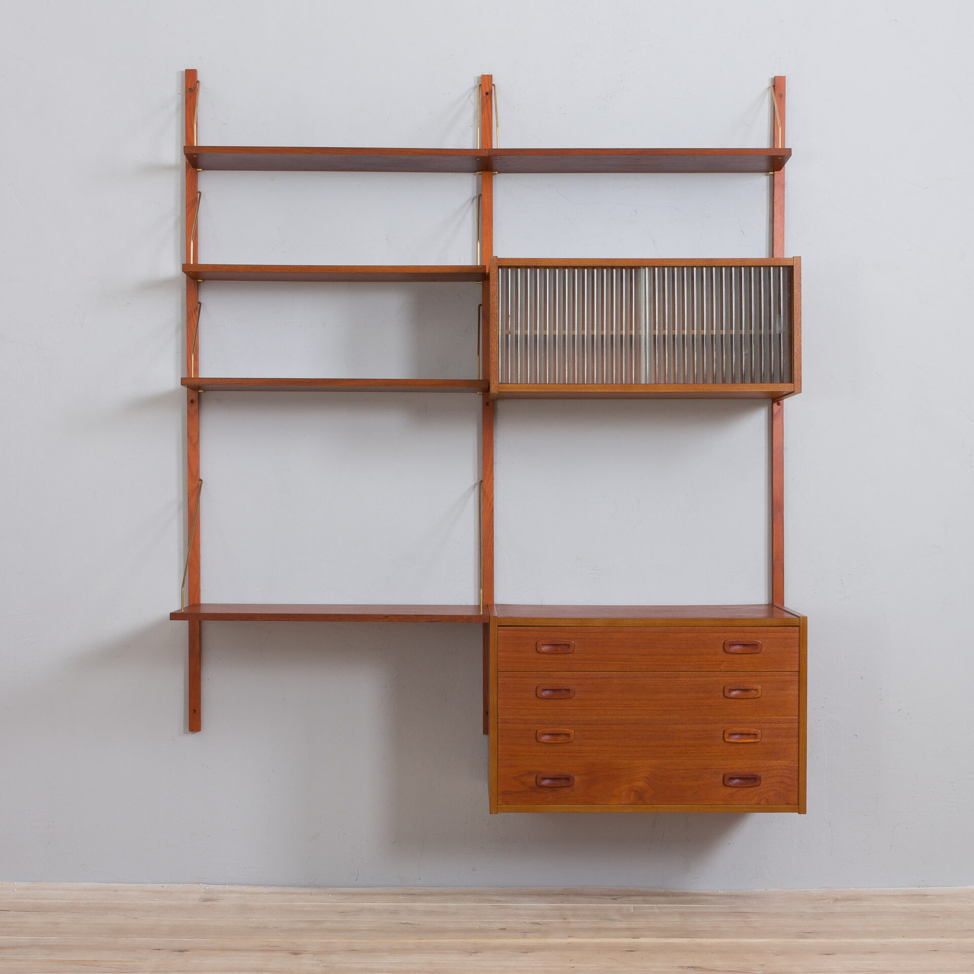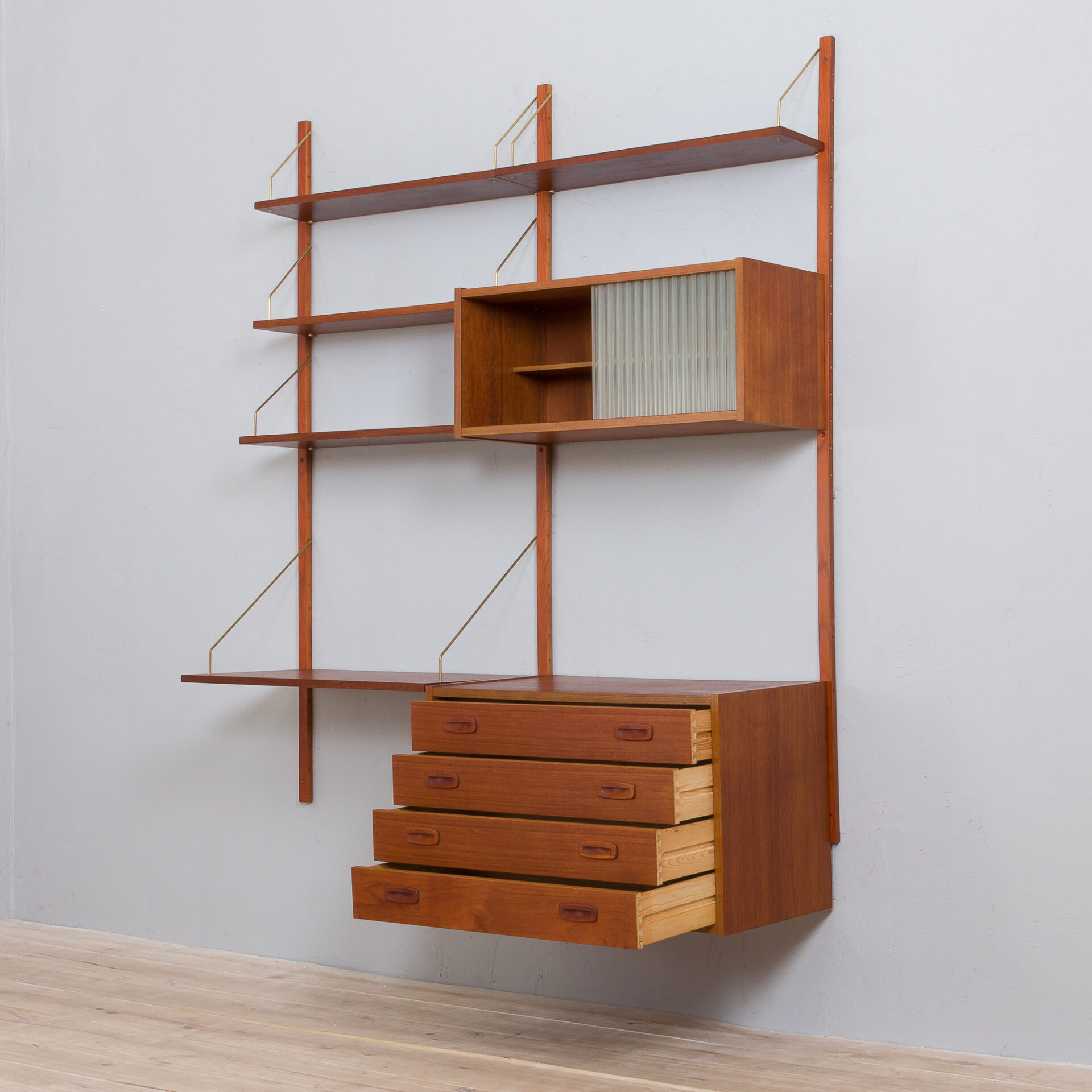 Dwusegmentowy regał ścienny z drewna tekowego zaprojektowany przez Prebena Sorensena w latach 60-tych. Ten całkowicie modułowy system jest idealny do domowego biura, ponieważ kompaktowe biurko pozwoli Ci pracować nawet w salonie. Każda sekcja ma 80 cm szerokości i można ją dowolnie aranżować.Zestaw składa się z: